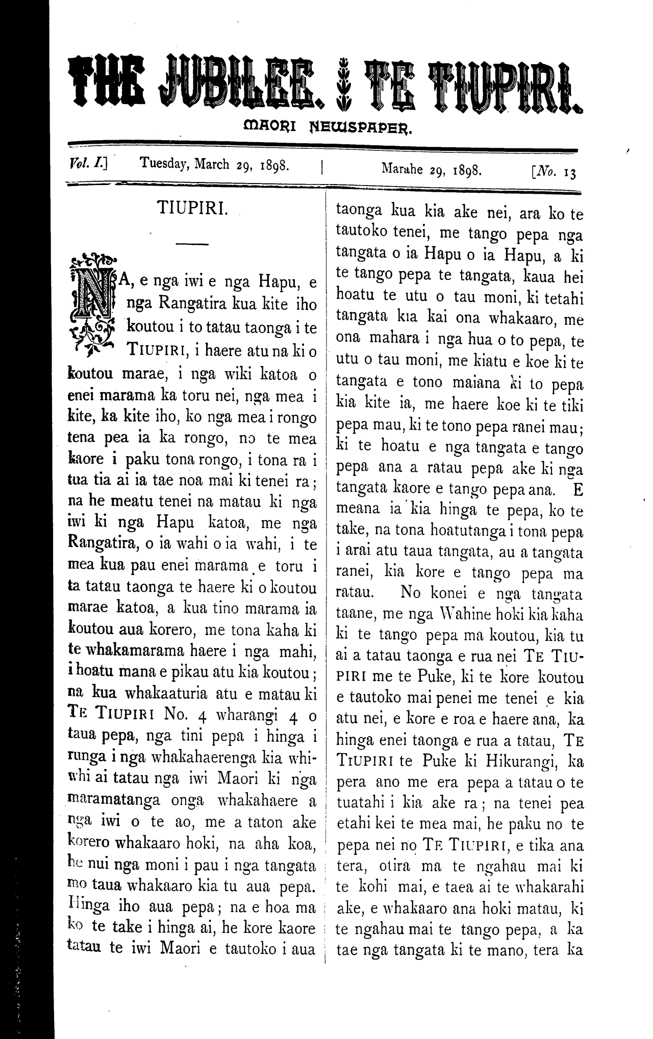 Te Tiupiri 1898-1900: Volume 1, Number 13. 29 March 1898 |