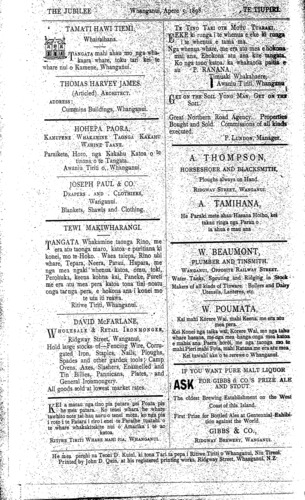 TEWI MAKIWHARANGI TANGATA Whakamine taonga Rino, me era atu taonga maro, katoa e puritiana ki konei, mo te Hoko. Waea taiepa, Rino uhi whare, Tepara, Neera, Parau, Hapara, me nga mea, ngaki whenua katoa omu, toki, Perohuka, keena. kohua kai, Paneke, Pureiti me era atu mea pera katoa tona tini noatu onga taenga pera, e hokona ana i konei mo te utu iti reawa. Ritiwe Tiriti, Whanganui.