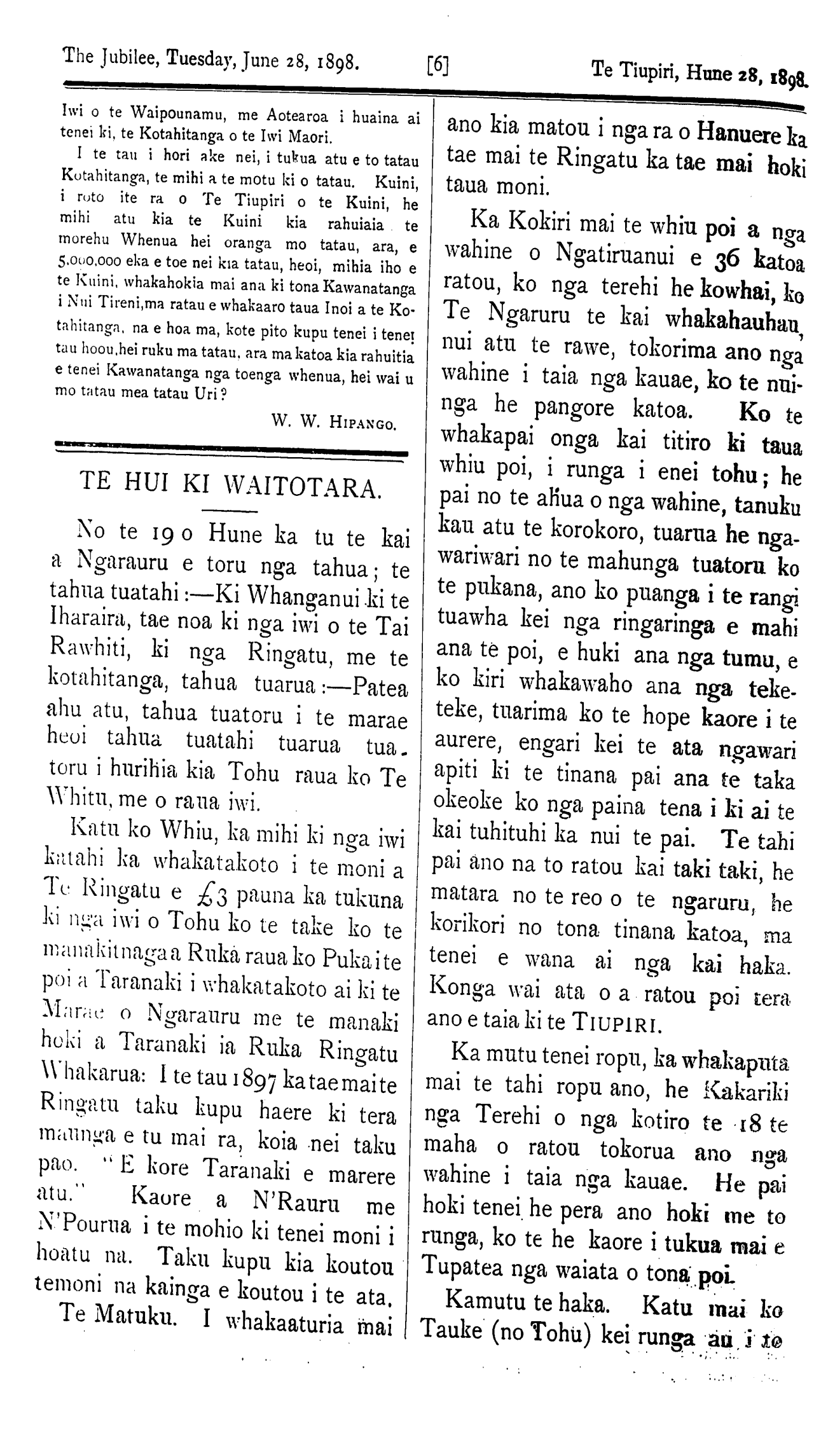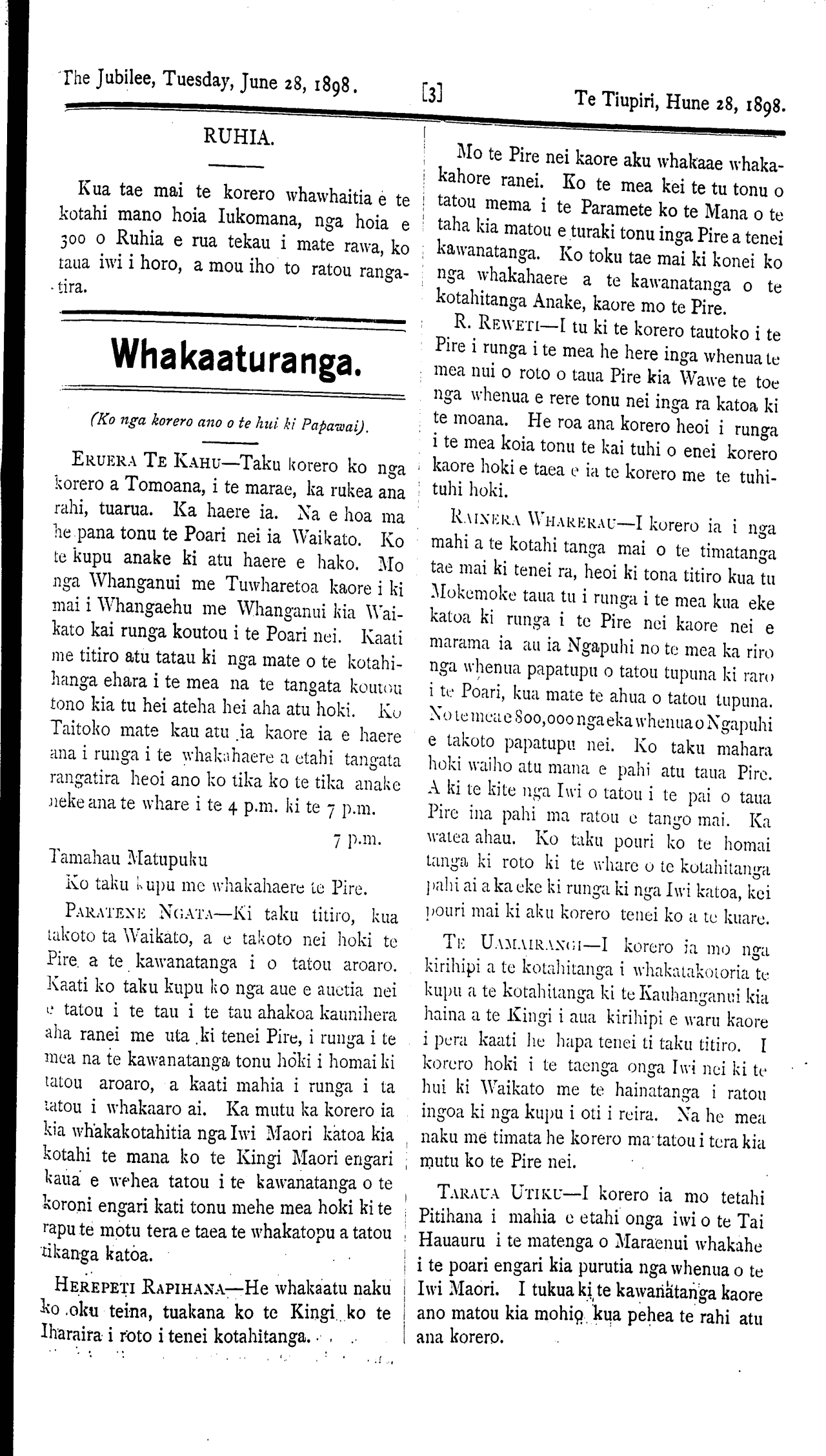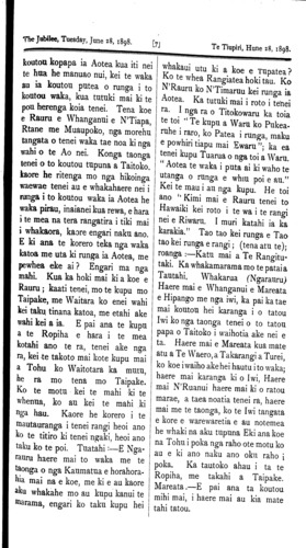 The Jubilee, Tuesday, June 28, 1898. [7] Te Tiupiri Hune 28, 1898. koutou kopapa ia Aotea kua iti nei te hua he manuao nui, kei te waka au ia koutou putea o runga i to koutou waka, kua tutuki mai ki te pou herenga koia tenei. Tena koe e Rauru e Whanganui e N'Tiapa, Rtane me Muaupoko, nga morehu tangata o tenei waka tae noa ki nga wahi o te Ao nei. Konga taonga tenei o to koutou tupuna a Taitoko, kaore he ritenga mo nga hikoinga waewae tenei au e whakahaere nei i runga i to koutou waka ia Aotea he waka pirau, inaianei kua rewa, e hara i te mea na tera rangatira i tiki mai i whakaora, kaore engari naku ano. E ki ana te korero teka nga waka katoa me uta ki runga ia Aotea, me pewhea eke ai ? Engari ma nga mahi. Kua ka hoki mai ki a koe e Rauru; kaati tenei, mo te kupu mo Taipake, me Waitara ko enei wahi kei taku tinana katoa, me etahi ake wahi kei a ia. E pai ana te kupu a te Ropiha e hara i te mea kotahi ano te ra, tenei ake nga ra, kei te takoto mai kote kupu mai a Tohu ko Waitotara ka mutu, I he ra mo tena mo Taipake. I Ko te motu kei te mahi ki te I whenua, ko au kei te mahi ki I nga hau. Kaore he korero i te I mautauranga i tenei rangi heoi ano I ko te titiro ki tenei ngaki, heoi ano I taku ko te poi. Tuatahi: —E Nga- I rauru haere mai to waka me te I taonga o nga Kaumatua e horahora- I hia mai na e koe, me ki e au kaore I aku whakahe mo au kupu kanui te I marama, engari ko taku kupu hei whakaui utu ki a koe e Tupatea? Ko te whea Rangiatea hoki tau. Ko N'Rauru ko N'Timaruu kei runga ia Aotea. Ka tutuki mai i roto i tenei ra. I nga ra o Titokowaru ka toia te toi " Te kupu a Waru ko Pukea- ruhe i raro, ko Patea i runga, maku e powhiri tiapu mai Ewaru "; ka ea tenei kupu Tuarua o nga toi a Waru. " Aotea te waka i puta ai ki waho te utanga o runga e whiu poi e au. " Kei te mau i au nga kupu. He toi ano " Kimi mai e Rauru tenei to Hawaiki kei roto i te wa i te rangi nei e Riwaru. I muri katahi ia ka karakia. " Tao tao kei runga e Tao tao kei runga e rangi; (tena atu te); roanga: —Katu mai a Te Rangitu- taki. Ka whakamarama mo te patai a Tautahi, Whakarua (Ngarauru) Haere mai e Whanganui e Mareata e Hipango me nga iwi, ka pai ka tae mai koutou hei karanga i o tatou Iwi ko nga taonga tenei o to tatou papa o Taitoko i waihotia ake nei e ta. Haere mai e Mareata kua mate atu a Te Waero, a Takarangi a Turei, ko koe i waiho ake hei hautu i to waka; haere mai karanga ki o Iwi, Haere mai N'Ruanui haere mai ki o ratou marae, a taea noatia tenei ra, haere mai me te taonga, ko te Iwi tangata e kore e warewaretia e au notemea he whaki na aku tupuna Eki ana koe na Tohu i poka nga raho ote motu ko au e ki ano naku ano oku raho i poka. Ka tautoko ahau i ta te Ropiha, me takahi a Taipake. Mareata. —E pai ana ta koutou mihi mai, i haere mai au kia mate tahi tatou.