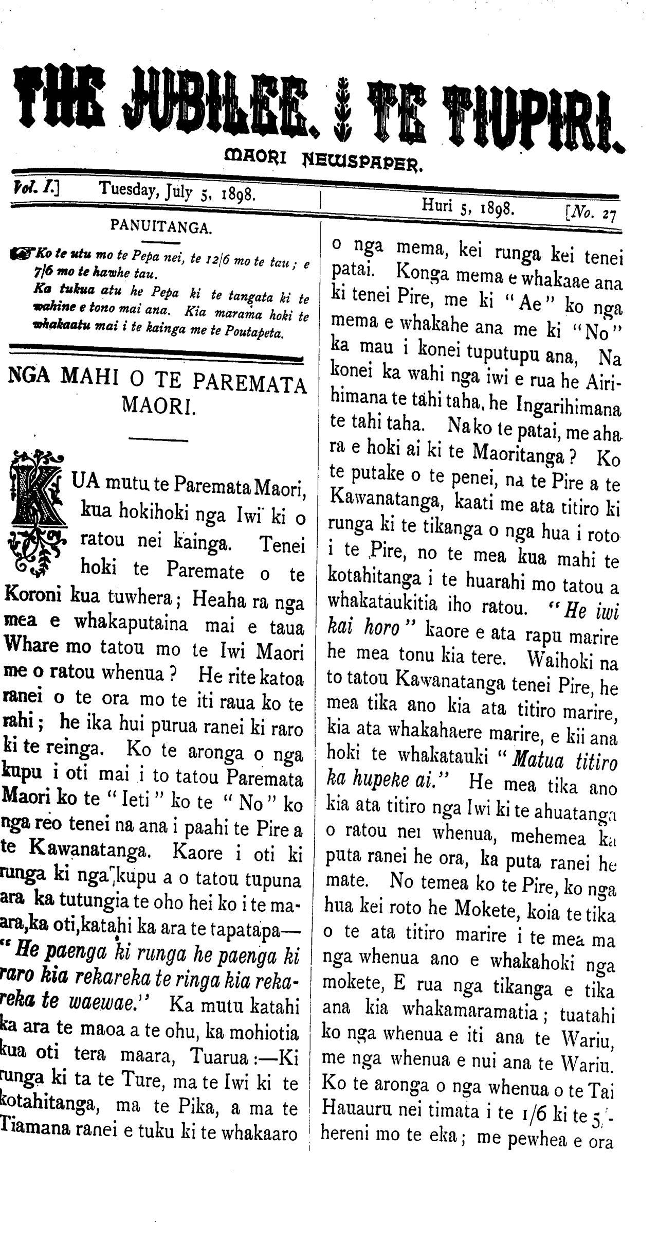 Te Tiupiri 1898-1900: Volume 1, Number 27. 05 July 1898 |