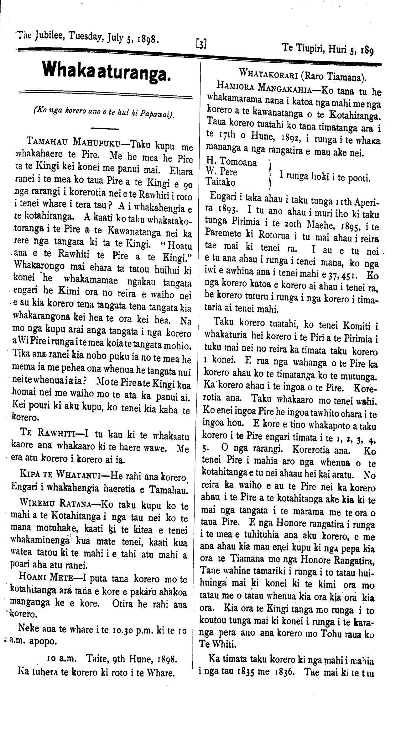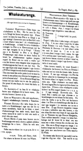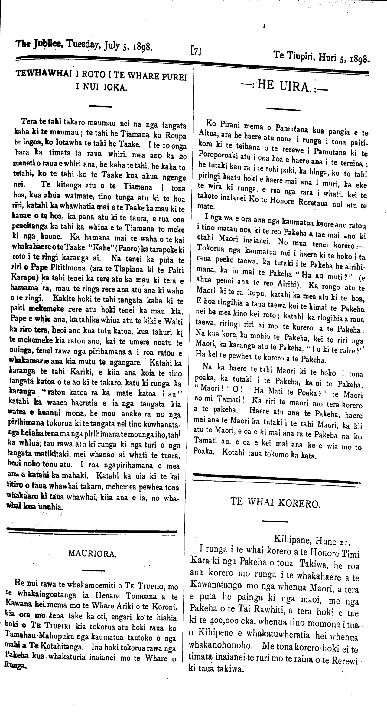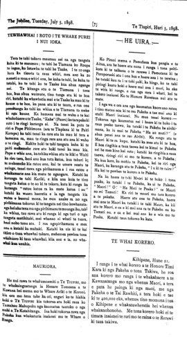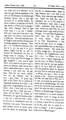The Jubilee, Tuesday, July 5, 1898. TE WHAI KORERO. Kihipane, Hune 21. I runga i te whai korero a te Honore Timi Kara ki nga Pakeha o tona Takiwa, he roa ana korero mo runga i te whakahaere a te Kawanatanga mo nga whenua Maori, a tera e puta he painga ki nga maoi, me nga Pakeha o te Tai Rawhiti, a tera hoki e tae ki te 400,000 eka, whenua tino momona i tua, o Kihipene e whakatuwheratia hei whenua whakanohonoho. Me tona korero hoki ei te timata inaianei te ruri mo te raina o te Rerewi ki taua takiwa.