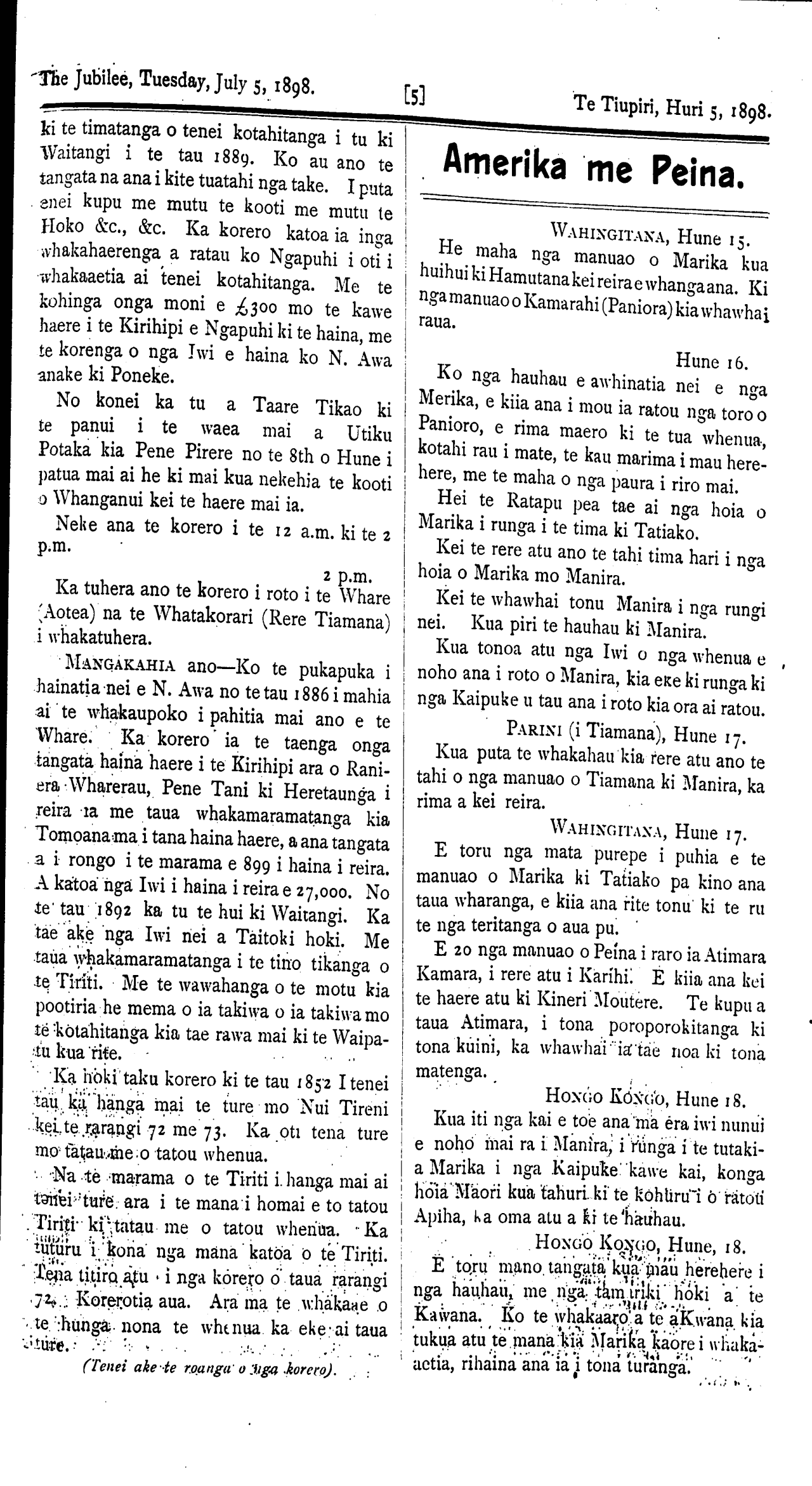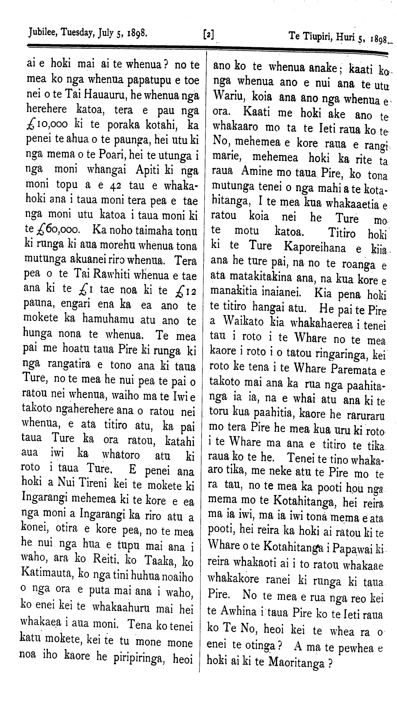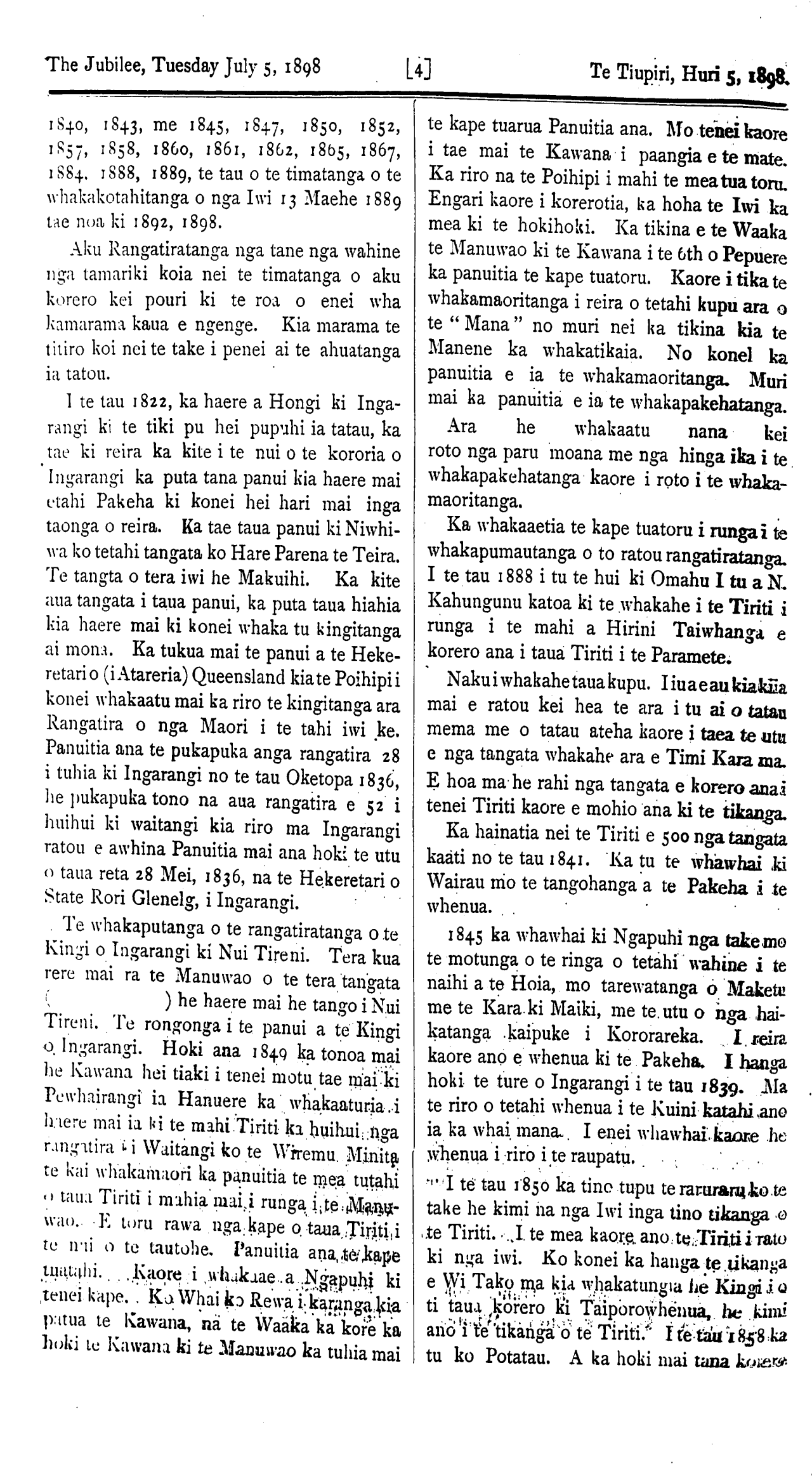 The Jubilee, Tuesday, July 5, 1898. TE WHAI KORERO. Kihipane, Hune 21. I runga i te whai korero a te Honore Timi Kara ki nga Pakeha o tona Takiwa, he roa ana korero mo runga i te whakahaere a te Kawanatanga mo nga whenua Maori, a tera e puta he painga ki nga maoi, me nga Pakeha o te Tai Rawhiti, a tera hoki e tae ki te 400,000 eka, whenua tino momona i tua, o Kihipene e whakatuwheratia hei whenua whakanohonoho. Me tona korero hoki ei te timata inaianei te ruri mo te raina o te Rerewi ki taua takiwa.