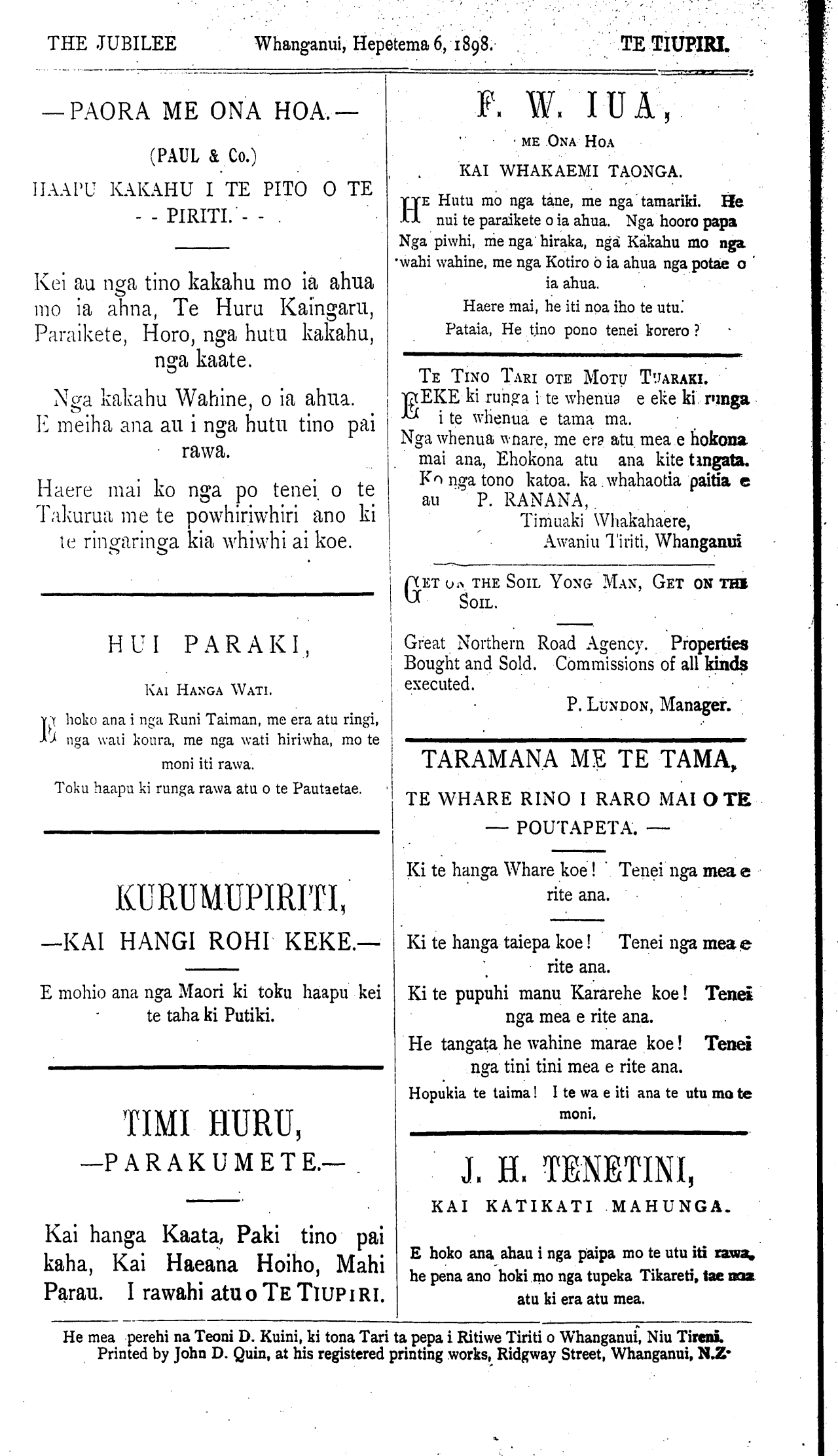 THE JUBILEE Whanganui, Hepetema 6, 1898. TE TIUPIRI.