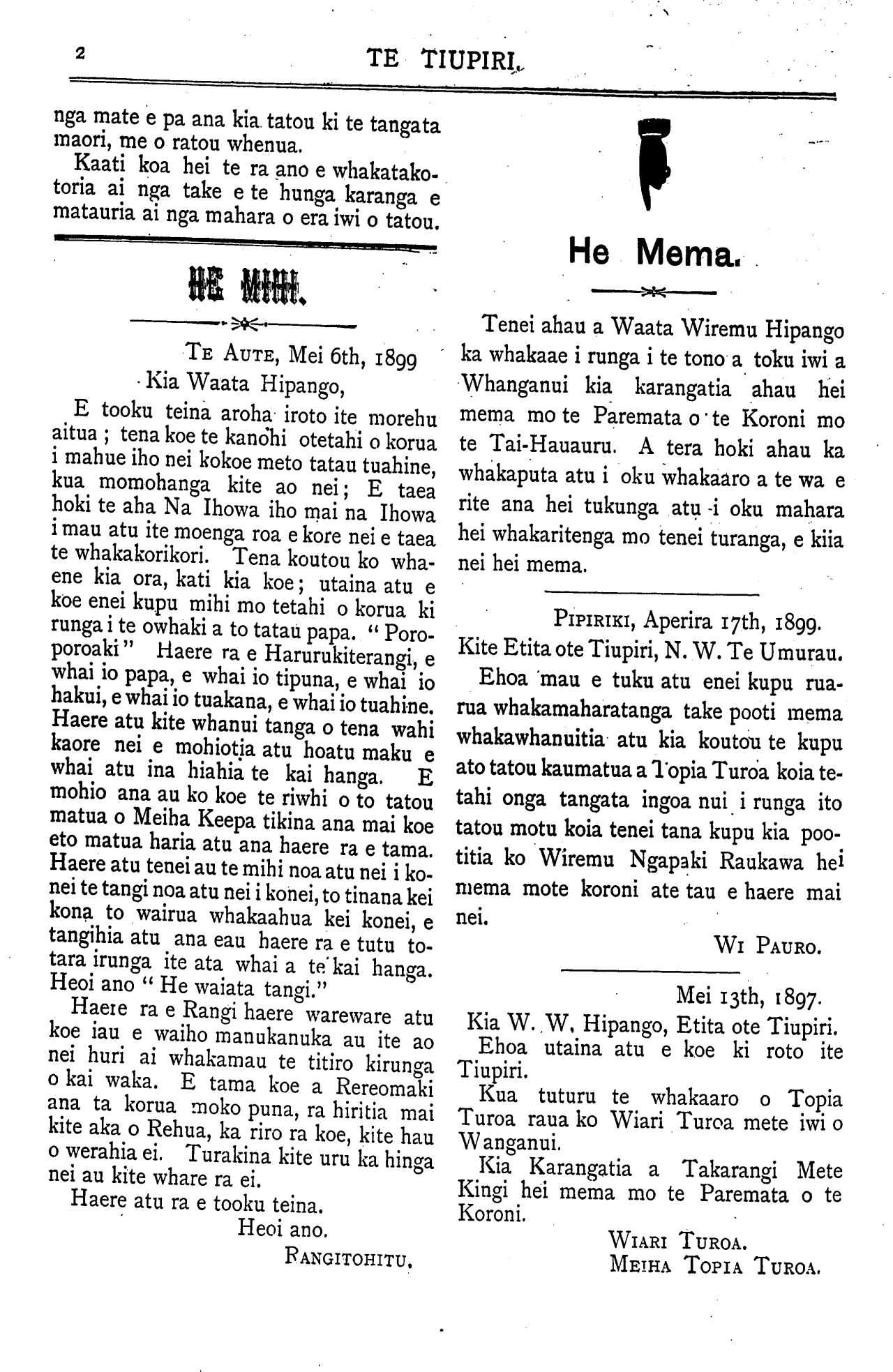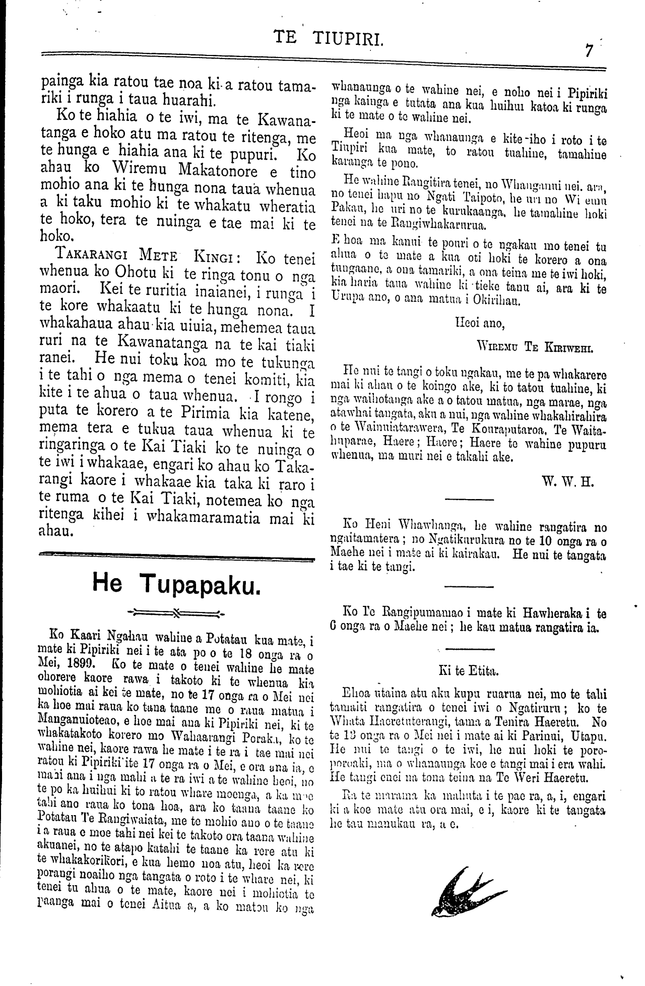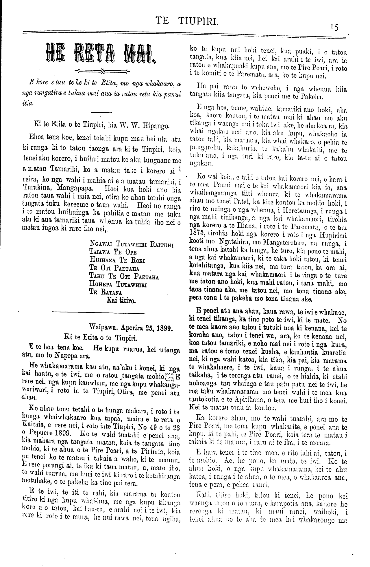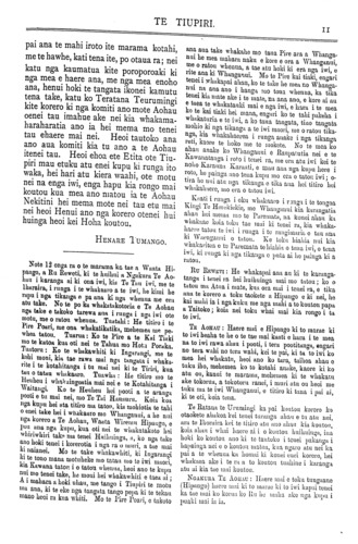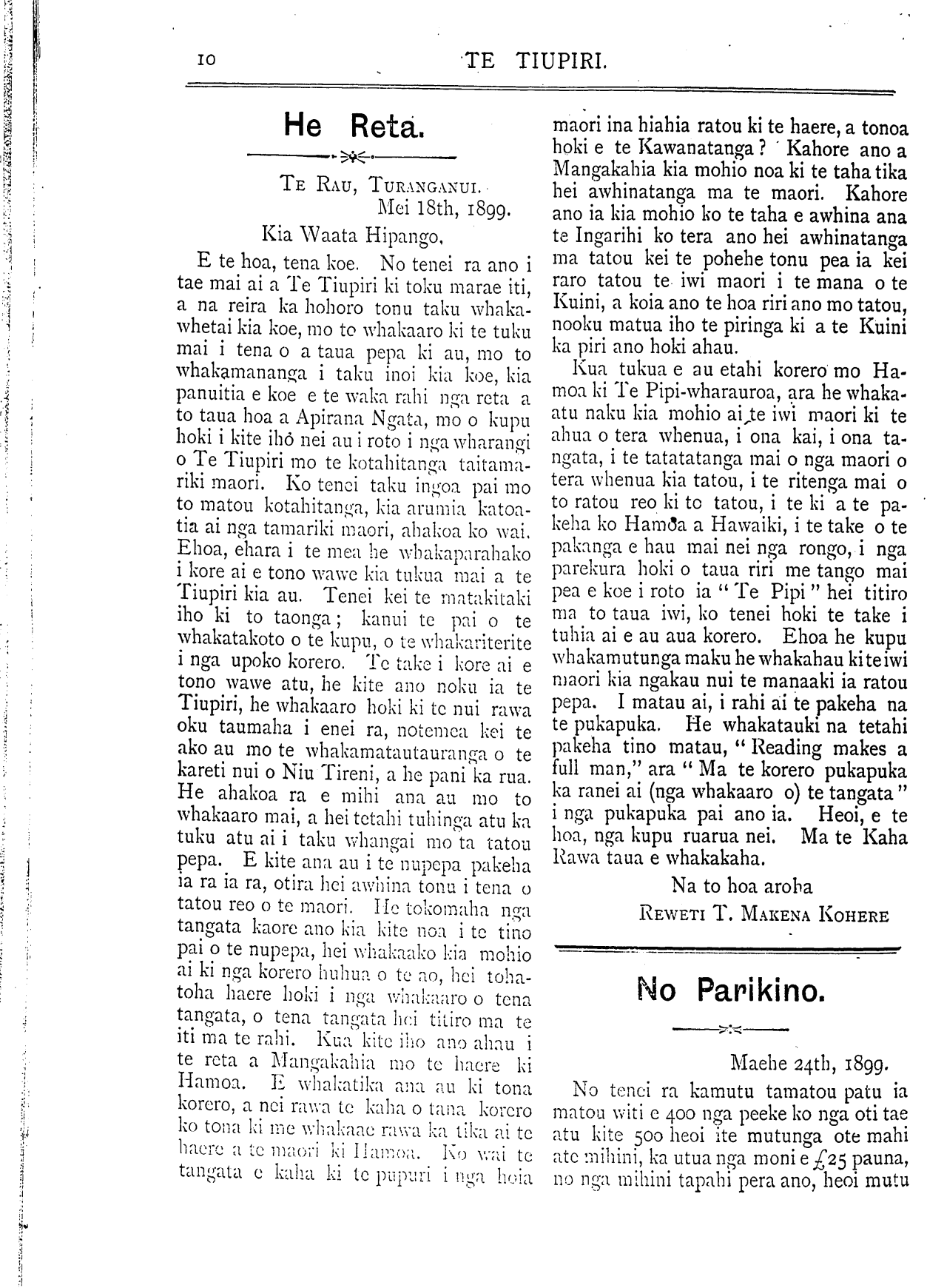 TE TIUPIRI. Waipawa. Aperira 25,1899. Ki te Etita o te Tiupiri. E te hoa tena koe. He kupu ruarua, hei -utanga atu, mo to Nupepa ara. He whakamarama kau atu, na aku i konei, ki nga kai hautu, o te iwi, me o ratou tangata mohio E rere nei, nga kupu kauwhau, me nga kupu whakanga- wariwari, i roto ia te Tiupiri, Otira, me penei atu ahau. Ko ahau tonu tetahi o te hunga mahara, i roto i te hunga whaiwhakaaro kua tapaa, maira e te reta o Kaitaia, e rere nei, i roto iate Tiupiri, No 49 o te 23 o Pepuere 1899. Ko te wahi tuatahi e penei ana, kia mahara nga tangata matau, koia te tangata tino mohio, ki te alma o te Pire Poari, a te Pirimia, koia pu tenei ko te matau i takaia a waho, ki te maunu E rere porangi ai, te ika ki taua matau, a, mate iho, te wahi tuarua, me huri te iwi ki raro i te kotahitanga motuhake, o te pakeha ka tino pai tera. E te iwi, te iti te rahi, kia marama ta koutou titiro ki nga kupu whai-hua, me nga kupu tikanga kore a o tatou, kai hau-tu, e arahi nei i te iwi, kia rere ki roto i to mura, he nui rawa nei, toua ngiha.