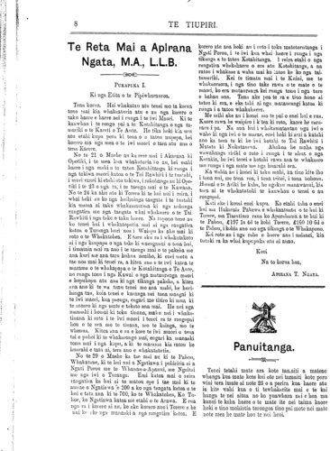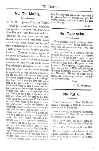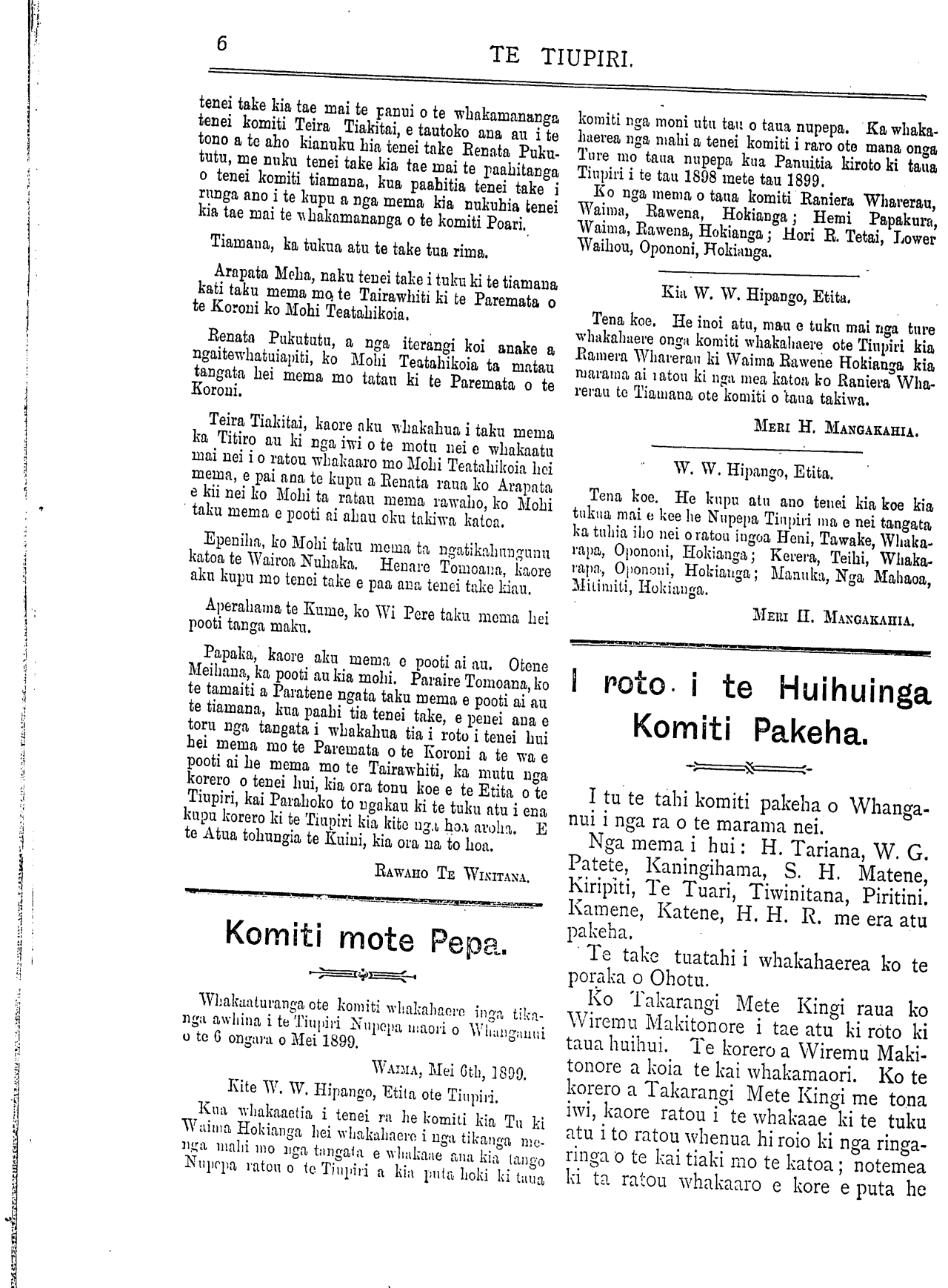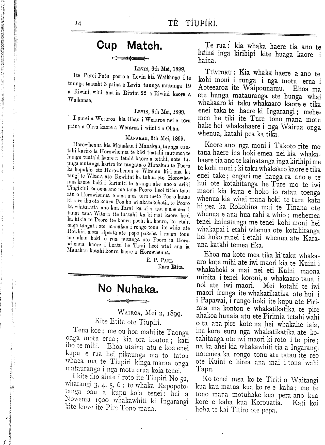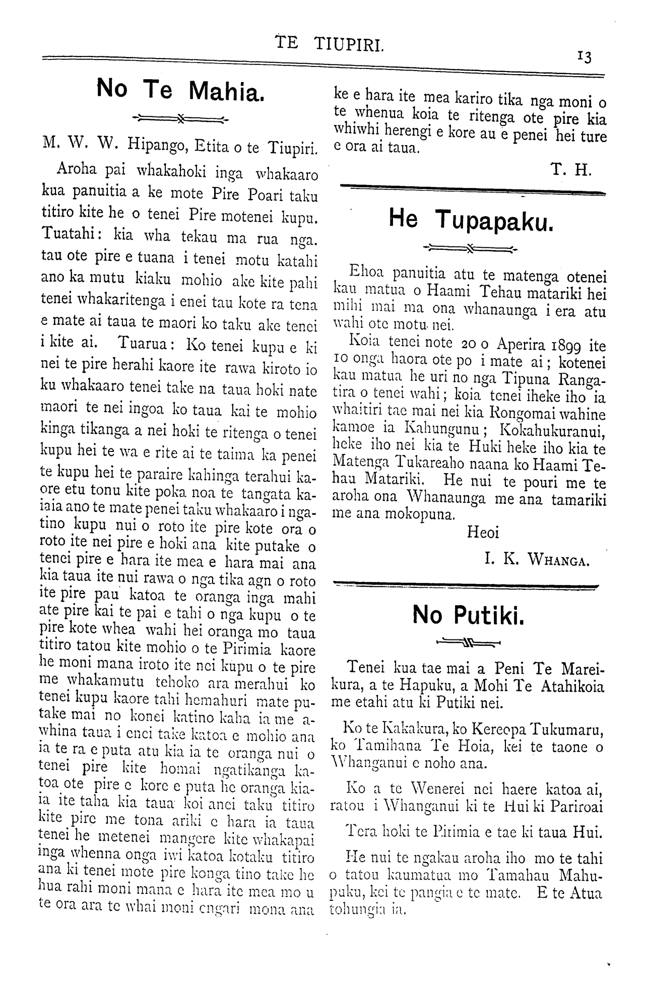 TE TIUPIRI. Waipawa. Aperira 25,1899. Ki te Etita o te Tiupiri. E te hoa tena koe. He kupu ruarua, hei -utanga atu, mo to Nupepa ara. He whakamarama kau atu, na aku i konei, ki nga kai hautu, o te iwi, me o ratou tangata mohio E rere nei, nga kupu kauwhau, me nga kupu whakanga- wariwari, i roto ia te Tiupiri, Otira, me penei atu ahau. Ko ahau tonu tetahi o te hunga mahara, i roto i te hunga whaiwhakaaro kua tapaa, maira e te reta o Kaitaia, e rere nei, i roto iate Tiupiri, No 49 o te 23 o Pepuere 1899. Ko te wahi tuatahi e penei ana, kia mahara nga tangata matau, koia te tangata tino mohio, ki te alma o te Pire Poari, a te Pirimia, koia pu tenei ko te matau i takaia a waho, ki te maunu E rere porangi ai, te ika ki taua matau, a, mate iho, te wahi tuarua, me huri te iwi ki raro i te kotahitanga motuhake, o te pakeha ka tino pai tera. E te iwi, te iti te rahi, kia marama ta koutou titiro ki nga kupu whai-hua, me nga kupu tikanga kore a o tatou, kai hau-tu, e arahi nei i te iwi, kia rere ki roto i to mura, he nui rawa nei, toua ngiha.