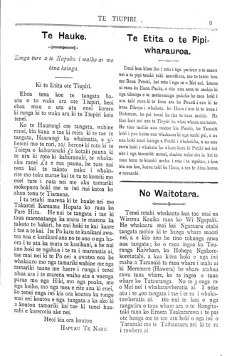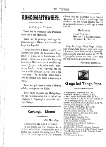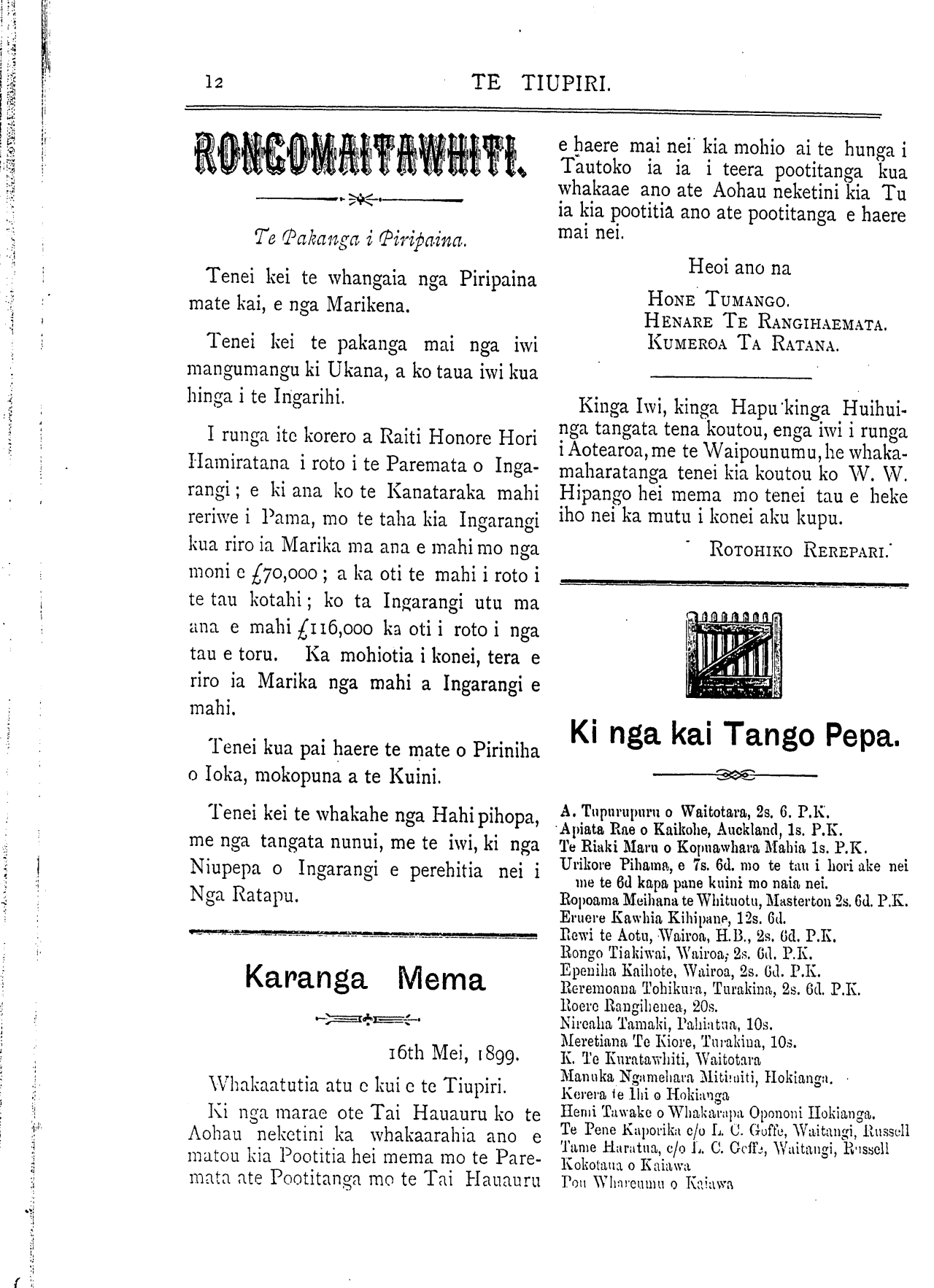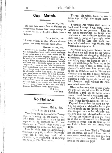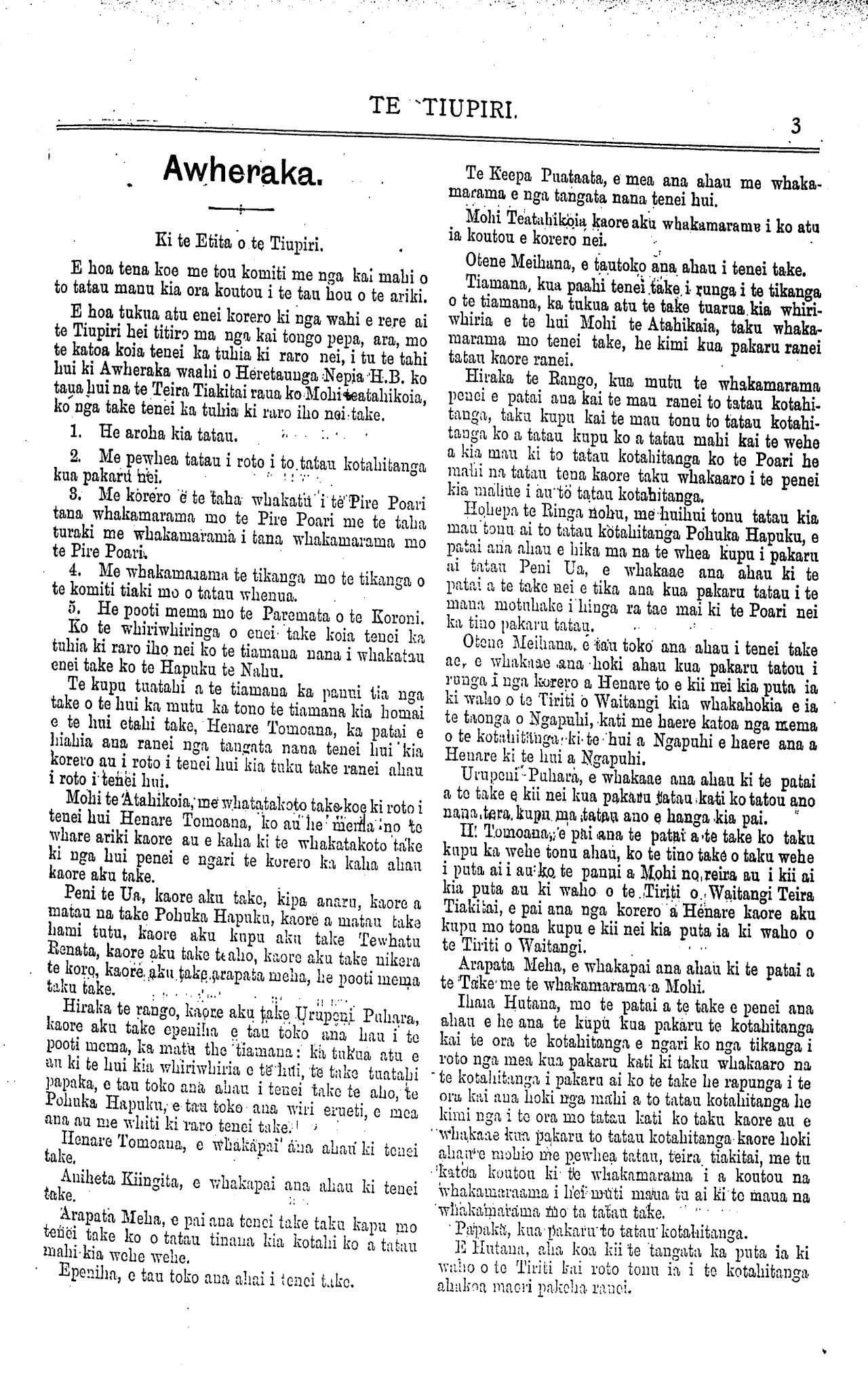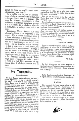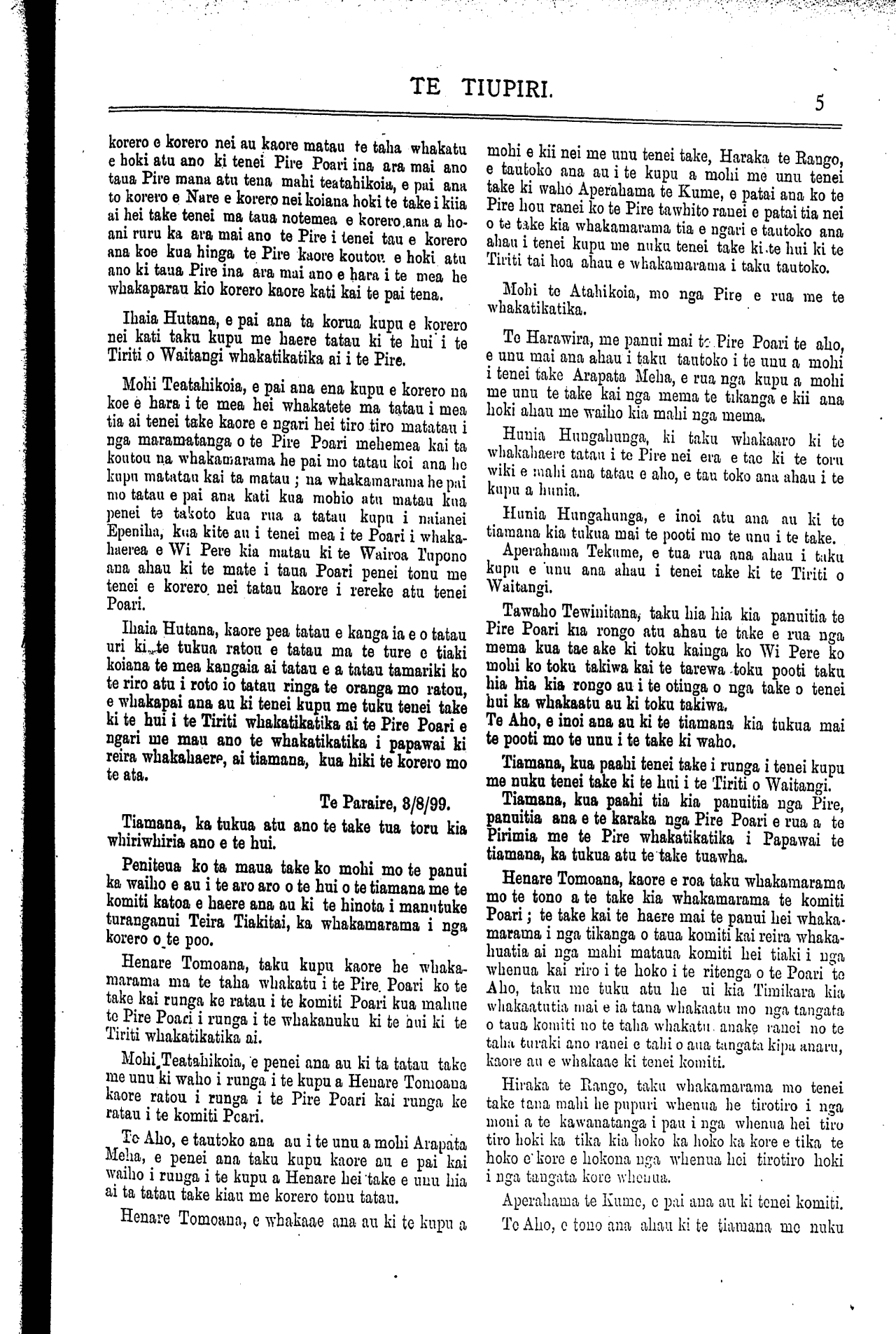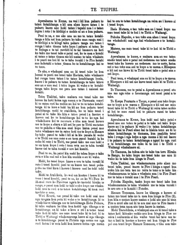 TE TIUPIRI. Waipawa. Aperira 25,1899. Ki te Etita o te Tiupiri. E te hoa tena koe. He kupu ruarua, hei -utanga atu, mo to Nupepa ara. He whakamarama kau atu, na aku i konei, ki nga kai hautu, o te iwi, me o ratou tangata mohio E rere nei, nga kupu kauwhau, me nga kupu whakanga- wariwari, i roto ia te Tiupiri, Otira, me penei atu ahau. Ko ahau tonu tetahi o te hunga mahara, i roto i te hunga whaiwhakaaro kua tapaa, maira e te reta o Kaitaia, e rere nei, i roto iate Tiupiri, No 49 o te 23 o Pepuere 1899. Ko te wahi tuatahi e penei ana, kia mahara nga tangata matau, koia te tangata tino mohio, ki te alma o te Pire Poari, a te Pirimia, koia pu tenei ko te matau i takaia a waho, ki te maunu E rere porangi ai, te ika ki taua matau, a, mate iho, te wahi tuarua, me huri te iwi ki raro i te kotahitanga motuhake, o te pakeha ka tino pai tera. E te iwi, te iti te rahi, kia marama ta koutou titiro ki nga kupu whai-hua, me nga kupu tikanga kore a o tatou, kai hau-tu, e arahi nei i te iwi, kia rere ki roto i to mura, he nui rawa nei, toua ngiha.