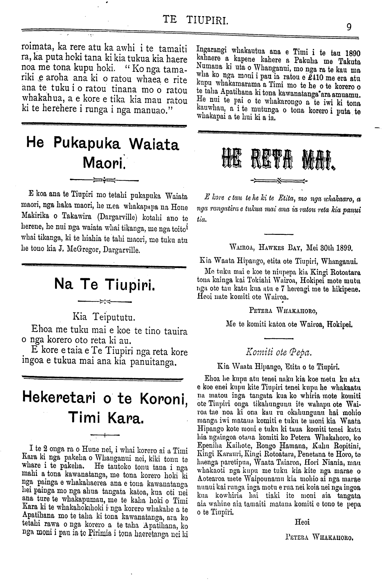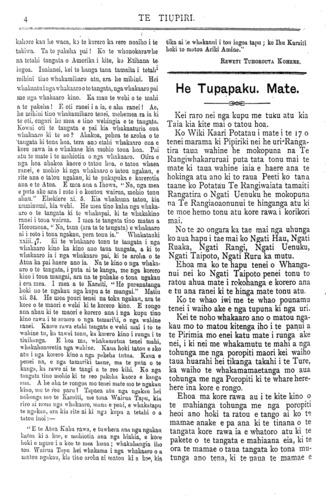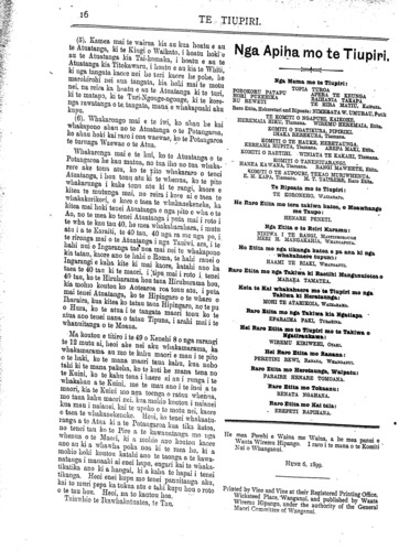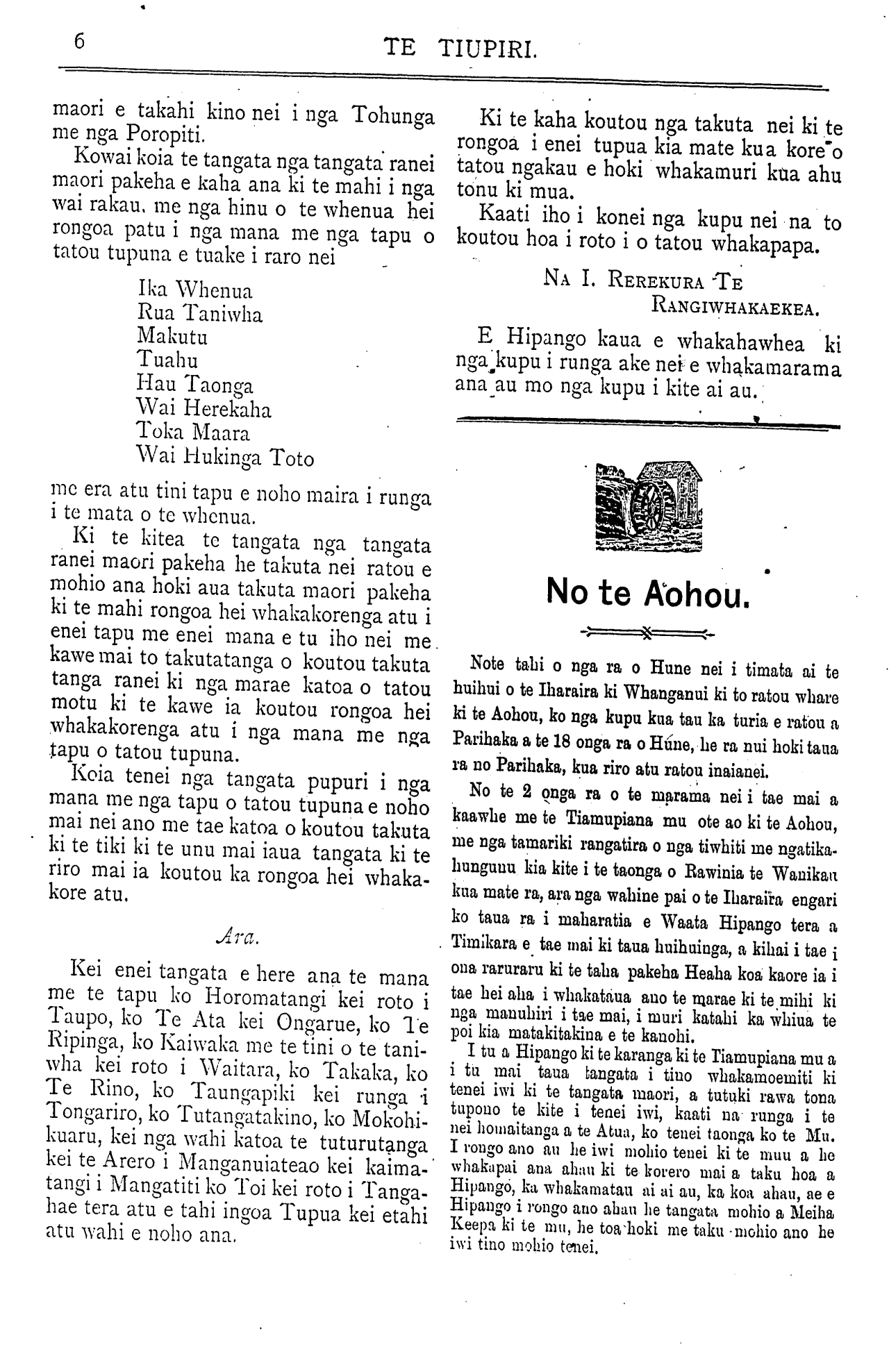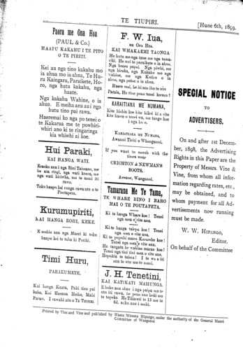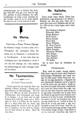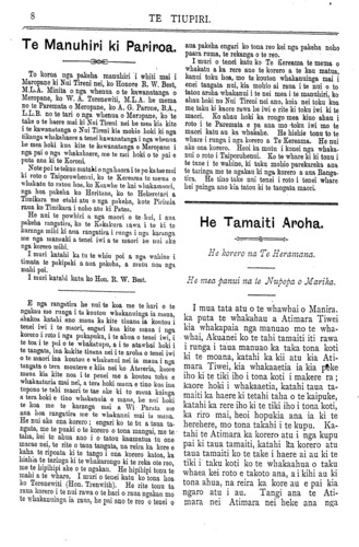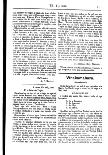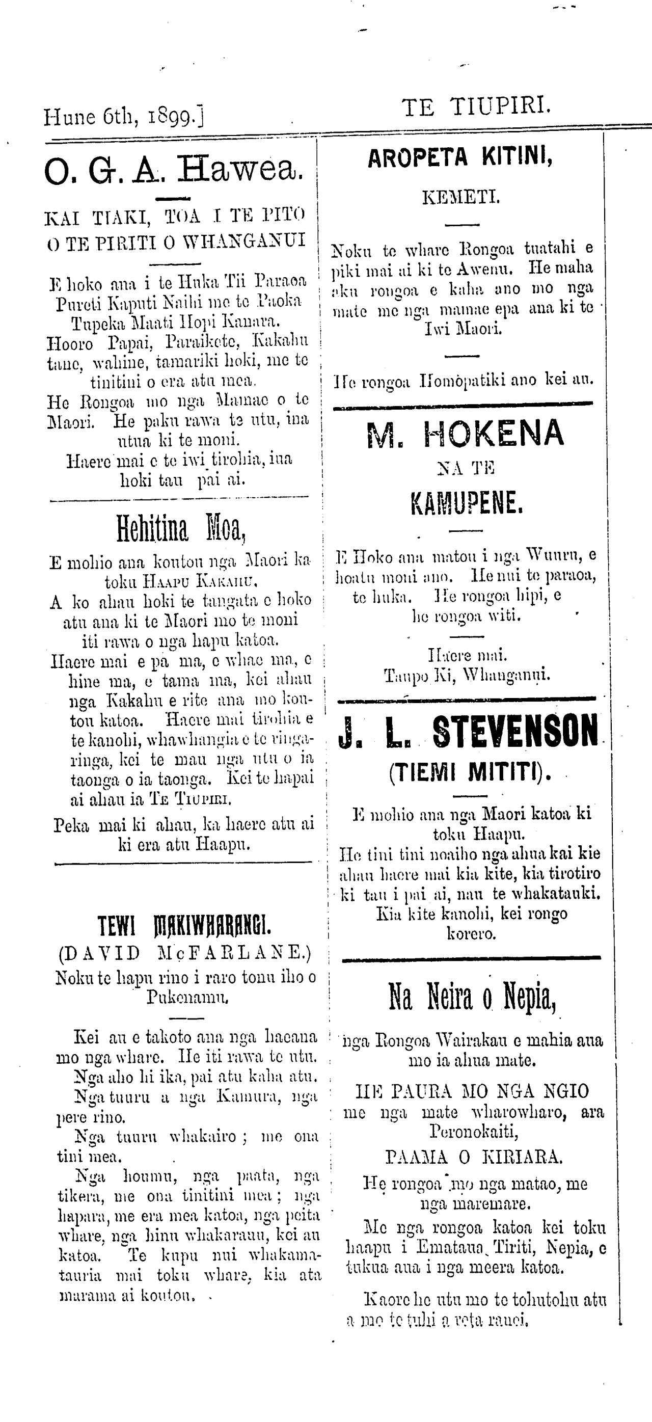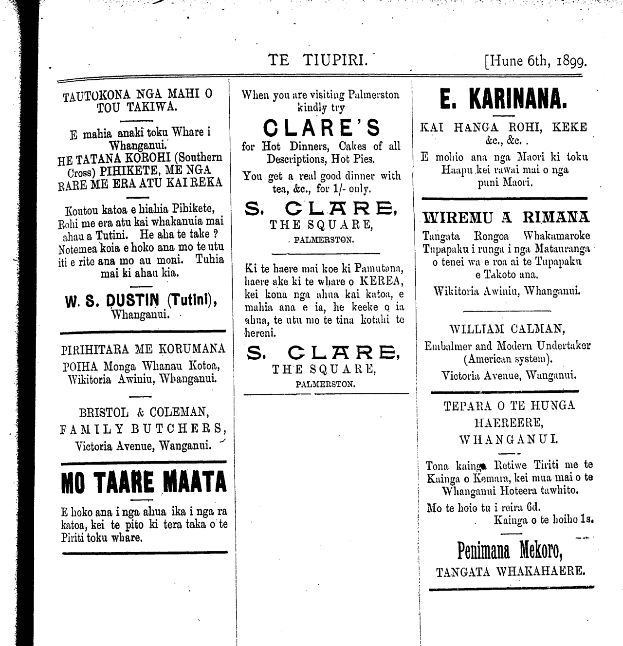 TE TIUPIRI. O. G. A. Hawea, KAI TIAKI, TOA I TE PITO O TE PIRITI O WHANGANUI i E hoko ana i te Huka Tii Paraoa Pureti Kaputi Naihi me to Paoka 1 Tupeka Maata Hopi Kanara. | Hooro Papai, Paraikete, Kakahu i timo, wahine, tamariki hoki, me te tinitini o era ata mea.i He Rongoa mo nga Mamae o te Maori. He paku rawa te utu, ina | utua ki te moni. Haere mai e te iwi tirohia, ina hoki tau pai ai. Hehitina Moa, i E mohio ana koutou nga Maori ka toku HAAPU KAKAHU, TEWI MAKIWHARANGI. (DAVID McFARLANE.)