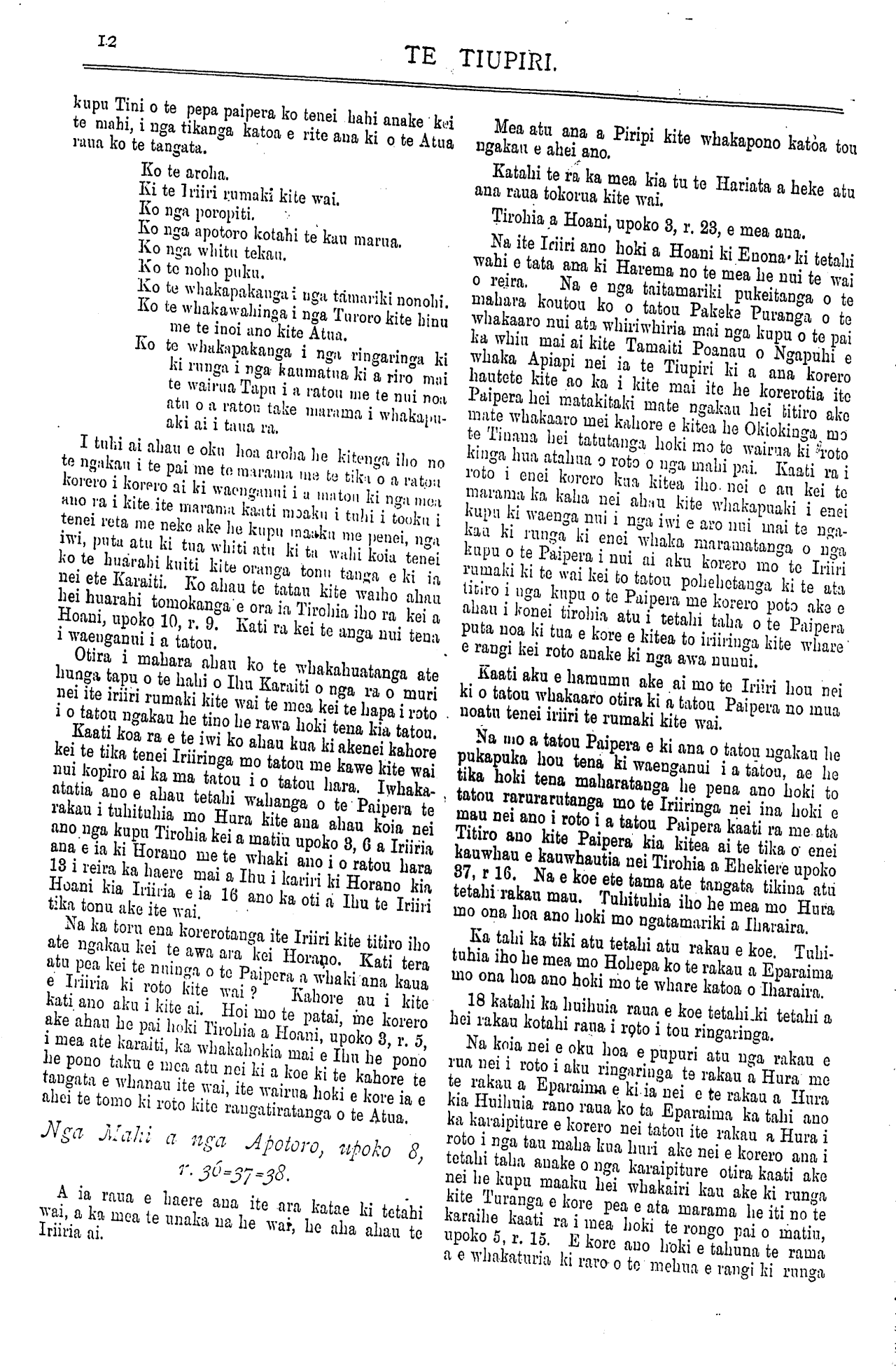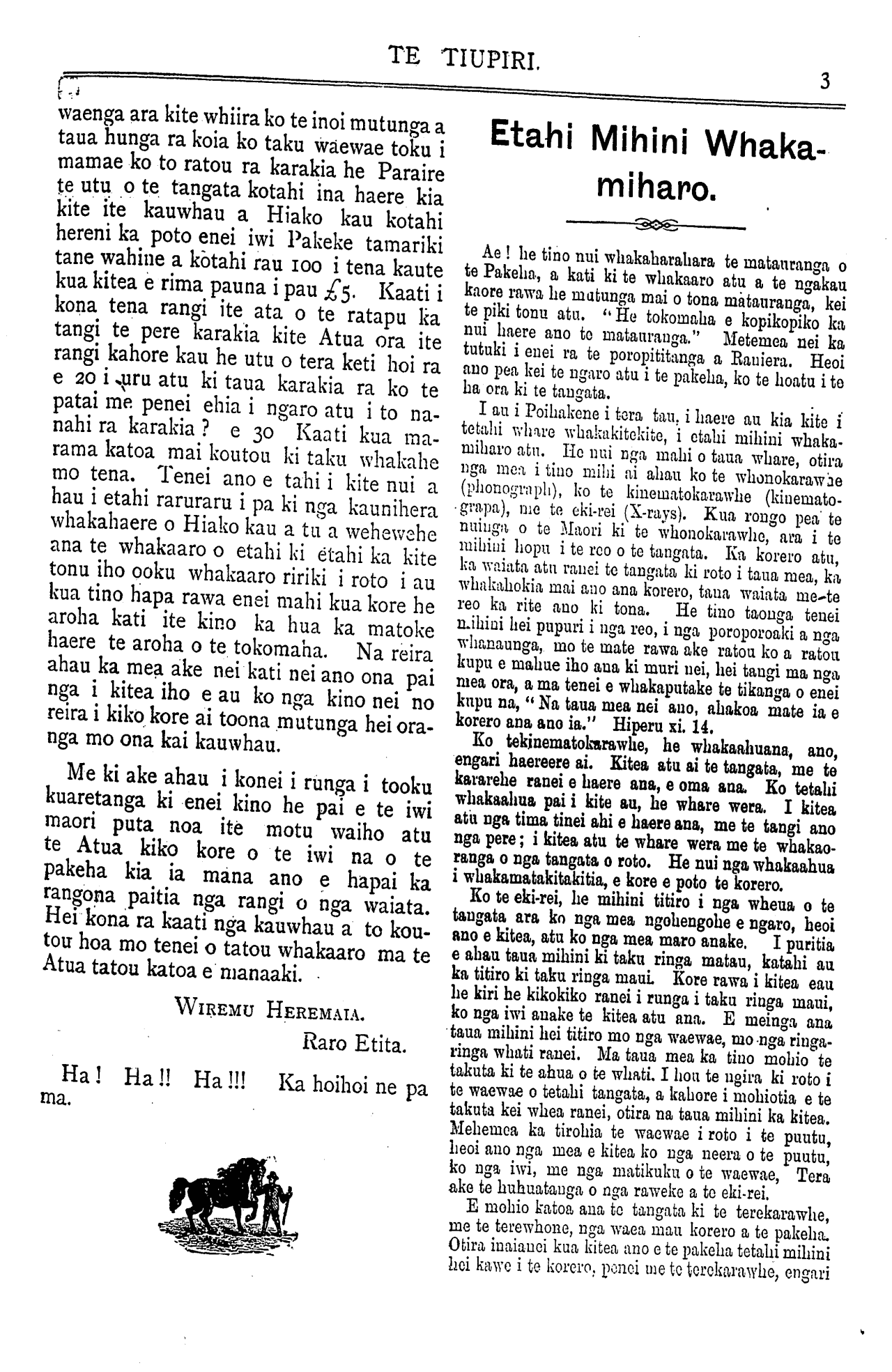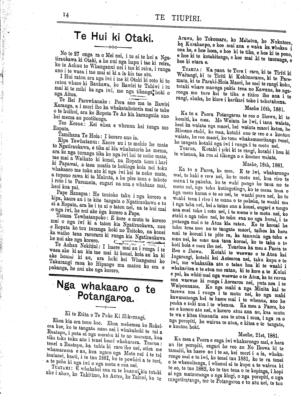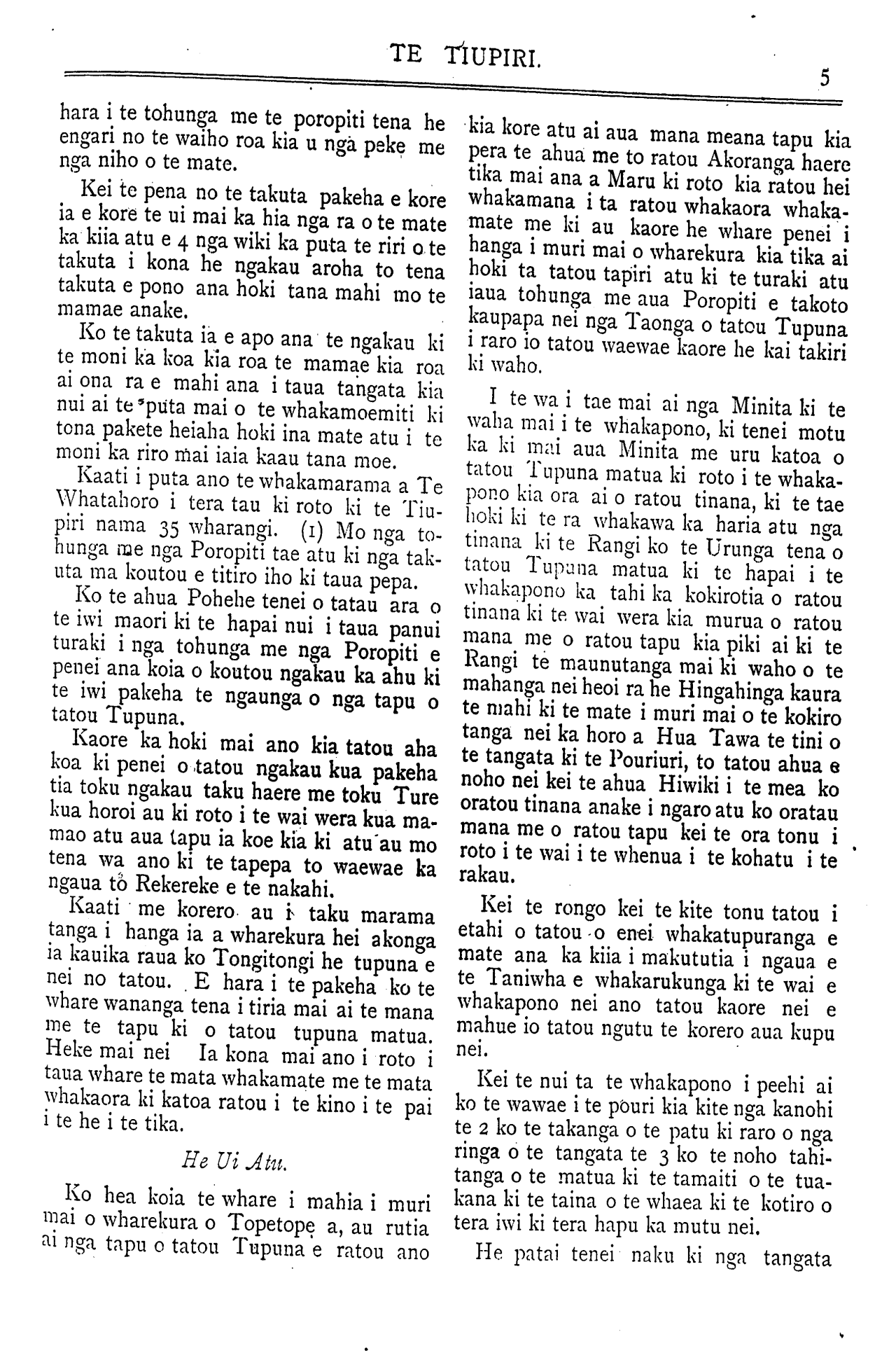 TE TIUPIRI. O. G. A. Hawea, KAI TIAKI, TOA I TE PITO O TE PIRITI O WHANGANUI i E hoko ana i te Huka Tii Paraoa Pureti Kaputi Naihi me to Paoka 1 Tupeka Maata Hopi Kanara. | Hooro Papai, Paraikete, Kakahu i timo, wahine, tamariki hoki, me te tinitini o era ata mea.i He Rongoa mo nga Mamae o te Maori. He paku rawa te utu, ina | utua ki te moni. Haere mai e te iwi tirohia, ina hoki tau pai ai. Hehitina Moa, i E mohio ana koutou nga Maori ka toku HAAPU KAKAHU, TEWI MAKIWHARANGI. (DAVID McFARLANE.)