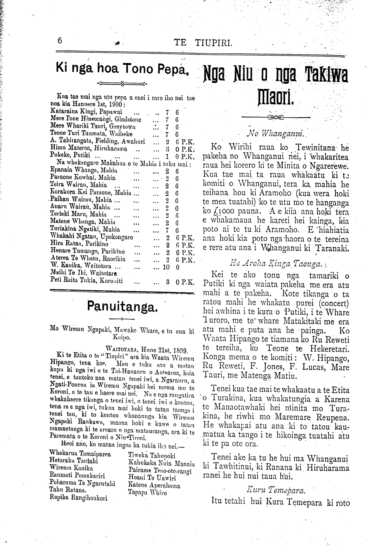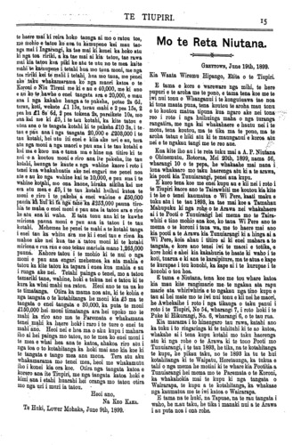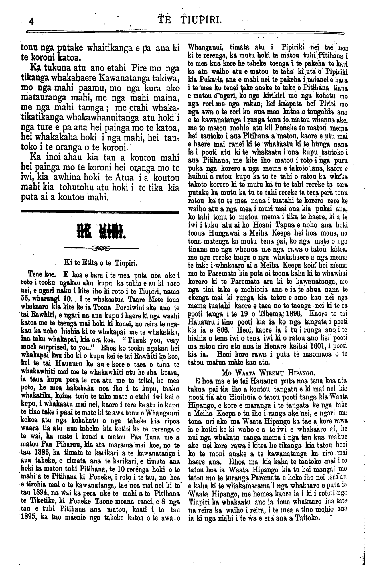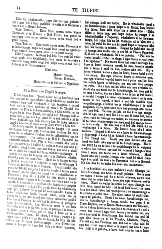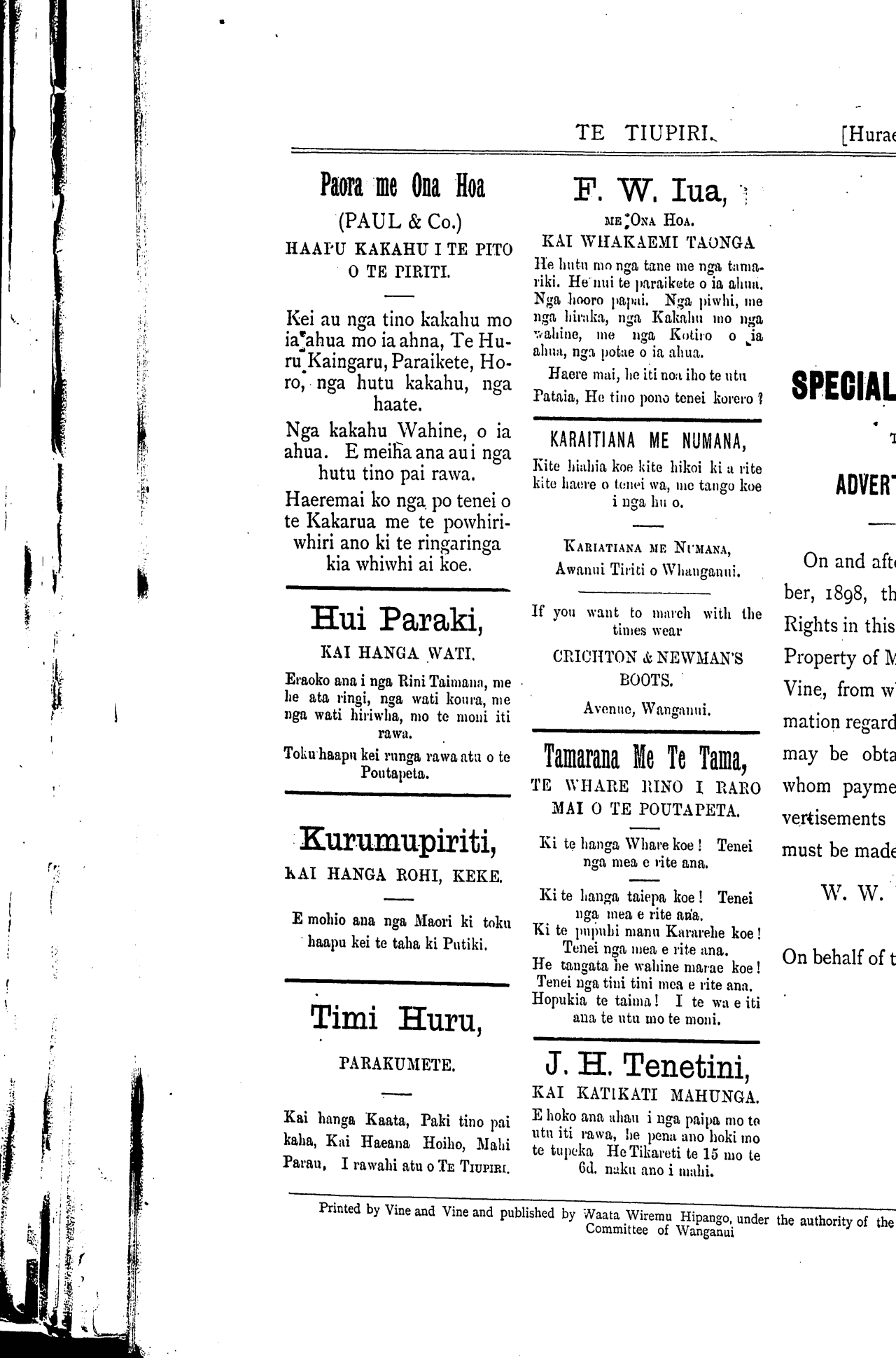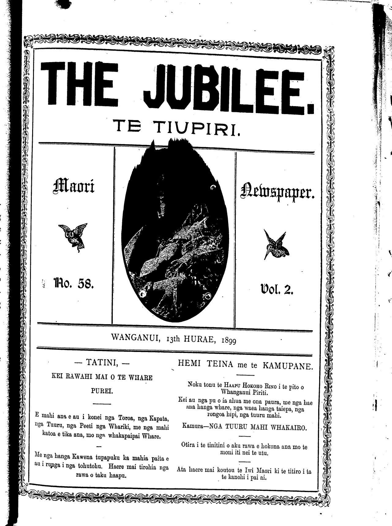 THE JUBILEE. TE TIUPIRI MAORI NEWSPAPER NO 58 VOL 2. WANGANUI, 13th HURAE, 1899 TATINI KEI RAWAHI MAI O TE WHARE PUREI E mahi ana e au i konei nga Toroa, nga Kapata, nga Tuuru, nga Peeti nga Whariki, me nga mahi katoa e tika ana, mo nga whakapaipai Whare. Me nga hanga Kawena tupapuku ka mahia paita e au i runga i nga tohutohu. Haere mai tirohia nga rawa o taku haapu. HEMI TEINA ME TE KAMUPANE. Noku tonu te Haapu Hokoho Rino i te pita o Whanganui Piriti. Kei au nga pu o ia ahua me ona paura, me nga hae ana hanga whare, nga waea hanga taiepa, nga rongoa hipi, nga tuuru mahi. Kamura NGA TUURU MAHI WHAKAIRO. Otira i te tinitini o aku rawa e hokona ana mo te moni iti nei te utu. Ata haere mai koutou te Iwi Maori ki te titiro i ta te kanohi i pai ai.