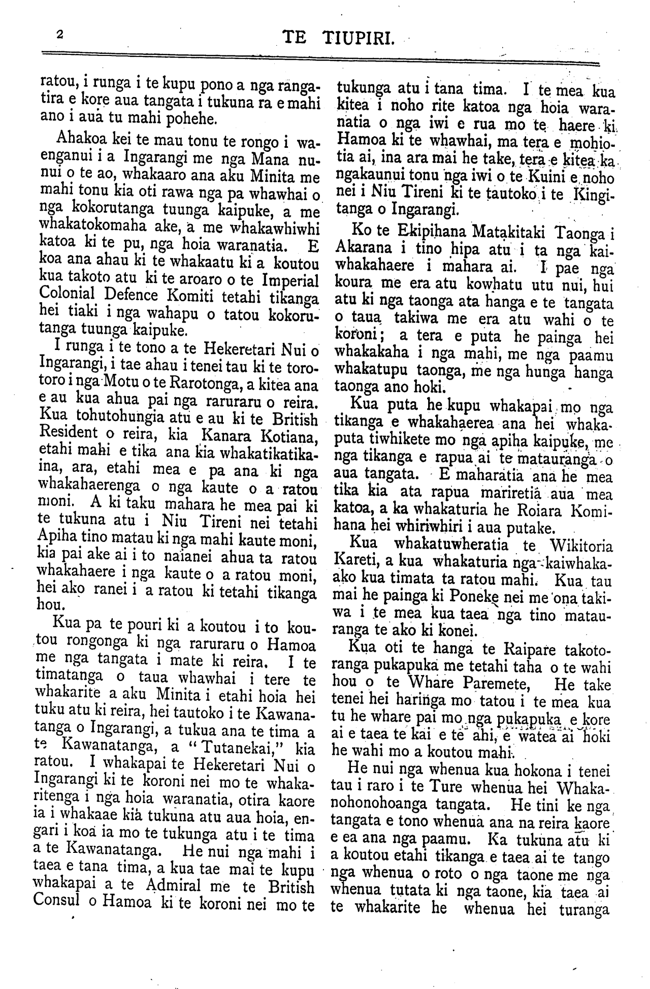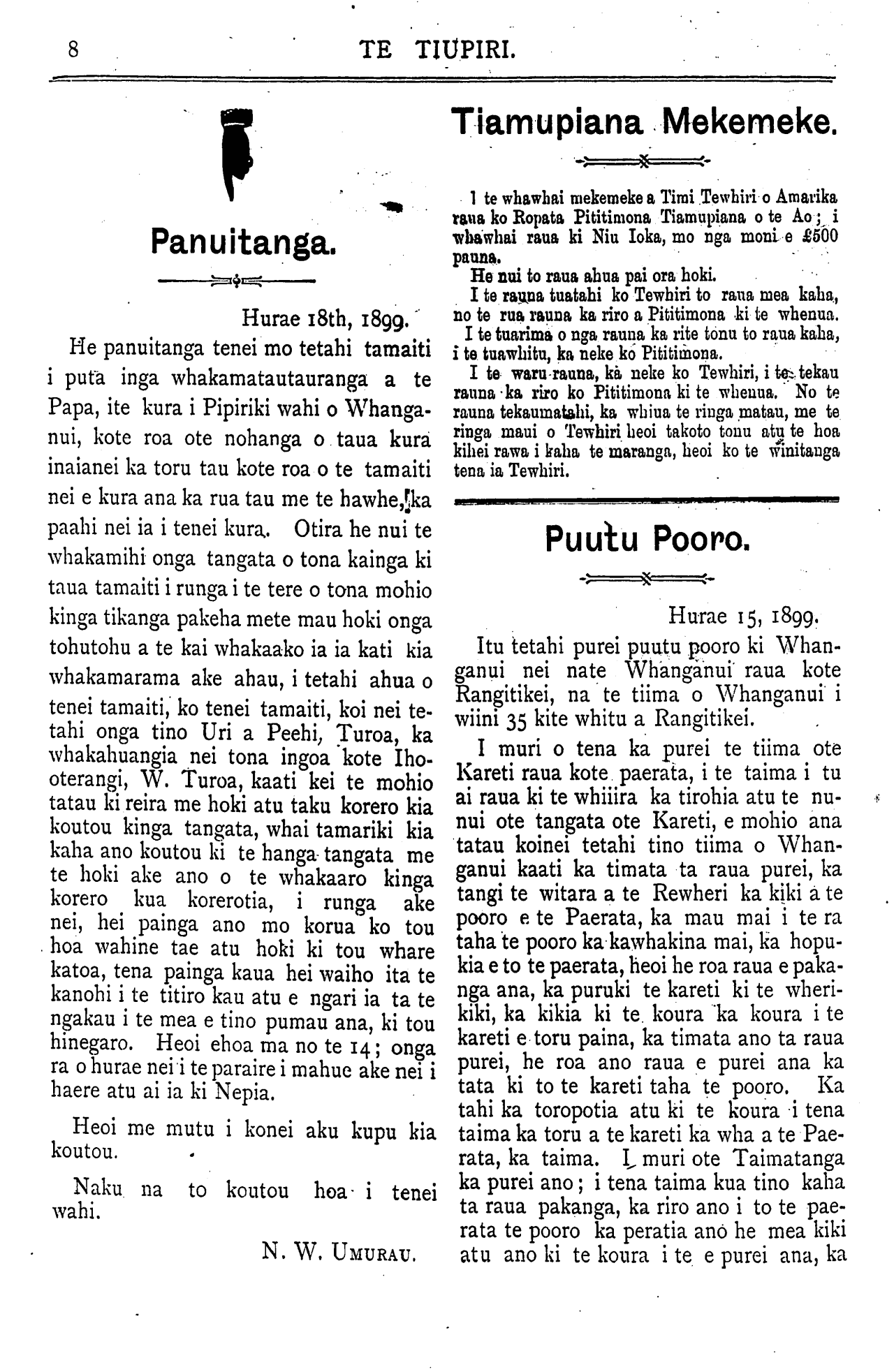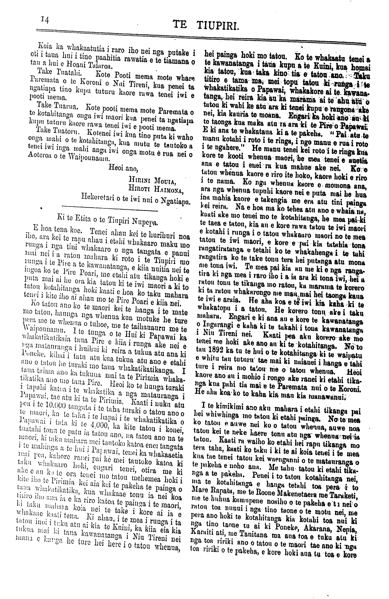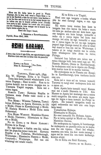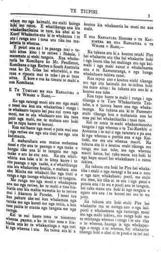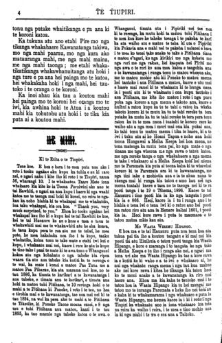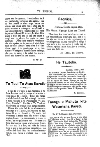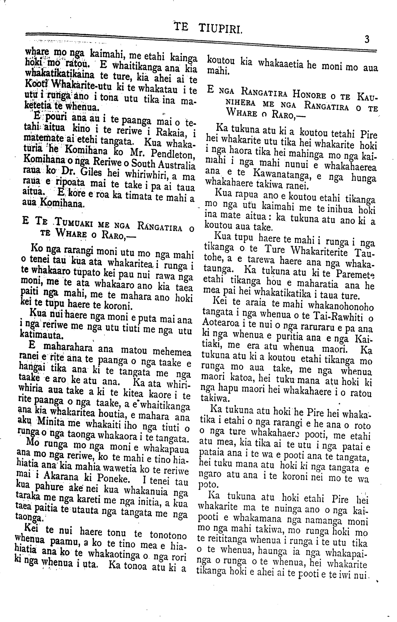 THE JUBILEE. TE TIUPIRI MAORI NEWSPAPER NO 58 VOL 2. WANGANUI, 13th HURAE, 1899 TATINI KEI RAWAHI MAI O TE WHARE PUREI E mahi ana e au i konei nga Toroa, nga Kapata, nga Tuuru, nga Peeti nga Whariki, me nga mahi katoa e tika ana, mo nga whakapaipai Whare. Me nga hanga Kawena tupapuku ka mahia paita e au i runga i nga tohutohu. Haere mai tirohia nga rawa o taku haapu. HEMI TEINA ME TE KAMUPANE. Noku tonu te Haapu Hokoho Rino i te pita o Whanganui Piriti. Kei au nga pu o ia ahua me ona paura, me nga hae ana hanga whare, nga waea hanga taiepa, nga rongoa hipi, nga tuuru mahi. Kamura NGA TUURU MAHI WHAKAIRO. Otira i te tinitini o aku rawa e hokona ana mo te moni iti nei te utu. Ata haere mai koutou te Iwi Maori ki te titiro i ta te kanohi i pai ai.