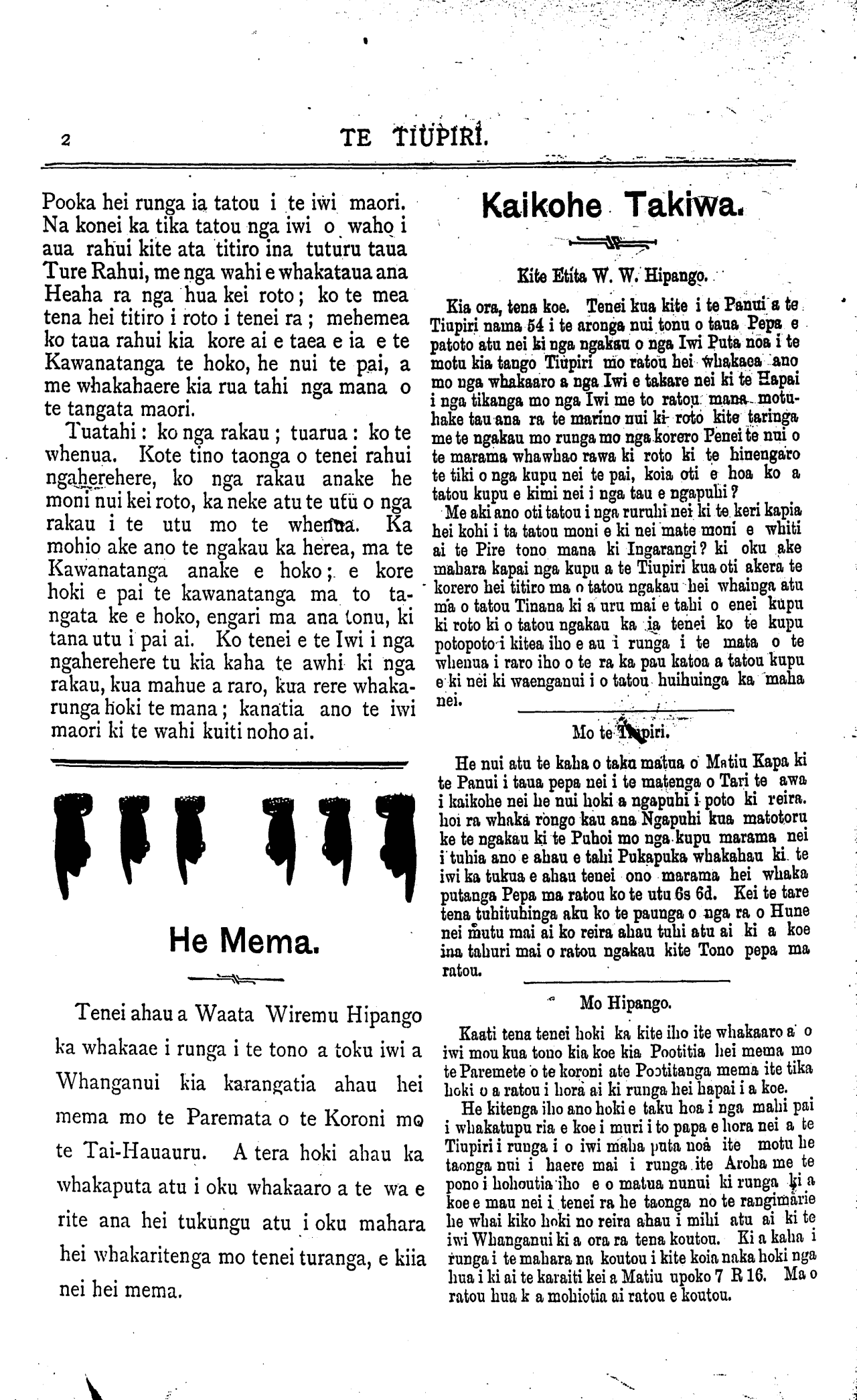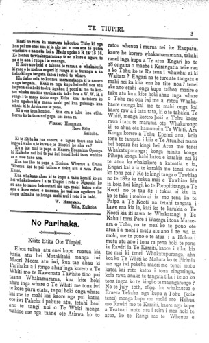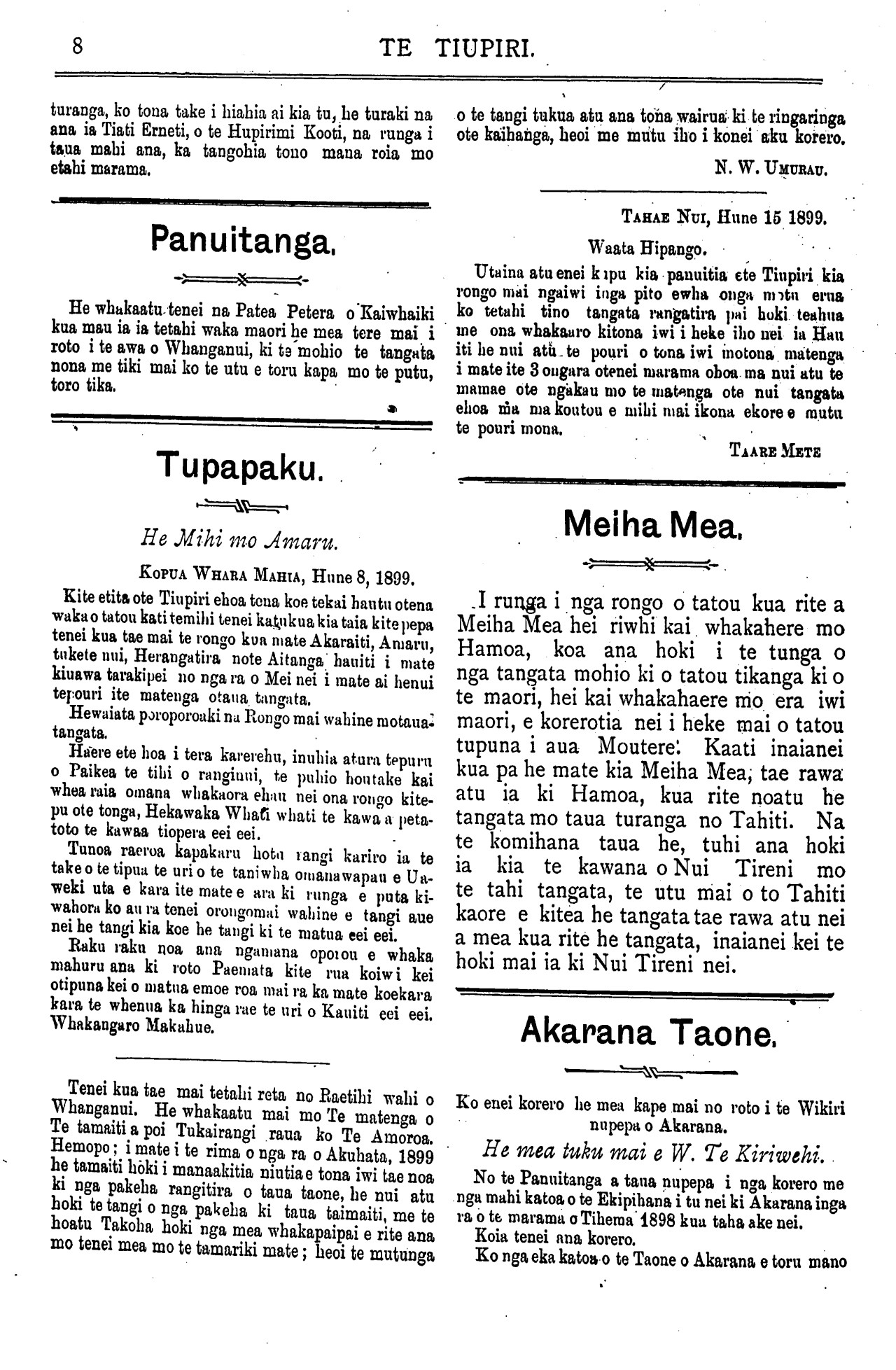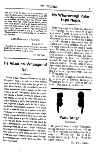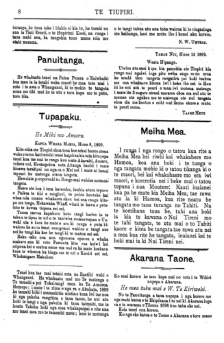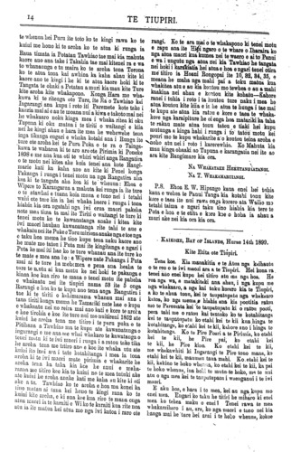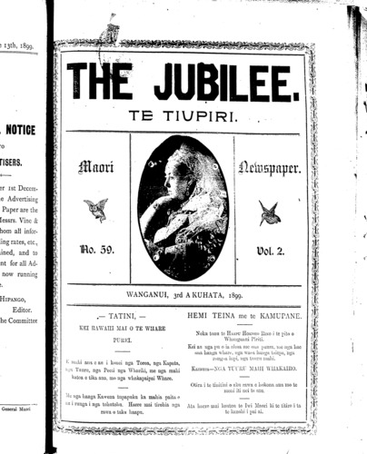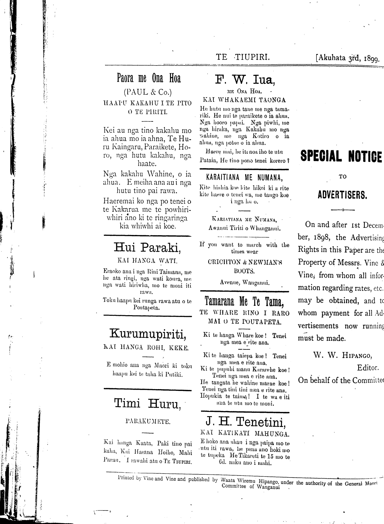 THE JUBILEE. TE TIUPIRI MAORI NEWSPAPER NO 59 VOL 2. WANGANUI, 3rd AKUHATA, 1899. TATINI KEI RAWAHI MAI O TE WHARE PUREI E mahi ana e au i konei nga Toroa, nga Kapata, nga Tuuru, nga Peeti nga Whariki, me nga mahi katoa e tika ana, mo nga whakapaipai Whare. Me nga hanga Kawena tupapuku ka mahia paita e au i runga i nga tohutohu. Haere mai tirohia nga rawa o taku haapu. HEMI TEINA ME TE KAMUPANE. Noku tonu te Haapu Hokoho Rino i te pita o Whanganui Piriti. Kei au nga pu o ia ahua me ona paura, me nga hae ana hanga whare, nga waea hanga taiepa, nga rongoa hipi, nga tuuru mahi. Kamura NGA TUURU MAHI WHAKAIRO. Otira i te tinitini o aku rawa e hokona ana mo te moni iti nei te utu. Ata haere mai koutou te Iwi Maori ki te titiro i ta te kanohi i pai ai.