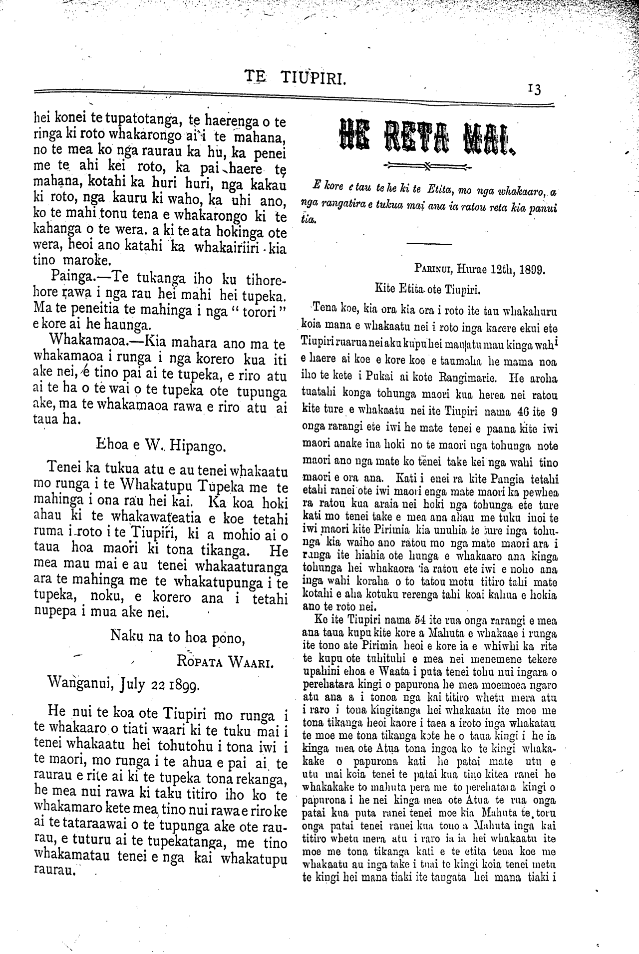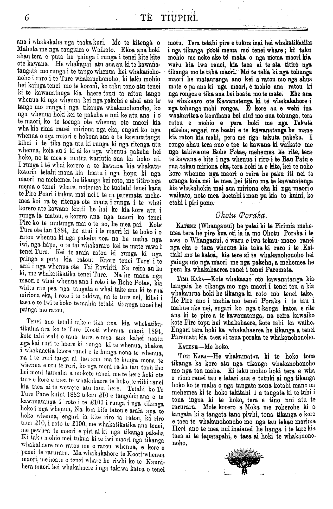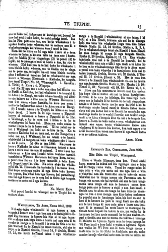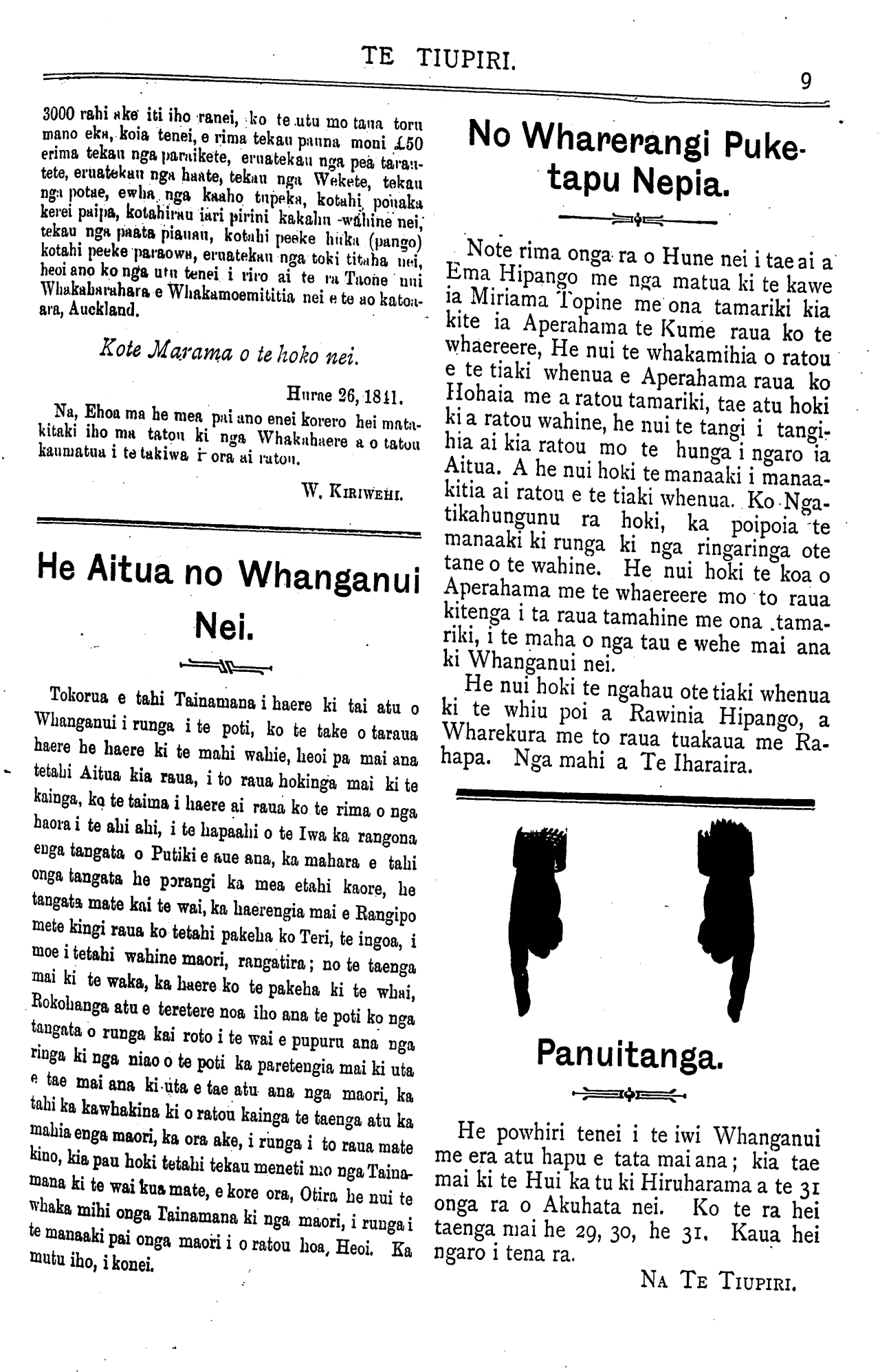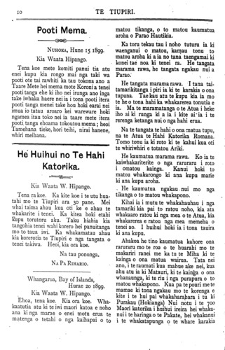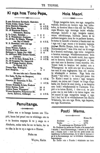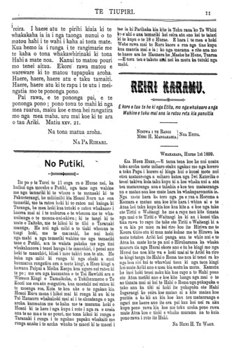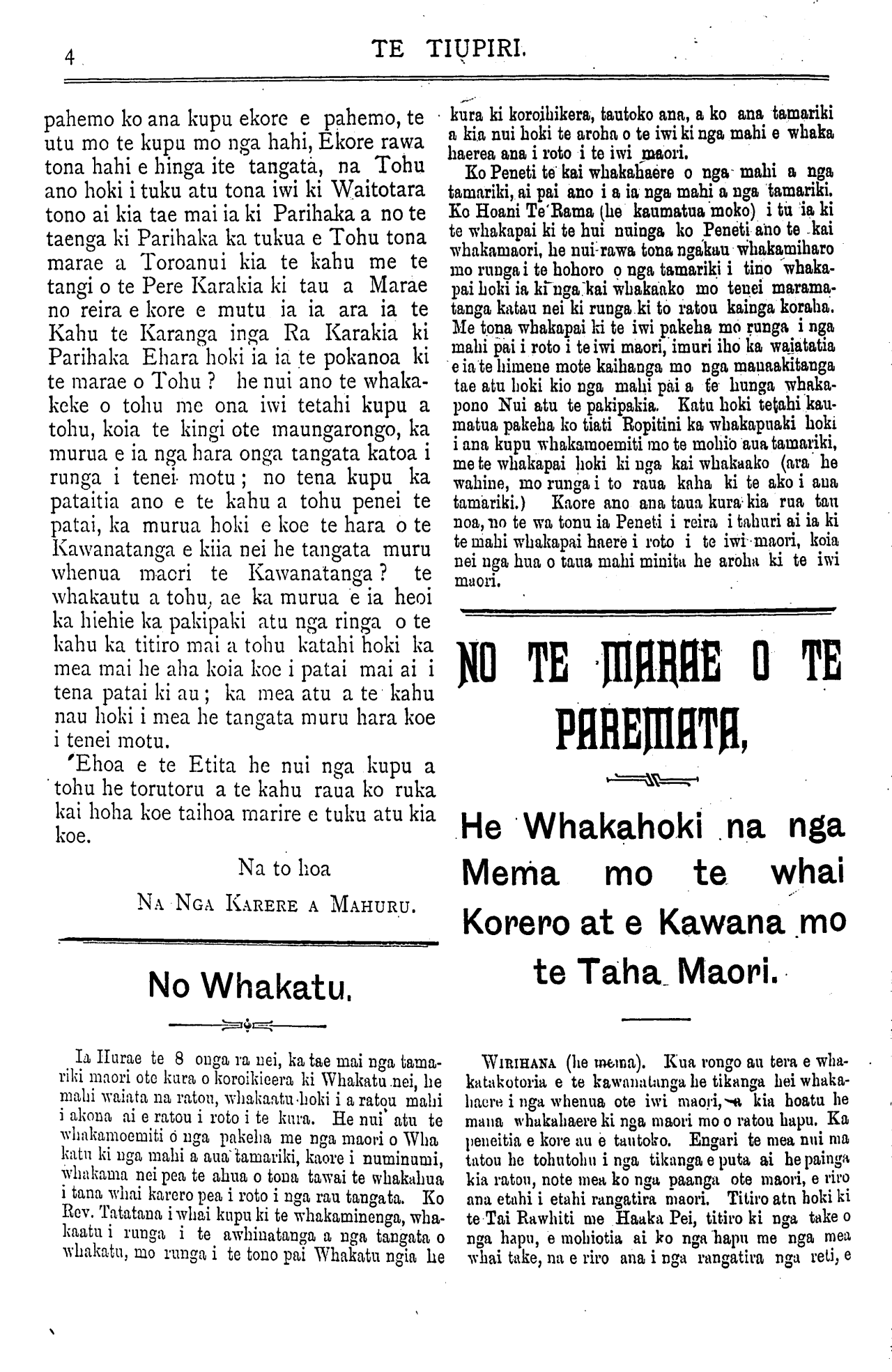 THE JUBILEE. TE TIUPIRI MAORI NEWSPAPER NO 59 VOL 2. WANGANUI, 3rd AKUHATA, 1899. TATINI KEI RAWAHI MAI O TE WHARE PUREI E mahi ana e au i konei nga Toroa, nga Kapata, nga Tuuru, nga Peeti nga Whariki, me nga mahi katoa e tika ana, mo nga whakapaipai Whare. Me nga hanga Kawena tupapuku ka mahia paita e au i runga i nga tohutohu. Haere mai tirohia nga rawa o taku haapu. HEMI TEINA ME TE KAMUPANE. Noku tonu te Haapu Hokoho Rino i te pita o Whanganui Piriti. Kei au nga pu o ia ahua me ona paura, me nga hae ana hanga whare, nga waea hanga taiepa, nga rongoa hipi, nga tuuru mahi. Kamura NGA TUURU MAHI WHAKAIRO. Otira i te tinitini o aku rawa e hokona ana mo te moni iti nei te utu. Ata haere mai koutou te Iwi Maori ki te titiro i ta te kanohi i pai ai.