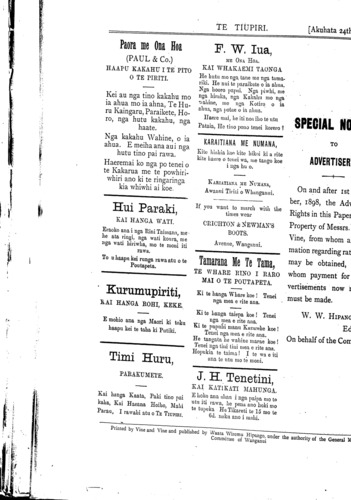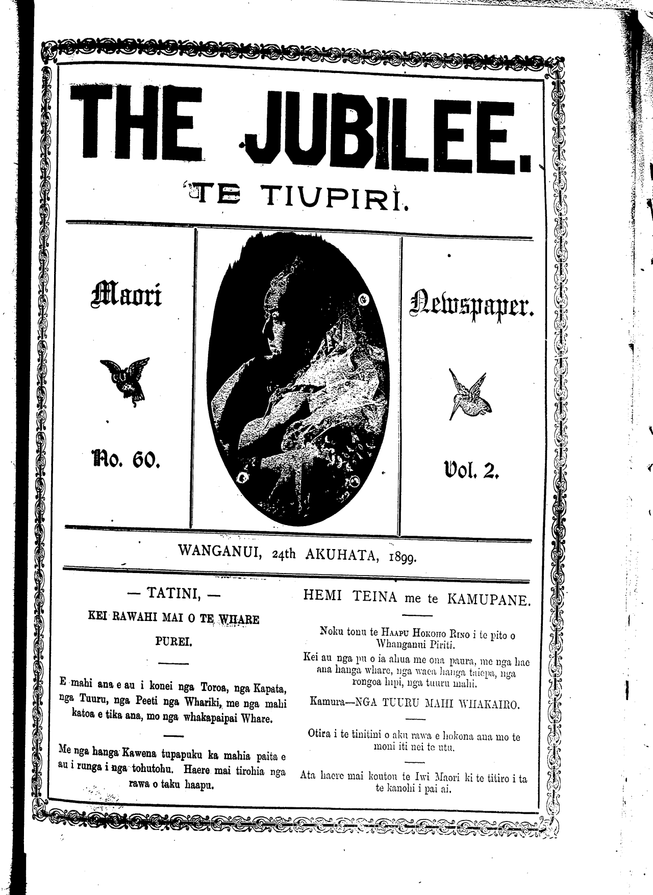 THE JUBILEE. TE TIUPIRI MAORI NEWSPAPER NO 60 VOL 2. WANGANUI, 24th AKUHATA, 1899. TATINI KEI RAWAHI MAI O TE WHARE PUREI E mahi ana e au i konei nga Toroa, nga Kapata, nga Tuuru, nga Peeti nga Whariki, me nga mahi katoa e tika ana, mo nga whakapaipai Whare. Me nga hanga Kawena tupapuku ka mahia paita e au i runga i nga tohutohu. Haere mai tirohia nga rawa o taku haapu. HEMI TEINA ME TE KAMUPANE. Noku tonu te Haapu Hokoho Rino i te pita o Whanganui Piriti. Kei au nga pu o ia ahua me ona paura, me nga hae ana hanga whare, nga waea hanga taiepa, nga rongoa hipi, nga tuuru mahi. Kamura NGA TUURU MAHI WHAKAIRO. Otira i te tinitini o aku rawa e hokona ana mo te moni iti nei te utu. Ata haere mai koutou te Iwi Maori ki te titiro i ta te kanohi i pai ai.