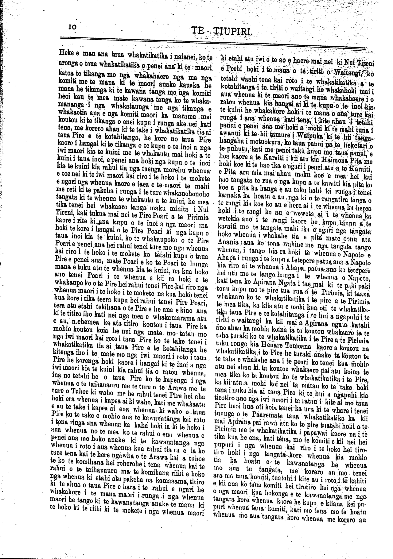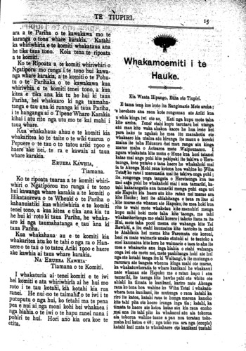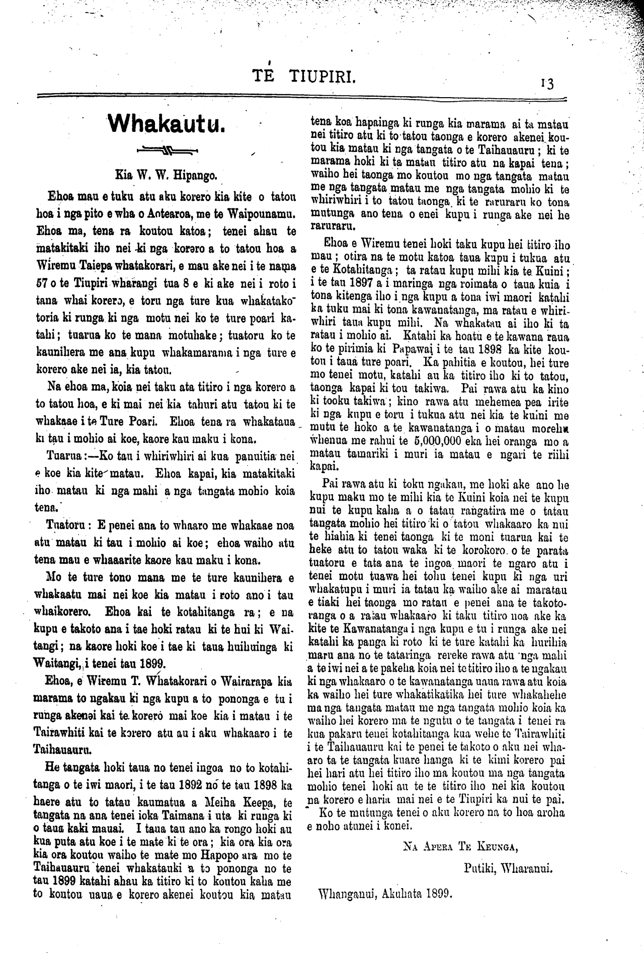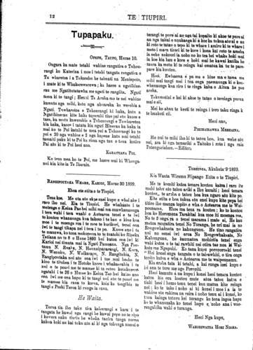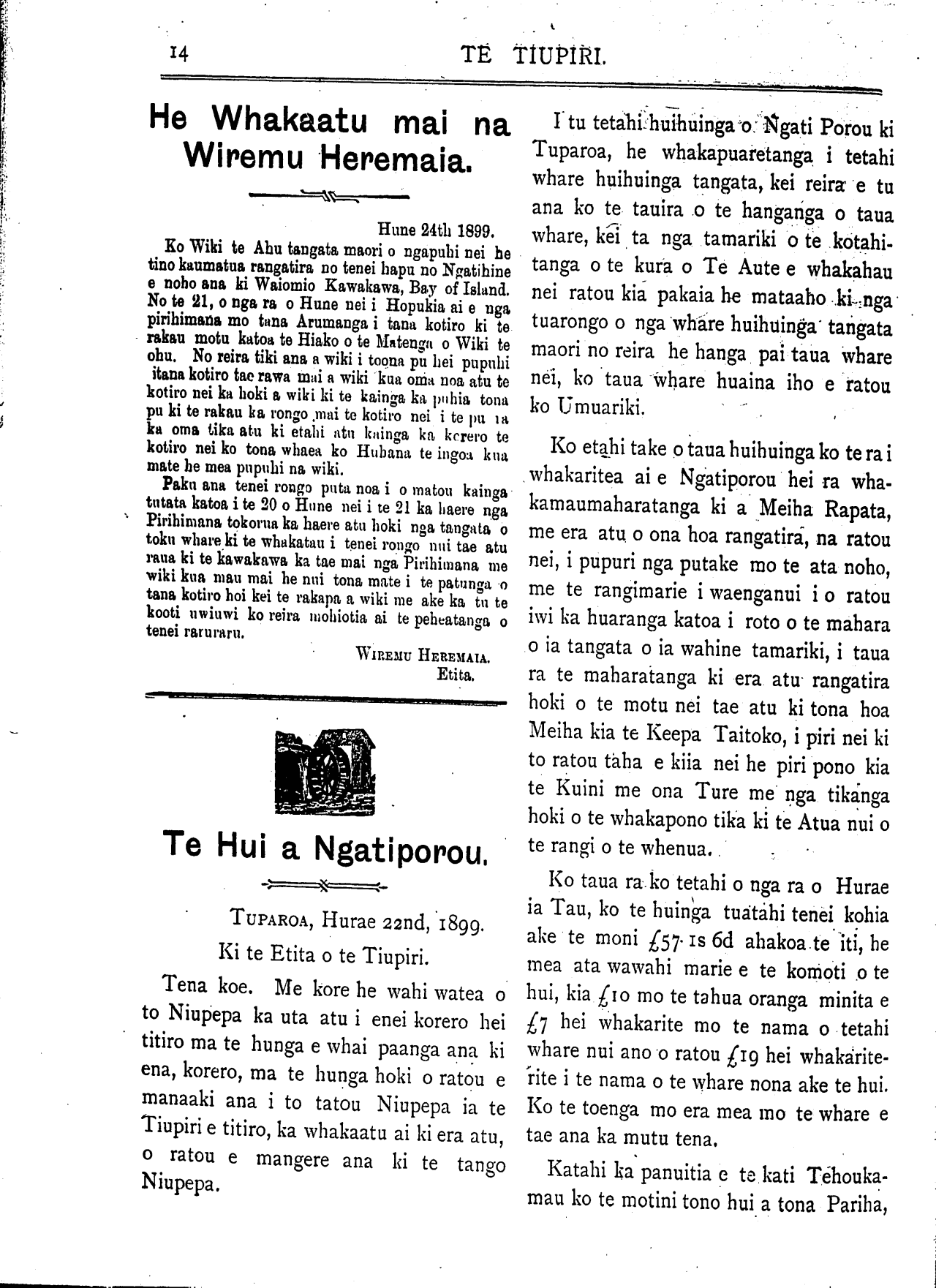 TE TIUPIRI Ngatiporou ERUERA KAWHIA Ko te ripoata tuarua a te Komiti whiri- whiri o Ngatiporou mo runga i te tono hui kawanga whare karakia a te komiti o Hikataurewa o te Wheuki o te Pariha o kahanuiatiki kua whiriwhiria e te komiti tenei tono, a kua kitea e tika ana kia tu he hui ki roto ki taua Pariha, he whaka- aro ki nga taumahatanga e tau ana ki taua Pariha Kua whakahaua au e te komiti kia whakaritea atu ko te tahi o nga ra o Han- uere o te tau o to tatou Ariki 1900 e haere ake kawhia ai taua whare karakia. NA ERUERA KAWHIA Tiamana o te Komiti. I whakaturia ai tenei komiti e te iwi hei komiti e ata whiriwhiria ai he hui mo roto i te tau kotahi, kia kotahi kia rua ranei. He nui no te taimaha o te iwi i te putuputu o nga hui, ko tetahi ma te pena pea e nui ai nga moni kohi hei whakaea i nga hiahia o te iwi o te hapu ranei nana i pohiri te hui. Hori ano kia ora koe te etita.