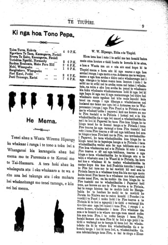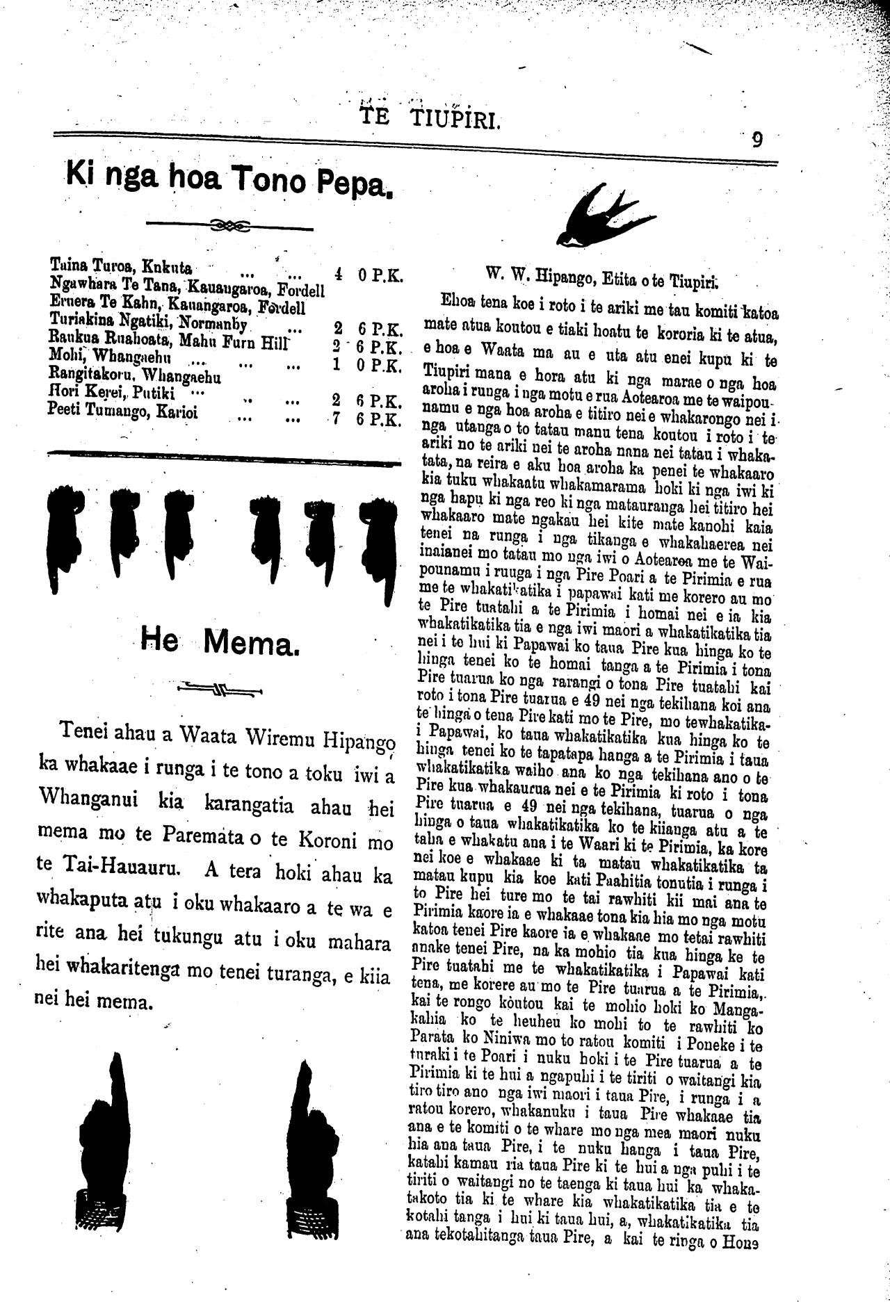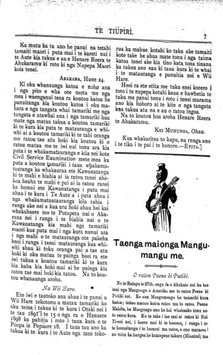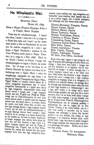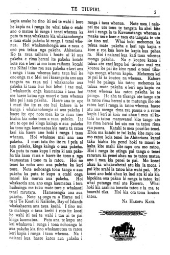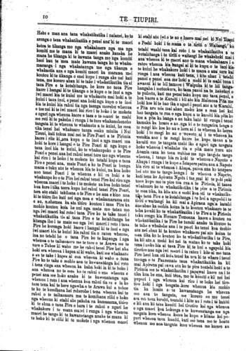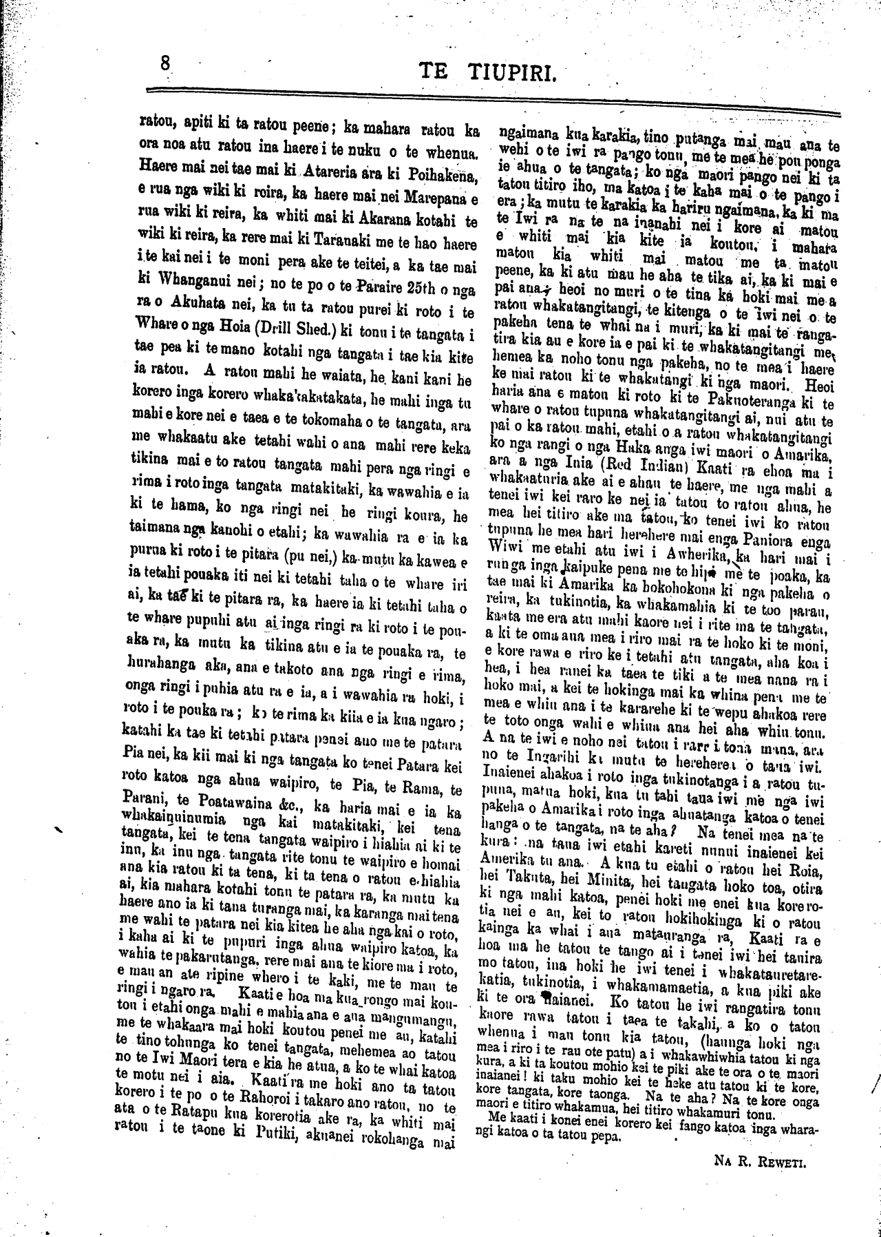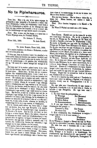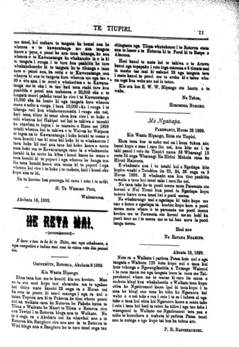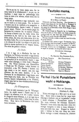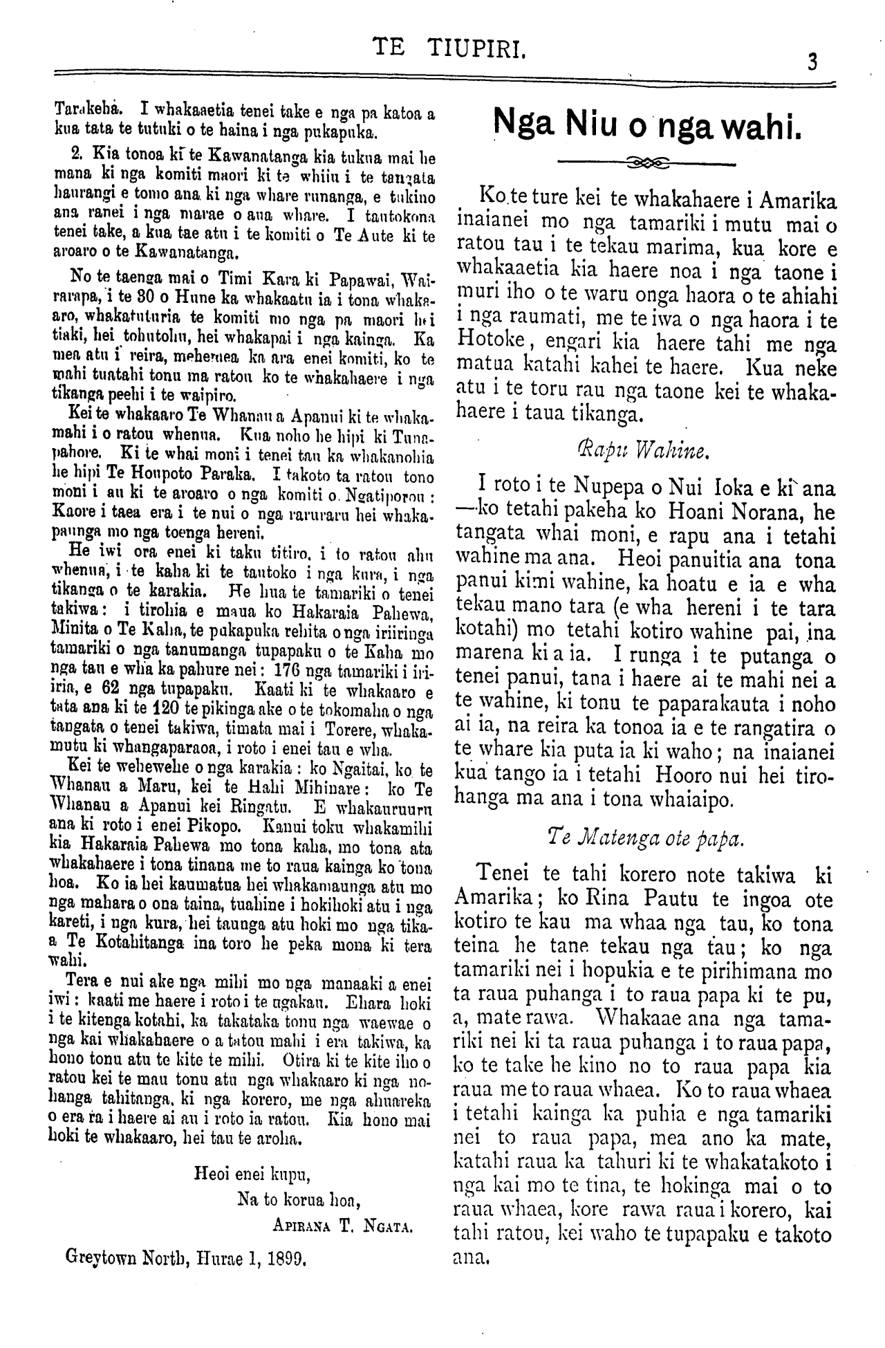 TE TIUPIRI Ngatiporou ERUERA KAWHIA Ko te ripoata tuarua a te Komiti whiri- whiri o Ngatiporou mo runga i te tono hui kawanga whare karakia a te komiti o Hikataurewa o te Wheuki o te Pariha o kahanuiatiki kua whiriwhiria e te komiti tenei tono, a kua kitea e tika ana kia tu he hui ki roto ki taua Pariha, he whaka- aro ki nga taumahatanga e tau ana ki taua Pariha Kua whakahaua au e te komiti kia whakaritea atu ko te tahi o nga ra o Han- uere o te tau o to tatou Ariki 1900 e haere ake kawhia ai taua whare karakia. NA ERUERA KAWHIA Tiamana o te Komiti. I whakaturia ai tenei komiti e te iwi hei komiti e ata whiriwhiria ai he hui mo roto i te tau kotahi, kia kotahi kia rua ranei. He nui no te taimaha o te iwi i te putuputu o nga hui, ko tetahi ma te pena pea e nui ai nga moni kohi hei whakaea i nga hiahia o te iwi o te hapu ranei nana i pohiri te hui. Hori ano kia ora koe te etita.