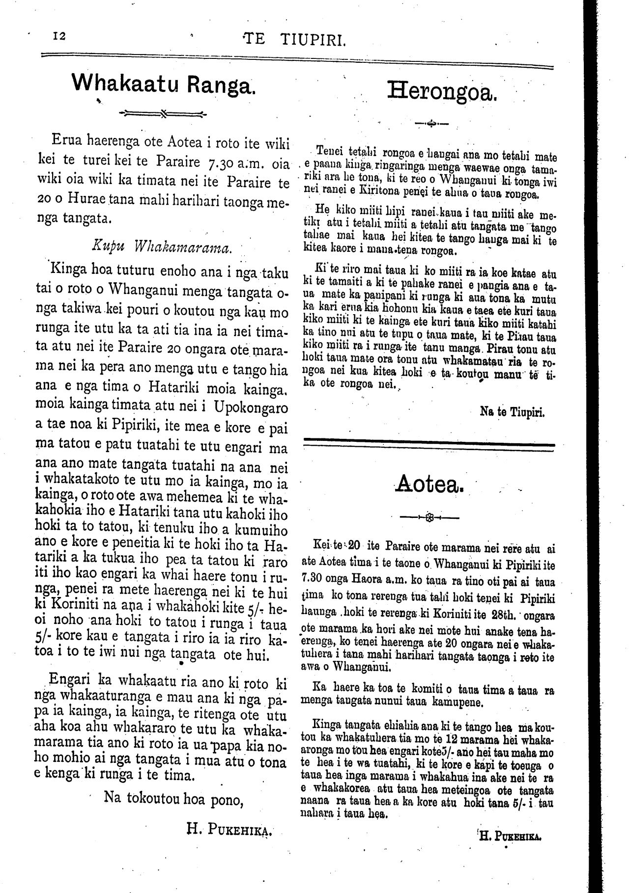 Hipango, Pita te" Rahui, Pehimana te Tua, Hori Pu-