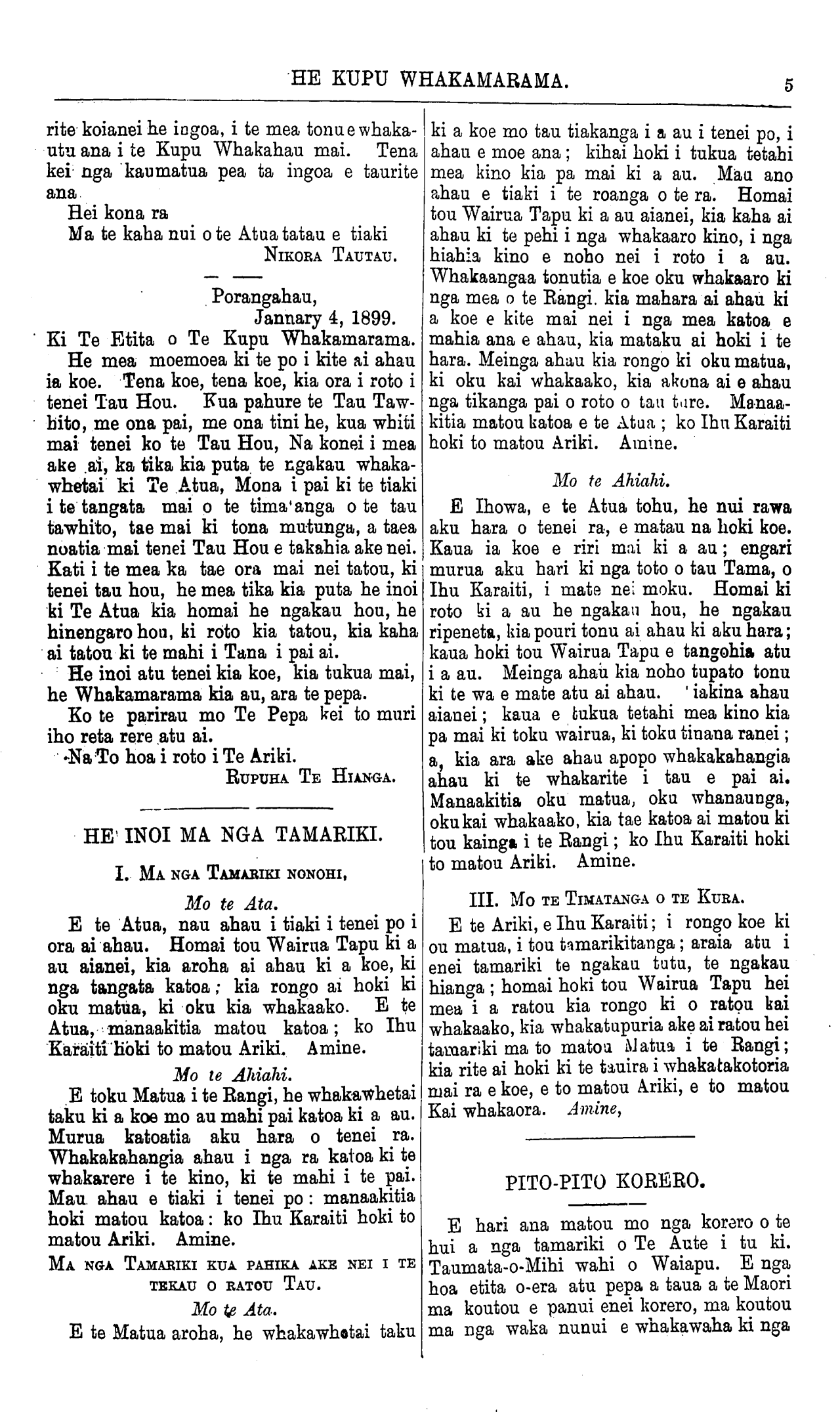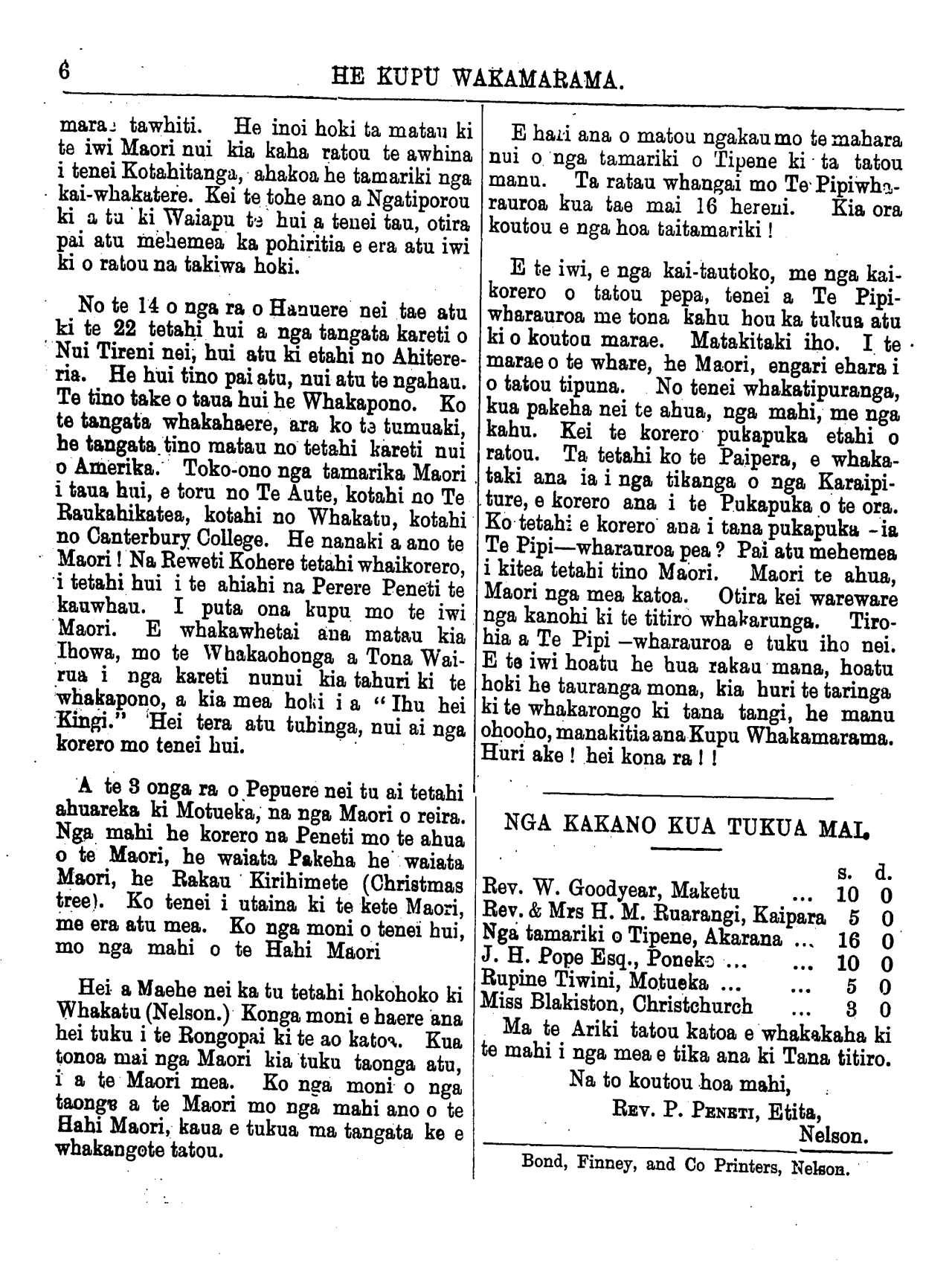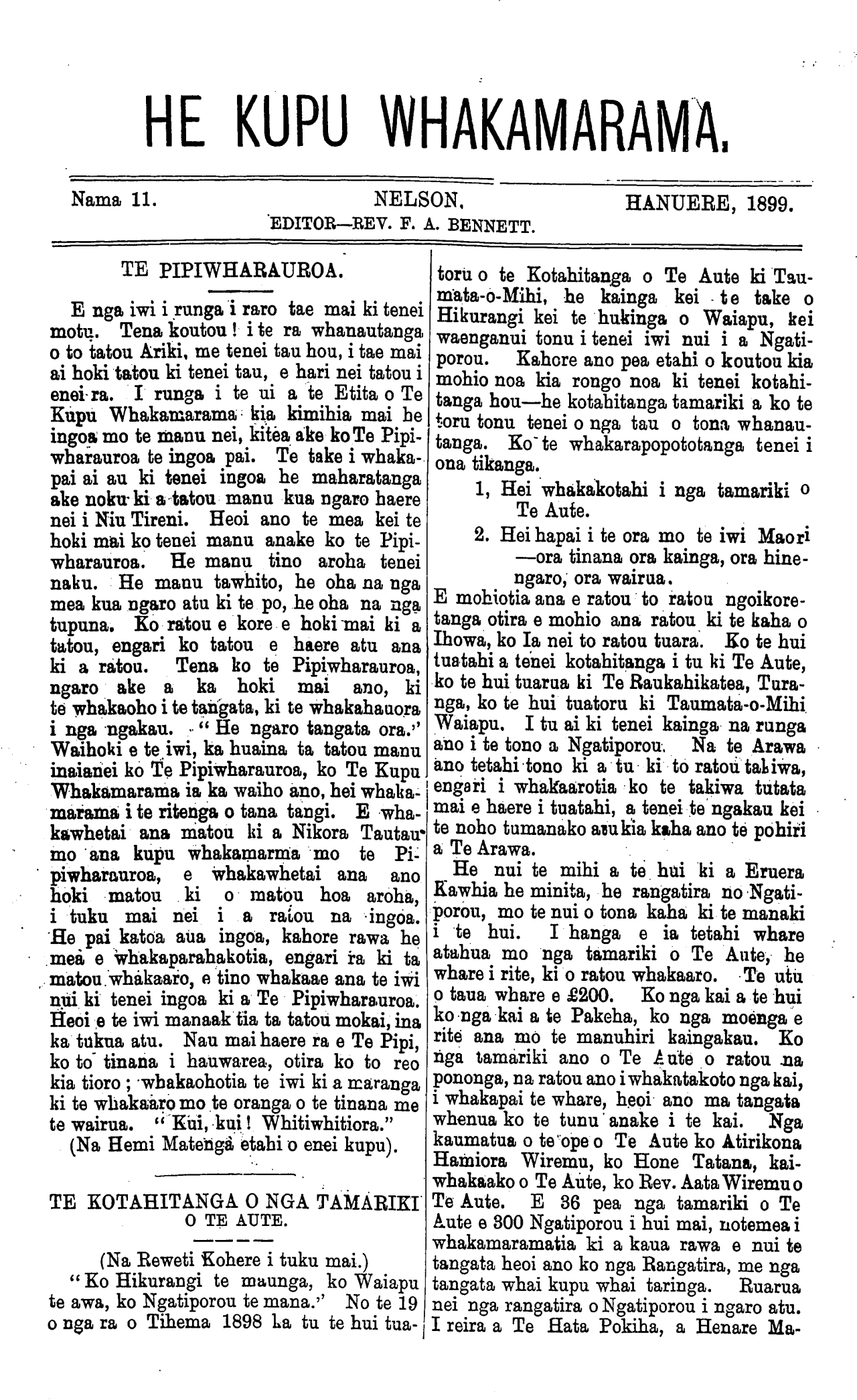 HE KUPU WHAKAMARAMA. Nama 11.NELSON, HANUERE, 1899. EDITOR—REV. F. A. BENNETT. TE PIPIWHARAUROA. E nga iwi i runga i raro tae mai ki tenei motu. Tena koutou ! i te ra whanautanga, o to tatou Ariki, me tenei tau hou, i tae mai ai hoki tatou ki tenei tau, e hari nei tatou i enei ra. I runga i te ui a te Etita o Te Kupu Whakamarama kia kimihia mai he ingoa mo te manu nei, kitea ake ko Te Pipi- wharauroa te ingoa pai. Te take i whaka- pai ai au ki tenei ingoa he maharatanga ake noku ki a tatou manu kua ngaro haere nei i Niu Tireni. Heoi ano te mea kei te hoki mai ko tenei manu anake ko te Pipi- wharauroa. He manu tino aroha tenei naku. He manu tawhito, he oha na nga mea kua ngaro atu ki te po, he oha na nga tupuna. Ko ratou e kore e hokimai ki a tatou, engari ko tatou e haere atu ana ki a ratou. Tena ko te Pipiwharauroa, ngaro ake a ka hoki mai ano, ki te whakaoho i te tangata, ki te whakahauora i nga ngakau. " He ngaro tangata ora.'' Waihoki e te iwi, ka huaina ta tatou manu inaianei ko He Pipiwharauroa, ko Te Kupu Whakamarama ia ka waiho ano, hei whaka- marama i te ritenga o tana tangi. E wha- kawhetai ana matou ki a Nikora Tautau mo ana kupu Whakamarama mo te Pi- piwharauroa, e whakawhetai ana ano hoki matou ki o matou hoa aroha, i tuku mai nei i a ratou na ingoa. He pai katoa aua ingoa, kahore rawa he mea e whakaparahakotia, engari ra ki ta matou whakaaro, e tino whakaae ana te iwi nui ki tenei ingoa ki a Te Pipiwharauroa. Heoi e te iwi manaakitia ta tatou mokai, ina ka tukua atu. Nau mai haere ra e Te Pipi, ko to tinana i hauwarea, otira ko to reo kia tioro ; whakaohotia te iwi ki a maranga ki te whakaaro mo te oranga o te tinana me te wairua. "Kui, kui! Whitiwhitiora." (Na Hemi Matenga etahi o enei kupu). TE KOTAHITANGA O NGA TAMARIKI O TE AUTE. (Na Reweti Kohere i tuku mai.) " Ko Hikurangi te maunga, ko Waiapu te awa, ko Ngatiporou te mana.'' No te 19 o nga ra o Tihema 1898 ka tu te hui tua- toru o te Kotahitanga o Te Aute ki Tau- mata-o-Mihi, he kainga kei te take o Hikurangi kei te hukinga o Waiapu, kei waenganui tonu i tenei iwi nui i a Ngati- porou. Kahore ano pea etahi o koutou kia mohio noa kia rongo noa ki tenei kotahi- tanga hou—he kotahitanga tamariki a ko te toru tonu tenei o nga tau o tona whanau- tanga. Ko te whakarapopototanga tenei i ona tikanga. 1. Hei whakakotahi i nga tamariki ° Te Aute. 2. Hei hapai i te ora mo te iwi Maori —ora tinana ora kainga, ora hine- ngaro, ora wairua. E mohiotia ana e ratou to ratou ngoikore- tanga otira e mohio ana ratou ki te kaha o Ihowa, ko Ia nei to ratou tuara. Ko te hui tuatahi a tenei kotahitanga i tu ki Te Aute, ko te hui tuarua ki Te Raukahikatea, Tura- nga, ko te hui tuatoru ki Taumata-o-Mihi Waiapu. I tu ai ki tenei kainga na runga ano i te tono a Ngatiporou. Na te Arawa ano tetahi tono ki a tu ki to ratou takiwa, engari i whakaarotia ko te takiwa tutata mai e haere i tuatahi, a tenei te ngakau kei te noho tumanako atu kia kaha ano te pohiri a Te Arawa. He nui te mihi a te hui ki a Eruera Kawhia he minita, he rangatira no Ngati- porou, mo te nui o tona kaha ki te manaki i te hui. I hanga e ia tetahi whare atahua mo nga tamariki o Te Aute, he whare i rite, ki o ratou whakaaro. Te utu o taua whare e £200. Ko nga kai a te hui ko nga kai a te Pakeha, ko nga moenga e rite ana mo te manuhiri kaingakau. Ko nga tamariki ano o Te Aute o ratou na pononga, na ratou ano i whakatakoto nga kai, i whakapai te whare, heoi ano ma tangata whenua ko te tunu anake i te kai. Nga kaumatua o te ope o Te Aute ko Atirikona Hamiora Wiremu, ko Hone Tatana, kai- whakaako o Te Aute, ko Rev. Aata Wiremu o Te Aute. E 36 pea nga tamariki o Te Aute e 800 Ngatiporou i hui mai, notemea i whakamaramatia ki a kaua rawa e nui te tangata heoi ano ko nga Rangatira, me nga tangata whai kupu whai taringa. Ruarua nei nga rangatira o Ngatiporou i ngaro atu. I reira a Te Hata Pokiha, a Henare Ma-