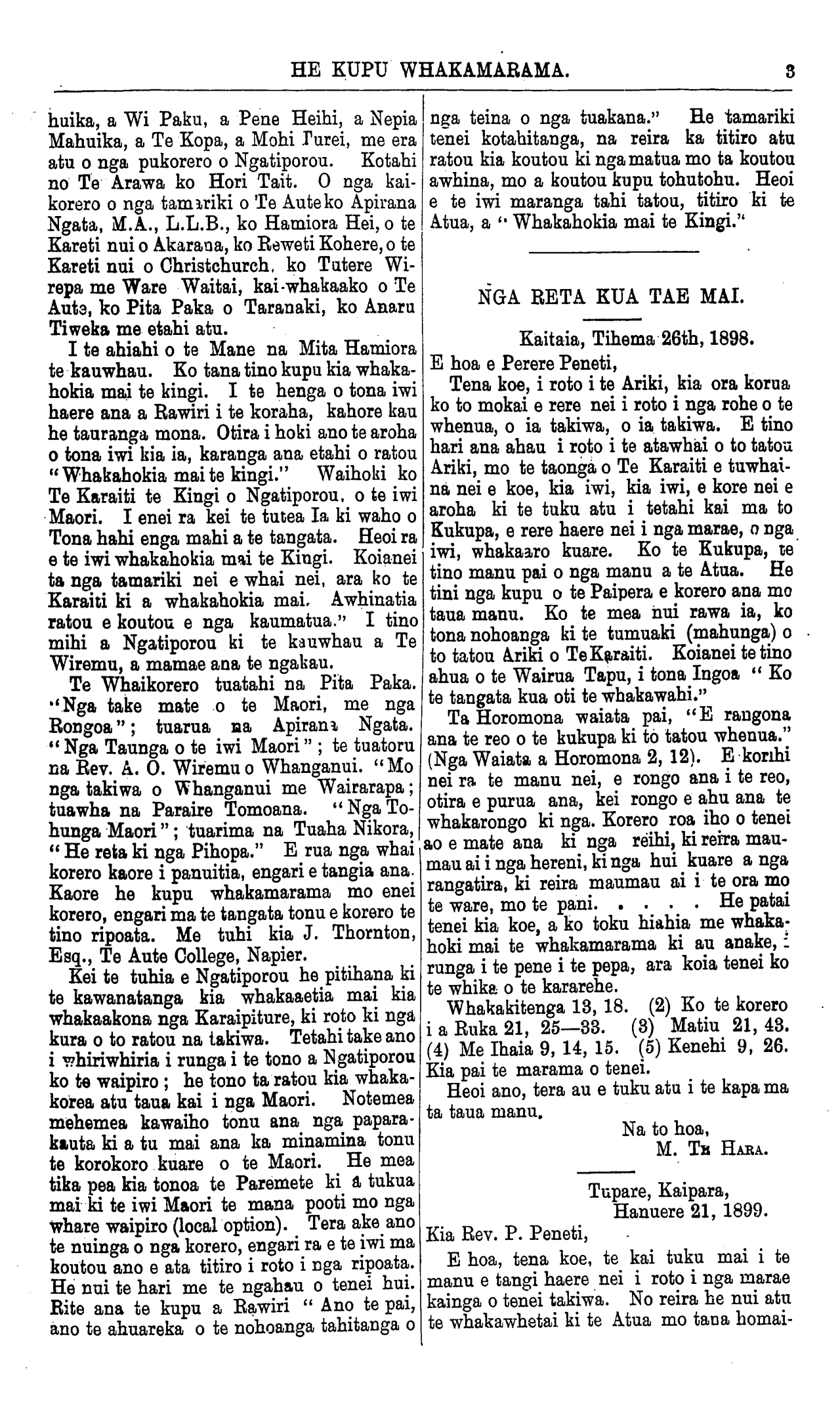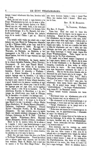HE KUPU WHAKAMARAMA. huika, a Wi Paku, a Pene Heihi, a Nepia Mahuika, a Te Kopa, a Mohi Purei, me era atu o nga pukorero o Ngatiporou. Kotahi no Te Arawa ko Hori Tait. O nga kai- korero o nga tamariki o Te Aute ko Apirana Ngata, M.A., L.L.B., ko Hamiora Hei, o te Kareti nui o Akarana, ko Reweti Kohere, o te Kareti nui o Christchurch, ko Tatere Wi- repa me Ware Waitai, kai-whakaako o Te Auta, ko Pita Paka o Taranaki, ko Anaru Tiweka me etahi atu. I te ahiahi o te Mane na Mita Hamiora te kauwhau. Eo tana tino kupu kia whaka- hokia mai te kingi. I te henga o tona iwi haere ana a Rawiri i te koraha, kahore kau he tauranga mona. Otira i hoki ano te aroha o tona iwi kia ia, karanga ana etahi o ratou " Whakahokia mai te kingi." Waihoki ko Te Karaiti te Kingi o Ngatiporou, o te iwi Maori. I enei ra kei te tutea Ia ki waho o Tona hahi enga mahi a te tangata. Heoi ra e te iwi whakahokia mai te Kingi. Koianei ta nga tamariki nei e whai nei, ara ko te Karaiti ki a whakahokia mai. Awhinatia ratou e koutou e nga kaumatua." I tino mihi a Ngatiporou ki te kauwhau a Te Wiremu, a mamae ana te ngakau. Te Whaikorero tuatahi na Pita Paka. ''Nga take mate o te Maori, me nga Rongoa"; tuarua na Apirana Ngata. " Nga Taunga o te iwi Maori" ; te tuatoru na Rev. A. O. Wiremu o Whanganui. "Mo nga takiwa o Whanganui me Wairarapa; tuawha na Paraire Tomoana. "Nga To- hunga Maori"; tuarima na Tuaha Nikora, " He reta ki nga Pihopa." E rua nga whai korero kaore i panuitia, engari e tangia ana. Kaore he kupu whakamarama mo enei korero, engari ma te tangata tonu e korero te tino ripoata. Me tuhi kia J. Thornton, Esq., Te Aute College, Napier. Kei te tuhia e Ngatiporou he pitihana ki te kawanatanga kia whakaaetia mai kia whakaakona nga Karaipiture, ki roto ki nga kura o to ratou na takiwa. Tetahi take ano i whiriwhiria i runga i te tono a Ngatiporou ko te waipiro ; he tono ta ratou kia whaka- korea atu taua kai i nga Maori. Notemea mehemea kawaiho tonu ana nga papara- kauta ki a tu mai ana ka minamina tonu te korokoro kuare o te Maori. He mea tika pea kia tonoa te Paremete ki & tukua mai ki te iwi Maori te mana pooti mo nga Whare waipiro (local option). Tera ake ano te nuinga o nga korero, engari ra e te iwi ma koutou ano e ata titiro i roto i nga ripoata. He nui te hari me te ngahau o tenei hui. Rite ana te kupu a Rawiri "Ano te pai, ano te ahuareka o te nohoanga tahitanga o nga teina o nga tuakana." He tamariki tenei kotahitanga, na reira ka titiro atu ratou kia koutou ki nga matua mo ta koutou awhina, mo a koutou kupu tohutohu. Heoi e te iwi maranga tahi tatou, titiro ki te Atua, a " Whakahokia mai te Kingi." NGA BETA KUA TAE MAI. Kaitaia, Tihema 26th, 1898. E hoa e Perere Peneti, Tena koe, i roto i te Ariki, kia ora korua ko to mokai e rere nei i roto i nga rohe o te whenua, o ia takiwa, o ia takiwa. E tino hari ana ahau i roto i te atawhai o to tatou Ariki, mo te taonga o Te Karaiti e tuwhai- na nei e koe, kia iwi, kia iwi, e kore nei e aroha ki te tuku atu i tetahi kai ma to Kukupa, e rere haere nei i nga marae, o nga iwi, whakaaro kuare. Ko te Kukupa, te tino manu pai o nga mana a te Atua. He tini nga kupu o te Paipera e korero ana mo taua manu. Ko te mea hui rawa ia, ko tona nohoanga ki te tumuaki (mahunga) o to tatou Ariki o Te Karaiti. Koianei te tino ahua o te Wairua Tapu, i tona Ingoa " Ko te tangata kua oti te whakawahi." Ta Horomona waiata pai, "E rangona ana te reo o te kukupa ki to tatou whenua." (Nga Waiata a Horomona 2, 12). E korihi nei ra te manu nei, e rongo ana i te reo, otira e purua ana, kei rongo e ahu ana te whakarongo ki nga. Korero roa iho o tenei ao e mate ana ki nga reihi, ki reira mau- mau ai i nga hereni, ki nga hui kuare a nga rangatira, ki reira maumau ai i te ora mo te ware, mo te pani. He patai tenei kia koe, a ko toku hiahia me whaka- hoki mai te whakamarama ki au anake, i runga i te pene i te pepa, ara koia tenei ko te whika o te kararehe. Whakakitenga 13, 18. (2) Ko te korero i a Ruka 21, 25—33. (8) Matiu 21, 48. (4) Me Ihaia 9, 14, 15. (5) Kenehi 9, 26. Kia pai te marama o tenei. Heoi ano, tera au e tuku atu i te kapa ma ta taua manu. Na to hoa, M. TE HARA. Tupare, Kaipara, Hanuere 21, 1899. Kia Rev. P. Peneti, E hoa, tena koe, te kai tuku mai i te manu e tangi haere nei i roto i nga marae kainga o tenei takiwa. No reira he nui atu te whakawhetai ki te Atua mo tana homai-