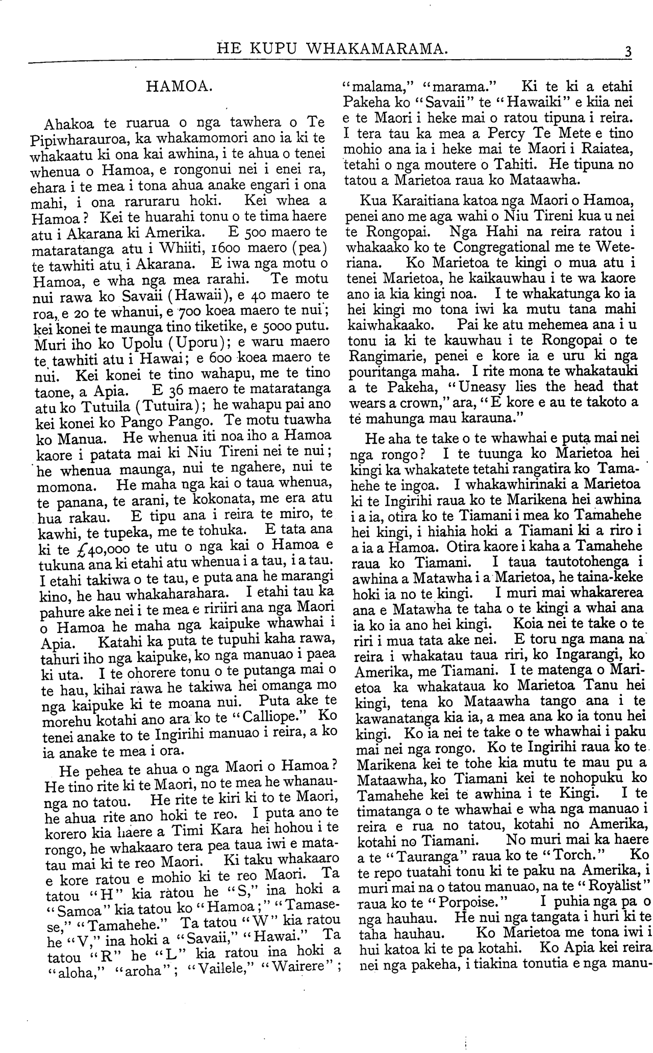 HE KUPU WHAKAMARAMA. HAMOA. Ahakoa te ruarua o nga tawhera o Te Pipiwharauroa, ka whakamomori ano ia ki te whakaatu ki ona kai awhina, i te ahua o tenei whenua o Hamoa, e rongonui nei i enei ra, ehara i te mea i tona ahua anake engari i ona mahi, i ona raruraru hoki. Kei whea a Hamoa ? Kei te huarahi tonu o te tima haere atu i Akarana ki Amerika. E 500 maero te mataratanga atu i Whiiti, 1600 maero (pea) te tawhiti atu i Akarana. E iwa nga motu o Hamoa, e wha nga mea rarahi. Te motu nui rawa ko Savaii (Hawaii), e 40 maero te roa, e 20 te whanui, e 700 koea maero te nui'; kei konei te maunga tino tiketike, e 5000 putu. Muri iho ko Upolu (Uporu); e waru maero te tawhiti atu i Hawai; e 600 koea maero te nui. Kei konei te tino wahapu, me te tino taone, a Apia. E 36 maero te mataratanga atu ko Tutuila (Tutuira); he wahapu pai ano kei konei ko Pango Pango. Te motu tuawha ko Manua. He whenua iti noa iho a Hamoa kaore i patata mai ki Niu Tireni nei te nui; he whenua maunga, nui te ngahere, nui te momona. He maha nga kai o taua whenua, te panana, te arani, te kokonata, me era atu hua rakau. E tipu ana i reira te miro, te kawhi, te tupeka, me te tohuka. E tata ana ki te £40,000 te utu o nga kai o Hamoa e tukuna ana ki etahi atu whenua i a tau, i a tau. I etahi takiwa o te tau, e puta ana he marangi kino, he hau whakaharahara. I etahi tau ka pahure ake nei i te mea e ririiri ana nga Maori o Hamoa he maha nga kaipuke whawhai i Apia. Katahi ka puta te tupuhi kaha rawa, tahuri iho nga kaipuke, ko nga manuao i paea ki uta. I te ohorere tonu o te putanga mai o te hau, kihai rawa he takiwa hei omanga mo nga kaipuke ki te moana nui. Puta ake te morehu kotahi ano ara ko te " Calliope." Ko tenei anake to te Ingirihi manuao i reira, a ko ia anake te mea i ora. He pehea te ahua o nga Maori o Hamoa ? He tino rite ki te Maori, no te mea he whanau- nga no tatou. He rite te kiri ki to te Maori, he ahua rite ano hoki te reo. I puta ano te korero kia haere a Timi Kara hei hohou i te rongo, he whakaaro tera pea taua iwi e mata- tau mai ki te reo Maori. Ki taku whakaaro e kore ratou e mohio ki te reo Maori. Ta tatou "H" kia ratou he "S," ina hoki a " Samoa" kia tatou ko " Hamoa;" " Tamase- se," " Tamahehe." Ta tatou " W " kia ratou he "V," ina hoki a "Savaii," "Hawai." Ta tatou "R" he "L" kia ratou ina hoki a "aloha," "aroha"; "Vailele," "Wairere" ; "malama," "marama." Ki te ki a etahi Pakeha ko "Savaii" te "Hawaiki" e kiia nei e te Maori i heke mai o ratou tipuna i reira. I tera tau ka mea a Percy Te Mete e tino mohio ana ia i heke mai te Maori i Raiatea, tetahi o nga moutere o Tahiti. He tipuna no tatou a Marietoa raua ko Mataawha. Kua Karaitiana katoa nga Maori o Hamoa, penei ano me aga wahi o Niu Tireni kua u nei te Rongopai. Nga Hahi na reira ratou i whakaako ko te Congregational me te Wete- riana. Ko Marietoa te kingi o mua atu i tenei Marietoa, he kaikauwhau i te wa kaore ano ia kia kingi noa. I te whakatunga ko ia hei kingi mo tona iwi ka mutu tana mahi kaiwhakaako. Pai ke atu mehemea ana i u tonu ia ki te kauwhau i te Rongopai o te Rangimarie, penei e kore ia e uru ki nga pouritanga maha. I rite mona te whakatauki a te Pakeha, "Uneasy lies the head that wears a crown," ara, " E kore e au te takoto a te mahunga mau karauna." He aha te take o te whawhai e puta mai nei nga rongo? I te tuunga ko Marietoa hei kingi ka whakatete tetahi rangatira ko Tama- hehe te ingoa. I whakawhirinaki a Marietoa ki te Ingirihi raua ko te Marikena hei awhina i a ia, otira ko te Tiamani i mea ko Tamahehe hei kingi, i hiahia hoki a Tiamani ki a riro i a ia a Hamoa. Otira kaore i kaha a Tamahehe raua ko Tiamani. I taua tautotohenga i awhina a Matawha i a Marietoa, he taina-keke hoki ia no te kingi. I muri mai whakarerea ana e Matawha te taha o te kingi a whai ana ia ko ia ano hei kingi. Koia nei te take o te riri i mua tata ake nei. E toru nga mana na reira i whakatau taua riri, ko Ingarangi, ko Amerika, me Tiamani. I te matenga o Mari- etoa ka whakataua ko Marietoa Tanu hei kingi, tena ko Mataawha tango ana i te kawanatanga kia ia, a mea ana ko ia tonu hei kingi. Ko ia nei te take o te whawhai i paku mai nei nga rongo. Ko te Ingirihi raua ko te Marikena kei te tohe kia mutu te mau pu a Mataawha, ko Tiamani kei te nohopuku ko Tamahehe kei te awhina i te Kingi. I te timatanga o te whawhai e wha nga manuao i reira e rua no tatou, kotahi no Amerika, kotahi no Tiamani. No muri mai ka haere a te "Tauranga" raua ko te "Torch." Ko te repo tuatahi tonu ki te paku na Amerika, i muri mai na o tatou manuao, na te " Royalist" raua ko te " Porpoise." I puhia nga pa o nga hauhau. He nui nga tangata i huri ki te taha hauhau. Ko Marietoa me tona iwi i hui katoa ki te pa kotahi. Ko Apia kei reira nei nga pakeha, i tiakina tonutia e nga manu-