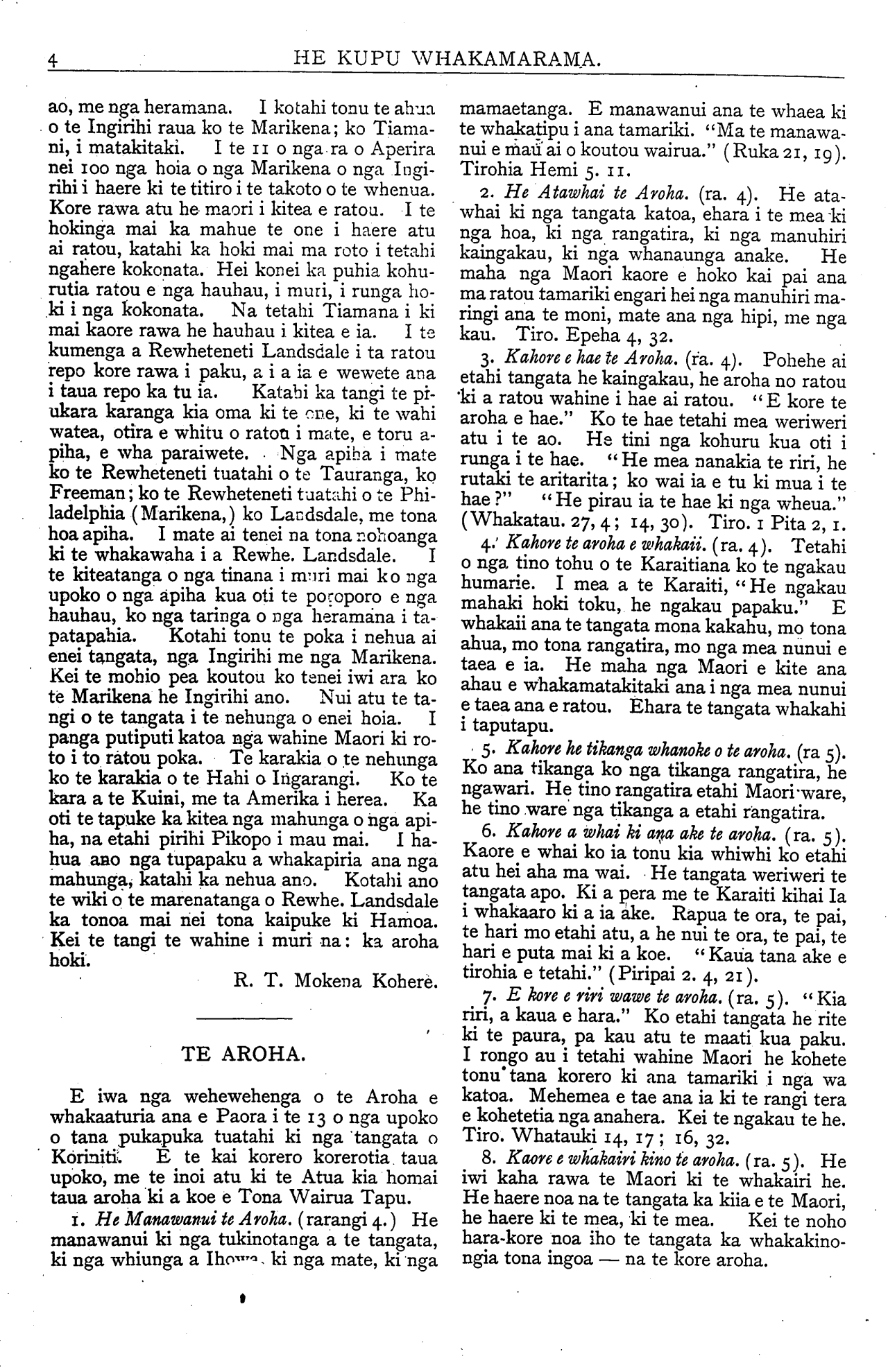 HE KUPU WHAKAMARAMA ao, me nga heramana. I kotahi tonu te ahua o te Ingirihi raua ko te Marikena; ko Tiama- ni, i matakitaki. I te 11 o nga ra o Aperira nei 100 nga hoia o nga Marikena o nga Ingi- rihi i haere ki te titiro i te takoto o te whenua. Kore rawa atu he maori i kitea e ratou. I te hokinga mai ka mahue te one i haere atu ai ratou, katahi ka hoki mai ma roto i tetahi ngahere kokonata. Hei konei ka puhia kohu- rutia ratou e nga hauhau, i muri, i runga ho- .ki i nga kokonata. Na tetahi Tiamana i ki mai kaore rawa he hauhau i kitea e ia. I te kumenga a Rewheteneti Landsdale i ta ratou repo kore rawa i paku, a i a ia e wewete ana i taua repo ka tu ia. Katahi ka tangi te pi- ukara karanga kia oma ki te ene, ki te wahi watea, otira e whitu o ratou i mate, e toru a- piha, e wha paraiwete. • Nga apiha i mate ko te Rewheteneti tuatahi o te Tauranga, ko Freeman; ko te Rewheteneti tuatahi o te Phi- ladelphia (Marikena,) ko Landsdale, me tona hoa apiha. I mate ai tenei na tona nohoanga ki te whakawaha i a Rewhe. Landsdale. I te teteatanga o nga tinana i muri mai ko nga upoko o nga apiha kua oti te poroporo e nga hauhau, ko nga taringa o nga heramana i ta- patapahia. Kotahi tonu te poka i nehua ai enei tangata, nga Ingirihi me nga Marikena. Kei te mohio pea koutou ko tenei iwi ara ko te Marikena he Ingirihi ano. Nui atu te ta- ngi o te tangata i te nehunga o enei hoia. I panga putiputi katoa nga wahine Maori ki ro- to i to ratou poka. Te karakia o te nehunga ko te karakia o te Hahi o Ingarangi. Ko te kara a te Kuini, me ta Amerika i herea. Ka oti te tapuke ka kitea nga mahunga o nga api- ha, na etahi pirihi Pikopo i mau mai. I ha- hua ano nga tupapaku a whakapiria ana nga mahunga, katahi ka nehua ano. Kotahi ano te wiki o te marenatanga o Rewhe. Landsdale ka tonoa mai nei tona kaipuke ki Hamoa. Kei te tangi te wahine i muri na: ka aroha hoki. R. T. Mokena Kohere. / TE AROHA. E iwa nga wehewehenga o te Aroha e whakaaturia ana e Paora i te 13 o nga upoko o tana pukapuka tuatahi ki nga tangata o Koriniti'. E te kai korero korerotia taua upoko, me te inoi atu ki te Atua kia homai taua aroha ki a koe e Tona Wairua Tapu. 1. He Manawanui te Aroha. (rarangi 4.) He manawanui ki nga tukinotanga a te tangata, ki nga whiunga a Ihowa ki nga mate, ki nga mamaetanga. E manawanui ana te whaea ki te whakatipu i ana tamariki. "Ma te manawa- nui e mau ai o koutou wairua." (Ruka 21, 19). Tirohia Hemi 5. 11. 2. He Atawhai te Aroha, (ra. 4). He ata- whai ki nga tangata katoa, ehara i te mea -ki nga hoa, ki nga rangatira, ki nga manuhiri kaingakau, ki nga whanaunga anake. He maha nga Maori kaore e hoko kai pai ana ma ratou tamariki engari hei nga manuhiri ma- ringi ana te moni, mate ana nga hipi, me nga kau. Tiro. Epeha 4, 32. 3. Kahore e hae te Aroha, (ra. 4). Pohehe ai etahi tangata he kaingakau, he aroha no ratou 'ki a ratou wahine i hae ai ratou. " E kore te aroha e hae." Ko te hae tetahi mea weriweri atu i te ao. He tini nga kohuru kua oti i runga i te hae. " He mea nanakia te riri, he rutaki te aritarita; ko wai ia e tu ki mua i te hae ?" " He pirau ia te hae ki nga wheua." (Whakatau. 27, 4; 14, 30). Tiro, 1 Pita 2, 1. 4.' Kahore te aroha e whakaii, (ra. 4). Tetahi o nga tino tohu o te Karaitiana ko te ngakau humarie. I mea a te Karaiti, "He ngakau mahaki hoki toku, he ngakau papaku." E whakaii ana te tangata mona kakahu, mo tona ahua, mo tona rangatira, mo nga mea nunui e taea e ia. He maha nga Maori e kite ana ahau e whakamatakitaki ana i nga mea nunui e taea ana e ratou. Ehara te tangata whakahi i taputapu. 5. Kahore he tikanga whanoke o te aroha, (ra 5). Ko ana tikanga ko nga tikanga rangatira, he ngawari. He tino rangatira etahi Maori ware, he tino .ware nga tikanga a etahi rangatira. 6. Kahore a whai ki ana ake te aroha, (ra. 5). Kaore e whai ko ia tonu kia whiwhi ko etahi atu hei aha ma wai. He tangata weriweri te tangata apo. Ki a pera me te Karaiti kihai Ia i whakaaro ki a ia ake. Rapua te ora, te pai, te hari mo etahi atu, a he nui te ora, te pai, te hari e puta mai ki a koe. " Kaua tana ake e tirohia e tetahi." (Piripai 2. 4, 21). 7. E kore e riri wawe te aroha, (ra. 5). " Kia riri, a kaua e hara." Ko etahi tangata he rite ki te paura, pa kau atu te maati kua paku. I rongo au i tetahi wahine Maori he kohete tonu tana korero ki ana tamariki i nga wa katoa. Mehemea e tae ana ia ki te rangi tera e kohetetia nga anahera. Kei te ngakau te he. Tiro. Whatauki 14, 17 ; 16, 32. 8. Kaore e whakairi kino te aroha. (ra. 5). He iwi kaha rawa te Maori ki te whakairi he. He haere noa na te tangata ka kiia e te Maori, he haere ki te mea, ki te mea. Kei te noho hara-kore noa iho te tangata ka whakakino- ngia tona ingoa — na te kore aroha.