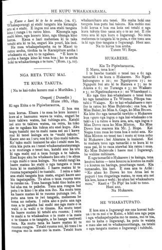 HE KUPU WHAKAMARAMA. o. Kaore e hari ki te he te aroha, (ra. 6). Whakaporangi ai etahi tangata kia katangia atu ai e etahi. E ingoa nui ana etahi tangata kino i runga i to ratou kino. Kinongia nga mahi kino, nga korero kino, nga tikanga kino katoa. Kaua e hari mehemea ki te taka tetahi atu ki te he, engari kia pouri, kia inoi. He mea whakapehapeha na te Maori to ratou aroha, tirohia ta te Karaipiture aroha i whakaatu ai, ara to te ngakau. " E kore te aroha e hanga kino ki tona hoa; ko te aroha hoki te whakaritenga o te ture." (Rom. 13, 10). NGA RETA TUKU MAI. TE KURA TAKUTA. ( Na te kai-tuku korero mai o Murihiku. ) Otepoti ( Dunedin ) Hune 18th, 1899. Ki nga Etita o te Pipiwharauroa, E hoa ma tena korua. Ehara i te mea he kore korero i kore ai e hamumu wawe te waha, engari he kore takiwa watea, hai tuhinga atu. Katahi nei ano te takiwa watea, na reira, ka toko ake te ngakau kia tukua atu enei kupu. Aku kupu tuatahi mo te mahi nana nei au i kawe mai ki tenei kainga ara te "mahi takuta." Kaore ano au i uru noa ki te tino mahi takuta. Ko taku mahi inaianei he ako i etahi mea ke, otira kia puta au i tenei whakamatautauranga a te mutunga o tenei tau, katahi ano ka uru ki nga mahi nui a taua hunga a te takuta. Enei kupu aku he whakaatu kau atu i te ahua o nga mahi o taua kainga. No tetahi rangi ka haere matau ko etahi o nga tangata o taua kura ki te matakitaki. I haere matau ki te ruuma tapatapahi i te tuatahi. I reira e tako ana etahi tangata kua mate, engari kaore ano kia tapatapahia. Te ahua o taua ruuma tena te rereke na. Tona haunga hoki tino kaha atu hai aha ma te pakeha. Tena ana rongoa hai patu i te kino i te aha noa iho. Ka mutu tena ka haere matau ki te ruuma putunga iwi. E putu ana tera te iwi tangata, mehemea he toma no nehera. I reira ano e putu ana nga mea a te pakeha hai mahi mo nga mate o ia wahi o ia wahi o te tinana. Ka mutu tenei ka haere matau ki tetahi atu ruuma: I reira te mahi a te whakaahua o ia mate o ia mate o te tinana o te tangata, a he hanga wetiweti tera. Ka mutu tena ka haere matau ki te ruuma rongoa. Tetahi ruuma nui, kii tonu i te rongoa mo ia mate mo ia mate. Tetahi kura whakamiharo atu tenei. He maha hoki ona tangata kua puta hai takuta. Kia mohio mai hoki korua e hoa ma koia nei tetahi o nga kura takuta tino uaua atu o te ao nei. E rite tonu ana ki nga kura o Ingarangi. No reira mehemea te tangata ki te puta, e rite tonu ana ia ki nga tino tangata o Ingarangi. Heoi ano. Na to korua hoa aroha. Tutere Wi Repa. HUKARERE. Kia Te Pipiwharauroa, E Manu, tena koe ! I te hawhe tuatahi o tenei tau e 61 nga tamariki i te kura o Hukarere. No Ngati- kahungunu e 22; no Ngatiporou 17; no Ngapuhi hui atu ki te Rarawa e 7; no te Arawa e 6; no Turanga e 3; no Waikato e 3 ; no Ngatiraukawa e 2 : no Wharekauri 1. Ko nga tino kai-whakahaere o tenei kura ko nga tamahine a Te Wiremu, Pihopa tua- tahi o Waiapu. Ko te kai-whakahaere o raro iho ia ratou ko Miss Bulstrode; ona hoa, ko Miss Baker, ko Miss A. Gage, ko Miss Brown. Ka kite iho nga tamariki tawhito o Hukarere kua ngaro nga ingoa o nga kai-whakaako o te takiwa i a ratou e kura ana, ara, nga ingoa o Miss Down raua ko Miss Minton. Ko Miss Down kua marena kia Mr. J. Hope. Kei Nepia tonu raua ko tona hoa e noho ana. Ko Miss Minton no tenei tau i mutu ai tona noho ki Hukarere ; kei Akarana ia inaianei. Kei te mahara tonu nga tamariki o te kura ki to raua pai, ki to raua atawhai kia ratou i mua. Ko Miss Bulstrode i haere mai i Ingarangi, he wahine mihinare. E nga tamariki o Hukarere i te kainga, tena koutou katoa — tena koutou ia koutou na mahi i o koutou na haringa, pouritanga ranei. Kia tumanako, kia hari. E mea ana te Ariki: "Ko ahau ko Ihowa ko tou Atua kei te pupuri i tou ringaringa matau, te mea atu nei kia koe, kaua e wehi; ko ahau hei whakaahuru mou," Kaati e ' Te Pipi' ka hoki to tono. Heoi ano. Na Hukarere. HE WHAKATUPATO. E koa ana a Ingarangi me ona koroni huh- ua i te ra nui o te Kuini, e kikii ana nga pepa i nga whakapehapeha mo te mana, mo te toa, mo te kaha o Ingarangi, ka puta te waiata e mau ake nei te whakamaoritanga, na tetahi o nga tangata matau o Ingarangi i tuhituhi.