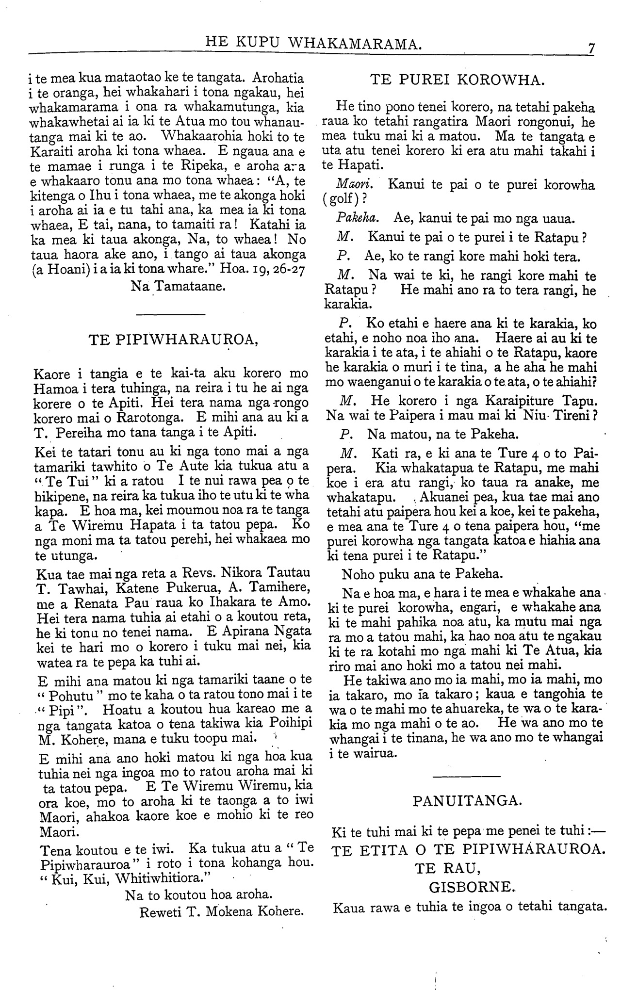 HE KUPU WHAKAMARAMA. i te mea kua mataotao ke te tangata. Arohatia i te oranga, hei whakahari i tona ngakau, hei whakamarama i ona ra whakamutunga, kia whakawhetai ai ia ki te Atua mo tou whanau- tanga mai ki te ao. Whakaarohia hoki to te Karaiti aroha ki tona whaea. E ngaua ana e te mamae i runga i te Ripeka, e aroha ara e whakaaro tonu ana mo tona whaea: "A, te kitenga o Ihu i tona whaea, me te akonga hoki i aroha ai ia e tu tahi ana, ka mea ia ki tona whaea, E tai, nana, to tamaiti ra! Katahi ia ka mea ki taua akonga, Na, to whaea! No taua haora ake ano, i tango ai taua akonga (a Hoani) i a ia ki tona whare." Hoa. 19,26-27 Na Tamataane. TE PIPIWHARAUROA, Kaore i tangia e te kai-ta aku korero mo Hamoa i tera tuhinga, na reira i tu he ai nga korere o te Apiti, Hei tera nama nga -rongo korero mai o Rarotonga. E mihi ana au ki a T. Pereiha mo tana tanga i te Apiti. Kei te tatari tonu au ki nga tono mai a nga tamariki tawhito o Te Aute kia tukua atu a "Te Tui" ki a ratou I te nui rawa pea o te hikipene, na reira ka tukua iho te utu ki te wha kapa. E hoa ma, kei moumou noa ra te tanga a Te Wiremu Hapata i ta tatou pepa. Ko nga moni ma ta tatou perehi, hei whakaea mo te utunga. Kua tae mai nga reta a Revs. Nikora Tautau T. Tawhai, Katene Pukerua, A. Tamihere, me a Renata Pau raua ko Ihakara te Amo. Hei tera nama tuhia .ai etahi o a koutou reta, he ki tona no tenei nama. E Apirana Ngata kei te hari mo o korero i tuku mai nei, kia watea ra te pepa ka tuhi ai. E mihi ana matou ki nga tamariki taane o te " Pohutu " mo te kaha o ta ratou tono mai i te " Pipi". Hoatu a koutou hua kareao me a nga tangata katoa o tena takiwa kia Poihipi M. Kohere, mana e tuku toopu mai, E mihi ana ano hoki matou ki nga hoa kua tuhia nei nga ingoa mo to ratou aroha mai ki ta tatou pepa. E Te Wiremu Wiremu, kia ora koe, mo to aroha ki te taonga a to iwi Maori, ahakoa kaore koe e mohio ki te reo Maori. Tena koutou e te iwi. Ka tukua atu a " Te Pipiwharauroa" i roto i tona kohanga hou. " Kui, Kui, Whitiwhitiora." Na to koutou hoa aroha. Reweti T. Mokena Kohere. TE PUREI KOROWHA. He tino pono tenei korero, na tetahi pakeha raua ko tetahi rangatira Maori rongonui, he mea tuku mai ki a matou. Ma te tangata e uta atu tenei korero ki era atu mahi takahi i te Hapati. Maori. Kanui te pai o te purei korowha (golf)? Pakeha. Ae, kanui te pai mo nga uaua. M. Kanui te pai o te purei i te Ratapu ? P. Ae, ko te rangi kore mahi hoki tera. M. Na wai te ki, he rangi kore mahi te Ratapu ? He mahi ano ra to tera rangi, he karakia. P. Ko etahi e haere ana ki te karakia, ko etahi, e noho noa iho ana. Haere ai au ki te karakia i te ata, i te ahiahi o te Ratapu, kaore he karakia o muri i te tina, a he aha he mahi mo waenganui o te karakia o te ata, o te ahiahi? M. He korero i nga Karaipiture Tapu. Na wai te Paipera i mau mai ki Niu Tireni ? P. Na matou, na te Pakeha. M. Kati ra, e ki ana te Ture 4 o to Pai- pera. Kia whakatapua te Ratapu, me mahi koe i era atu rangi, ko taua ra anake, me whakatapu. , Akuanei pea, kua tae mai ano tetahi atu paipera hou kei a koe, kei te pakeha, e mea ana te Ture 4 o tena paipera hou, "me purei korowha nga tangata katoa e hiahia ana ki tena purei i te Ratapu." Noho puku ana te Pakeha. Na e hoa ma, e hara i te mea e whakahe ana • ki te purei korowha, engari, e whakahe ana ki te mahi pahika noa atu, ka mutu mai nga ra mo a tatou mahi, ka hao noa atu te ngakau ki te ra kotahi mo nga mahi ki Te Atua, kia riro mai ano hoki mo a tatou nei mahi. He takiwa ano mo ia mahi, mo ia mahi, mo ia takaro, mo ia takaro; kaua e tangohia te wa o te mahi mo te ahuareka, te wa o te kara- kia mo nga mahi o te ao. He wa ano mo te whangai i te tinana, he wa ano mo te whangai i te wairua. PANUITANGA. Ki te tuhi mai ki te pepa me penei te tuhi:— TE ETITA O TE PIPIWHARAUROA. TE RAU, GISBORNE. Kaua rawa e tuhia te ingoa o tetahi tangata.