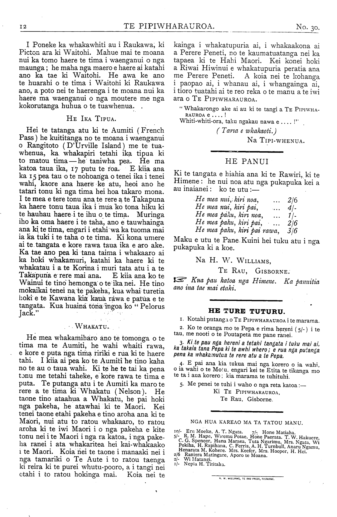 M. W. WILLIAMS, TE RAU PRESS, GISBORNE.