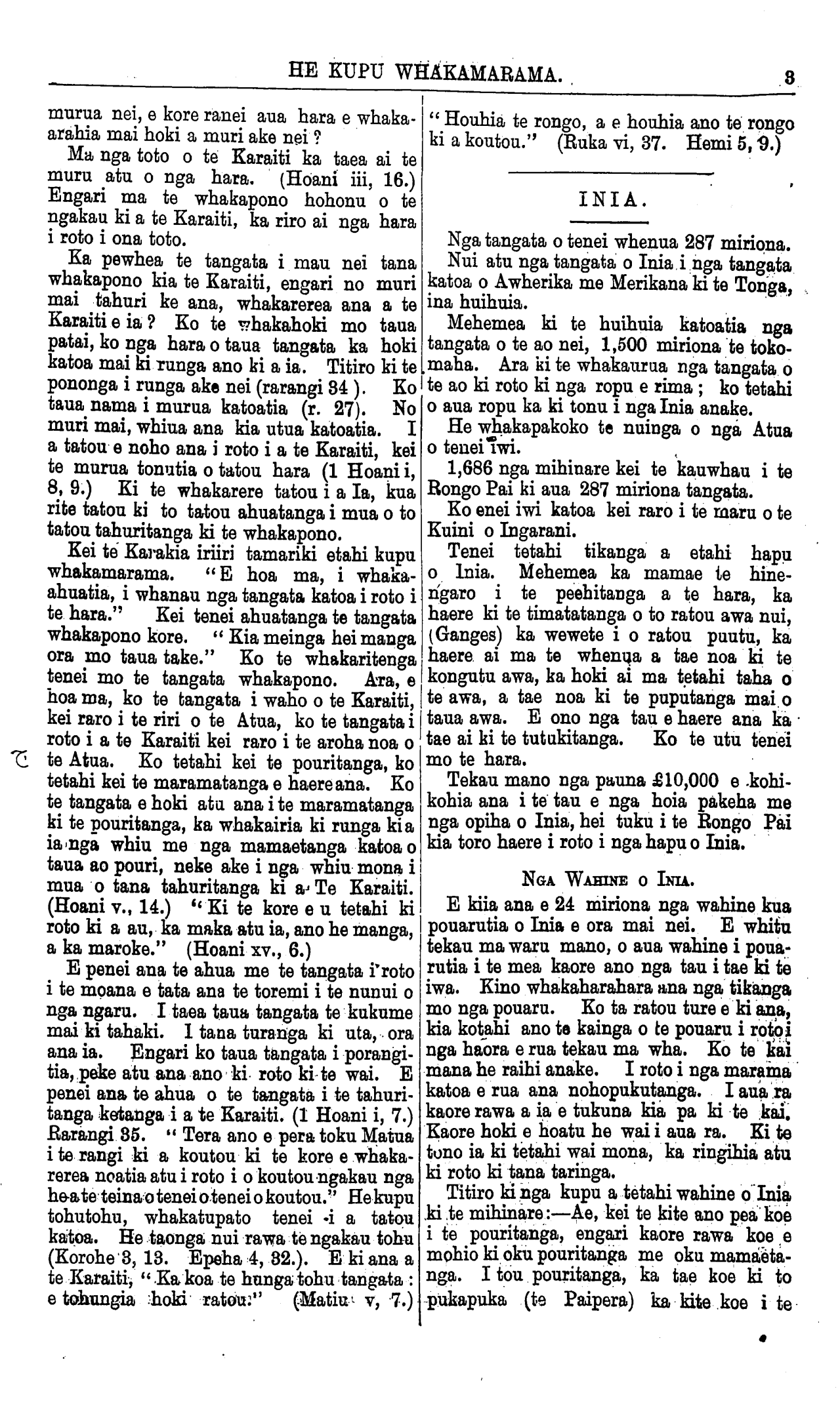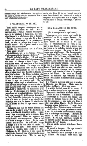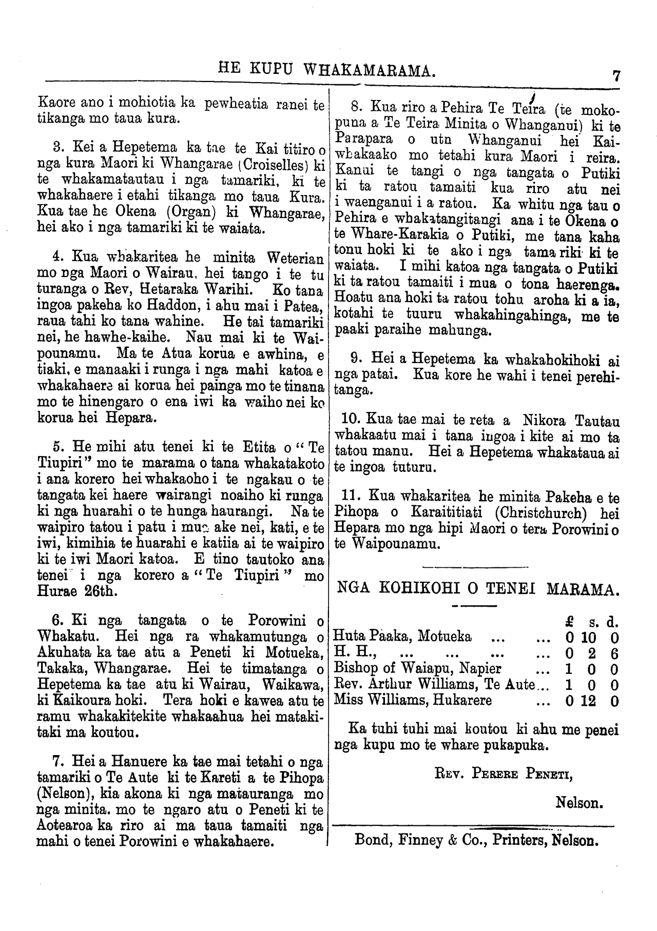 HE KUPU WHAKAMARAMA. Kaore ano i mohiotia ka pewheatia ranei te tikanga mo taua kura. 3. Kei a Hepetema ka tae te Kai titiro o nga kura Maori ki Whangarae (Croiselles) ki te whakamatautau i nga tamariki, ki te whakahaere i etahi tikanga mo taua Kura. Kua tae he Okena (Organ) ki Whangarae, hei ako i nga tamariki ki te waiata. 4. Kua whakaritea he minita Weterian mo nga Maori o Wairau, hei tango i te tu turanga o Rev, Hetaraka Warihi. Ko tana ingoa pakeha ko Haddon, i ahu mai i Patea, raua tahi ko tana wahine. He tai tamariki nei, he hawhe-kaihe. Nau mai ki te Wai- pounamu. Ma te Atua korua e awhina, e tiaki, e manaaki i runga i nga mahi katoa e whakahaere ai korua hei painga mo te tinana mo te hinengaro o ena iwi ka waiho nei ko korua hei Hepara. 5. He mihi atu tenei ki te Etita o " Te Tiupiri" mo te marama o tana whakatakoto i ana korero hei whakaoho i te ngakau o te tangata kei haere wairangi noaiho ki runga ki nga huarahi o te hunga haurangi. Na te waipiro tatou i patu i mua ake nei, kati, e te iwi, kimihia te huarahi e katiia ai te waipiro ki te iwi Maori katoa. E tino tautoko ana tenei i nga korero a " Te Tiupiri" mo Hurae 26th. 6. Ki nga tangata o te Porowini o Whakatu. Hei nga ra whakamutunga o Akuhata ka tae atu a Peneti ki Motueka, Takaka, Whangarae. Hei te timatanga o Hepetema ka tae atu ki Wairau, Waikawa, ki Kaikoura hoki. Tera hoki e kawea atu te ramu whakakitekite whakaahua hei mataki- taki ma koutou. 7. Hei a Hanuere ka tae mai tetahi o nga tamariki o Te Aute ki te Kareti a te Pihopa (Nelson), kia akona ki nga matauranga mo nga minita mo te ngaro atu o Peneti ki te Aotearoa ka riro ai ma taua tamaiti nga mahi o tenei Porowini e whakahaere. 8. Kua riro a Pehira Te Teira (te moko- puna a Te Teira Minita o Whanganui) ki te Parapara o utu Whanganui hei Kai- whakaako mo tetahi kura Maori i reira. Kanui te tangi o nga tangata o Putiki ki ta ratou tamaiti kua riro atu nei i waenganui i a ratou. Ka whitu nga tau o Pehira e whakatangitangi ana i te Okena o te Whare-Karakia o Putiki, me tana kaha tonu hoki ki te ako i nga tama riki ki te waiata. I mihi katoa nga tangata o Putiki ki ta ratou tamaiti i mua o tona haerenga. Hoatu ana hoki ta ratou tohu aroha ki a ia, kotahi te tuuru whakahingahinga, me te paaki paraihe mahunga. 9. Hei a Hepetema ka whakahokihoki ai nga patai. Kua kore he wahi i tenei perehi- tanga. 10. Kua tae mai te reta a Nikora Tautau whakaatu mai i tana ingoa i kite ai mo ta tatou manu. Hei a Hepetema whakataua ai te ingoa tuturu. 11. Kua whakaritea he minita Pakeha e te Pihopa o Karaititiati (Christchurch) hei Hepara mo nga hipi Maori o tera Porowini o te Waipounamu. NGA KOHIKOHI O TENEI MARAMA. £ s. d. Huta Paaka, Motueka ... ... 010 O H. H., ... ... ... ... O 2 6 Bishop of Waiapu, Napier ... 1 O O Rev. Arthur Williams, Te Aute... 100 Miss Williams, Hukarere... 012 O Ka tuhi tuhi mai koutou ki ahu me penei nga kupu mo te whare pukapuka. REV. PERERE PENETI, Nelson. Bond, Finney & Co., Printers, Nelson.