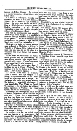 HE KUPU WHAKAMARAMA. tangata o te Nelson Karapu. Te mutanga o te purei e toru paina, a tetahi taha, e toru hoki a tetahi. I te ahiahi i karangatia katoatia nga tamariki o Te Aute ki te Kareti Pakeha o Nelson. Ko te waiata na nga tamariki o Nelson. Ka mutu tera katahi ka whaka- kitea te " Magic Lantern " (he ramu whaka- kitekite whakaahua i te po). Ko nga whakaahua no nga wahi i hurihia e te paka- rutanga o tetahi maunga i Itari. I te wiki ka kauwhau ano nga tamariki Maori ki nga kura Ratapu. I te ahiahi ka kauwhau ano nga tamariki kaumatua ake, ki nga pakeha. Nui atu te whakamoemiti me te aroha o nga pakeha ki nga tamariki Maori mo a ratou kupu i whakahua ai. No te ata o te Mane ka haere a Matenga raua ko Peneti ki Blenheim, ki Wairau, ki Waitohi, ki Waikawa, ki te whakarite i nga mahi ma nga tama iki nei ki reira, ki te whakarite hoki i nga kainga hei nohanga mo ratou. No te Turei ka whakaritea e Te Tatana tetahi pikiniki nui, hei powhiritanga ma ratou ko ana tamariki i nga tangata katoa i manaaki nei i a ratou. I haere katoa ratou ki nga onepu i tai, ki reira haereere ai. No te Wenerei ka rere to ratou tima. I te ahiahi ka tae ki Picton (Waitohi). Te mutunga o te kai ka huihui ki te Whare- Kura. I reira ta ratou ngahau. Ao ake ka haere katoa ki Waikawa. Kaore i mohio mai nga tangata o te kainga, he ope tenei te haere atu nei. Roko- hanga atu e raruraru ana te kainga. He maha nga mihi mai anga tangata whenua. Na Matenga i whakahoki nga korero, I whai kupu hoki a Ware Waitai me Peneti. Te mutunga o te kai, katahi kia, hokihoki katoa ngaimaua ki Waitohi: ma runga tereina, tae atu ana ki Blenheim. Rokohanga atu e whanga mai ana a Rev. Te Kerehi, (Ahirikona), me Mr Jenkins, me etahi atu. Kaore i roa e whakariterite ana kua tae katoa nga tamariki ki nga kainga i whakaritea ai mo ratou. I noho ano ratou i konei ki nga kainga o nga pakeha rangatira o tera whenua. I te ata o te Paraire (Hurae 8th) ka tukuna mai e nga Maori o Wairau, o ratou tarapu me te kooti>hei kawe ito matou ope ki to ratou kainga ki Wairau. Te mutunga o te Kai, ka huihui katoa mai nga tangata ki te whare-kura. Na Arapeta Rore nga manuhiri i powhiri. Muri iho i a ia, na te Tatana nga korero. Pai atu ana korero he tohutohu nana, i nga huarahi e kitea ai te ora mo te iwi Maori. He maha atu hoki etahi i whai kupu o nga tangata whenua o nga manuhiri. Ka mutu nga korero, ka karakia. Te mutunga o te Karakia, katahi matou ka hoki-hoki ki... Blenheim. I te ahiahi he nui nga pakeha i huihui ki te hooro ki te whakarongo i nga mahi nga- hau a te Maori. I te Hatarei (Hurae 9th) ka purei kiki- pooro a Te Aute ki Wairau, Wini ake i nga tamariki Maori, 11:9 nga paina. No te Wiki ka tukuna mai ano nga tarapu o nga Maori o Wairau ki te tiki mai i a matou Karakia katoa matou ki roto i to ratou whare karakia (Weteriana). Ko nga kauwhau na Ware Waitai, Na Balneavis, Na Terei Ngatai, Na Riwai Hiwinui, Na Hemi Matenga, Na Mr Jenkins, Na Te Kerehi, Na Peneti. No to matou putanga mai ki waho, ka tae mai te rongo, kua mate te minita o taua whare i karakiatia nei e matou a Rev. Hetaraka Warihi. I hoki te nuinga o matou ki Blenheim ki te kauwhau ki nga tamariki o nga kura Ratapu. I te toru o nga haora he karakia powhiri i nga tangata purei kiki-pooro, kia mahara ai hoki ratou ki nga mea o te Atua. I te Ahiahi he karakia nui ki te Whare Karakia o Te Kerehi. E ono rau e whitu rau ranei nga tangata i tapoko ki roto ki taua whare Muri iho i te karakia nui, ka whai kupu a Te Tatana raua ko Peneti.ki nga Pakeha, kia tahuri nui ratou ki te awhina i nga tikanga e ora ai te iwi Maori. I te ata o te Mane ka haere katoa matou ki te matakitaki i te wahi i patupatua ai nga pakeha e te Rauparaha, ara e kiia nei e te pakeha " Wairau Massacre." No te 2-30 p.m. ka huihui katoa atu matou ki te kainga o Mr. Jenkins. Ko ia te rangatira o te Peeke i Blenheim. Nui atu te aroha o taua pakeha ki nga tamariki Maori. No te 4 p.m. ka tae katoa matou ki te teihana o te Tereina. Ki • tonu te teihana i te pakeha i haere mai ki te tangi atu ki o ratou hoa pakeha. I te Ahiahi ka tae ki Picton. I reira te ngahau i te po. whakanekehia te taima o te Tima i te Ahiahi kia mutu ra no nga mahi onga tamariki ka rere ai. No te 10'30 p.m. rere atu ana to ratou tima. Tangi atu ana, tangi mai ana. Noho mokemoke ana nga mea i waiho iho. Huihui katoa nga moni i puta i runga i a ratou mahi £106. Te utunga otu i nga raruraru katoa, ko nga moni i toe £44. No te taenga ki Poneke ka kitea ko te taima o nga tikiti mo te tereina kua pahure ke. U