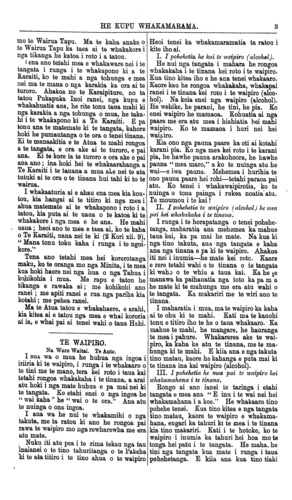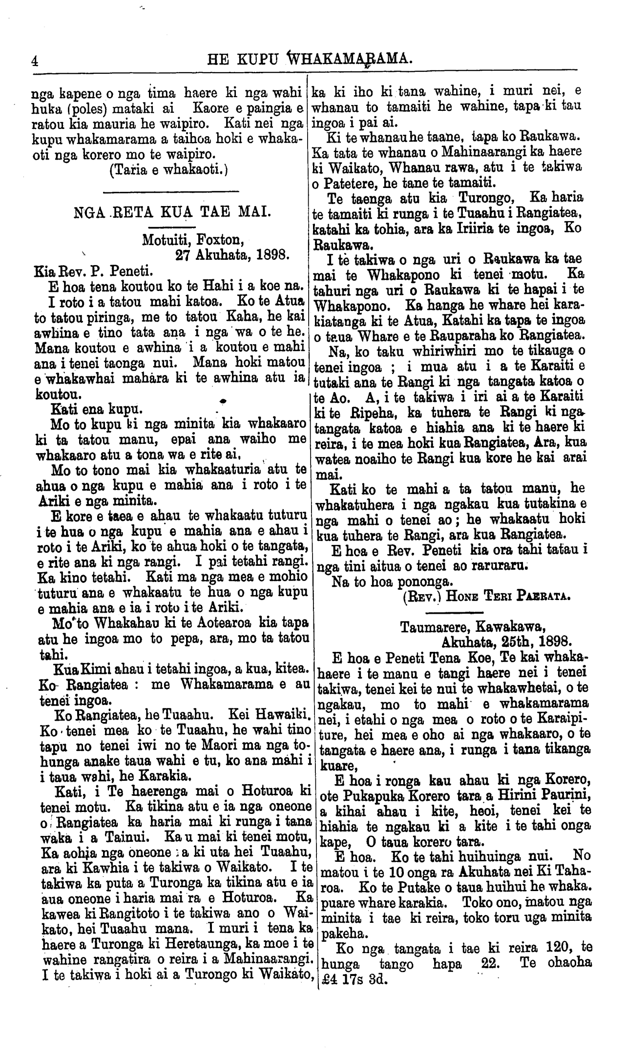 HE KUPU WHAKAMARAMA. nga kapene o nga tima haere ki nga wahi huka (poles) mataki ai Kaore e paingia e ratou kia mauria he waipiro. Kati nei nga kupu whakamarama a taihoa hoki e whaka- oti nga korero mo te waipiro. (Taria e whakaoti.) NGA RETA KUA TAE MAI. Motuiti, Foxton, 27 Akuhata, 1898. Kia Rev. P. Peneti. E hoa tena koutou ko te Hahi i a koe na. I roto i a tatou mahi katoa. Ko te Atua to tatou piringa, me to tatou Kaha, he kai awhina e tino tata ana i nga wa o te he. Mana koutou e awhina i a koutou e mahi ana i tenei taonga nui. Mana hoki matou e whakawhai mahara ki te awhina atu ia koutou. Kati ena kupu. Mo to kupu ki nga minita kia whakaaro ki ta tatou manu, epai ana waiho me whakaaro atu a tona wa e rite ai, Mo to tono mai kia whakaaturia atu te ahua o nga kupu e mahia ana i roto i te Ariki e nga minita. E kore e taea e ahau te whakaatu tuturu i te hua o nga kupu e mahia ana e ahau i roto i te Ariki, ko te ahua hoki o te tangata, e rite ana ki nga rangi. I pai tetahi rangi. Ka kino tetahi. Kati ma nga mea e mohio tuturu ana e whakaatu te hua o nga kupu e mahia ana e ia i roto i te Ariki. Mo to Whakahau ki te Aotearoa kia tapa atu he ingoa mo to pepa, ara, mo ta tatou tahi. Kua Kimi ahau i tetahi ingoa, a kua, kitea. Ko Rangiatea : me Whakamarama e au tenei ingoa. Ko Rangiatea, he Tuaahu. Kei Hawaiki. Ko tenei mea ko te Tuaahu, he wahi tino tapu no tenei iwi no te Maori ma nga to- hunga anake taua wahi e tu, ko ana mahi i i taua wahi, he Karakia. Kati, i Te haerenga mai o Hoturoa ki tenei motu. Ka tikina atu e ia nga oneone o Rangiatea ka haria mai ki runga i tana waka i a Tainui. Ka u mai ki tenei motu, Ka aohia nga oneone ra ki uta hei Tuaahu, ara ki Kawhia i te takiwa o Waikato. I te takiwa ka puta a Turonga ka tikina atu e ia aua oneone i haria mai ra e Hoturoa. Ka kawea ki Rangitoto i te takiwa ano o Wai- kato, hei Tuaahu mana. I muri i tena ka haere a Turonga ki Heretaunga, ka moe i te wahine rangatira o reira i a Mahinaarangi. I te takiwa i hoki ai a Turongo ki Waikato, ka ki iho ki tana wahine, i muri nei, e whanau to tamaiti he wahine, tapa ki tau ingoa i pai ai. Ei te whanau he taane, tapa ko Raukawa. Ka tata te whanau o Mahinaarangi ka haere ki Waikato, Whanau rawa, atu i te takiwa o Patetere, he tane te tamaiti. Te taenga atu kia Turongo, Ka haria te tamaiti ki runga i te Tuaahu i Rangiatea, katahi ka tohia, ara ka Iriiria te ingoa, Ko Raukawa. I te takiwa o nga uri o Raukawa ka tae mai te Whakapono ki tenei motu. Ea tahuri nga uri o Raukawa ki te hapai i te Whakapono. Ea hanga he whare hei kara- kiatanga ki te Atua, Katahi ka tapa te ingoa o taua Whare e te Rauparaha ko Rangiatea. Na, ko taku whiriwhiri mo te tikanga o tenei ingoa ; i mua atu i a te Karaiti e tataki ana te Rangi ki nga tangata katoa o te Ao. A, i te takiwa i iri ai a te Karaiti ki te Ripeha, ka tuhera te Rangi ki nga- tangata katoa e hiahia ana ki te haere ki reira, i te mea hoki kaa Rangiatea, Ara, kua watea noaiho te Rangi kua kore he kai arai mai. Kati ko te mahi a ta tatou manu, he whakatuhera i nga ngakau kua tutakina e nga mahi o tenei ao; he whakaatu hoki kua tuhera te Rangi, ara kua Rangiatea. E hoa e Rev. Peneti kia ora tahi tatau i nga tini aitua o tenei ao raruraru. Na to hoa pononga. (REV.) HONE TERI PAERATA. Taumarere, Kawakawa, Akuhata, 25th, 1898. E hoa e Peneti Tena Koe, Te kai whaka- haere i te mana e tangi haere nei i tenei takiwa, tenei kei te nui te whakawhetai, o te ngakau, mo to mahi e whakamarama nei, i etahi o nga mea o roto o te Karaipi- ture, hei mea e oho ai nga whakaaro, o te tangata e haere ana, i runga i tana tikanga kuare, E hoa i ronga kau ahau ki nga Korero, ote Pukapuka Korero tara a Hirini Paurini, a kihai ahau i kite, heoi, tenei kei te hiahia te ngakau ki a kite i te tahi onga kape, O taua korero tara. E hoa. Ko te tahi huihuinga nui. No matou i te 10 onga ra Akuhata nei Ei Taha- roa. Ko te Patake o taua huihui he whaka, puare whare karakia. Toko ono, matou nga minita i tae ki reira, toko toru nga minita pakeha. Ko nga tangata i tae ki reira 120, te hunga tango hapa 22. Te ohaoha £4 17s 3d.