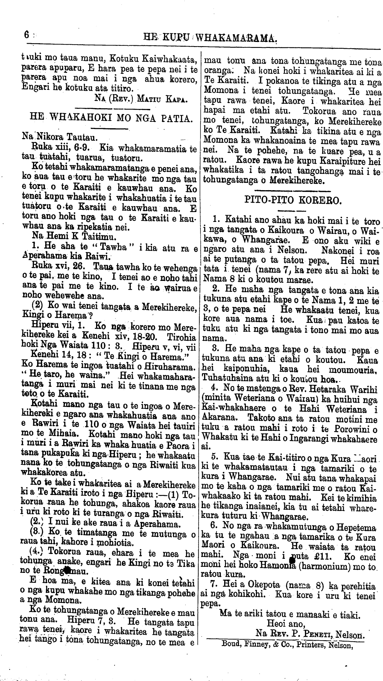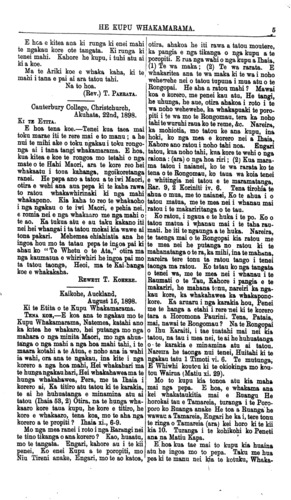 HE KUPU WHAKAMARAMA. E hoa e kitea ana ki runga ki enei mahi te ngakau kore ote tangata. Ki runga ki tenei mahi. Kahore he kupu, i tuhi atu ai ki a koe. Ma te Ariki koe e whaka kaha, ki te, mahi i tana e pai ai ara tatou tahi. Na to hoa. (Rev.) T. PAERATA. Canterbury College, Christchurch, Akuhata, 22nd, 1898. KI TE ETITA. E hoa tena koe.—Tenei kaa taea mai toku marae iti te rere mai e to manu; a he nui te mihi ake o toku ngakau i toku rongo- nga ai i tana tangi whakamarama. E hoa, kua kitea e koe te rongoa mo tetahi o nga mate o te Hahi Maori, ara te kore reo hei whakaatu i tona kahanga, ngoikoretanga ranei. He pepa ano a tatou a te iwi Maori, otira e wehi ana aua pepa ki te kaha rawa to ratou whakawhirinaki ki nga mahi whakapono. Kia kaha to reo te whakaoho i nga ngakau o te iwi Maori, e pehia nei, e romia nei e nga whakaaro me nga mahi o te ao. Ka tukua atu e au taku kakano iti nei hei whangai i ta tatou mokai kia wawe ai tona pakari. Mehemea ehiahiatia ana he ingoa hou mo ta tatau pepa te ingoa pai ki ahau ko " Te Whetu o te Ata," otira ma nga kaumatua e whiriwhiri he ingoa pai mo ta tatou taonga, Heoi, ma te Kai-hanga koe e whakakaha. REWETI T. KOHERE. Kaikohe, Auckland, August 15,1898. Ei te Etita o te Kupu Whakamarama. TENA KOE,—E koa ana te ngakau mo te Kupu Whakamarama, Natemea, katahi ano ka kitea he whakaro, hei putanga mo nga mahara o nga minita Maori, mo nga ahua- tanga o nga mahi a nga hoa mahi tahi, i te maara kotahi a te Atua, e noho ana ia wahi ia wahi, ora ana te ngakau, ina kite i nga korero a nga hoa mahi, Hei whakahari ma te hunga ngakau hari, Hei whakahawea ma te hunga whakahawea, Pera, me ta Ihaia i korero ai, Ka titiro atu tatou ki te karakia, te ai he huhuatanga e minamina atu ai tatou (Ihaia 53, 2) Otira, na te hanga wha- kaaro kore taua kupu, he kore e titiro, he kore e whakaaro, tena koa, mo te aha nga korero a te poropiti ? Ihaia xi., 6-9. Mo nga mea ranei i roto i nga Rarangi nei te tino tikanga o ana korero ? Kao, huaatu, mo te tangata. Engari, kahore au i te kii penei, Ko enei Kupu a te poropiti, mo Niu Tireni anake, Engari, mo te ao katoa, otira, ahakoa he iti rawa a tatou moutere, ka pangia e nga tikanga o nga kupu a te poropiti. E rua nga wahi o nga kupu a Ihaia, (1) Te wa maka; (2) Te wa rarata. E whakaritea ana te wa maka ki te wa i noho wehewehe nei o tatou tupuna i mua atu o te Rongopai. He aha a ratou mahi ? Mawai koa e korero, me penei kau atu, He tangi, he uhunga, he aue, otira ahakoa i roto i te wa noho wehewehe, ka whakapuaki te poro- piti i te wa mo te Rongomau, tera ka noho tahi te wuruhi raua ko te reme, &c. Nareira, ka mohiotia, mo tatou ke ana kupu, ina hoki, ko nga mea e korero nei a Ihaia, Kahore ano ratou i noho tahi noa. Engari tatou, kua noho tahi, kua kore te wehi o nga raiona : (ara) o nga hoa riri; (2) Kua mara- ma tatou i naianei, ko te wa rarata ko te tena o te Rongomau, ko taua wa koia tenei e whitingia nei tatou e te maramatanga, Rar. 9, 2 Koriniti iv. 6. Tena tirohia te ahua o mua, me to naianei, Ko te ahua i o tatou matua, me te mea nei i whanau mai ratou i te makariritanga o te tau. Ko ratou, i ngaua e te huka i te po. Ko o tatou matua i whanau mai i te taha rau- mati, he iti te ngaunga a te huka. Nareira, te taenga mai o te Rongopai kia ratou me te mea nei he putanga no ratou ki te mahanatanga o te ra, ka mihi, ina te mahana, nareira tere tonu ta ratou tango i tenei taonga ma ratou. Ko tatau ko nga tangata o tenei wa, me te mea nei i whanau i te Raumati o te Tau, Kahore i pangia e te makariri, he mahana tonu, nareiri ka nga- kau kore, ka whakahawea ka whakapono- kore. Ea aruaru i nga karakia hou, Penei me te hanga a etahi i rere nei ki te korero tara a Horomona Paurini. Tena, Pataia, mai, nawai te Rongomau ? Na te Rongopai o Ihu Karaiti, i tae tuatahi mai nei kia tatou, na tau i mea nei, te ai he huhuatanga o te karakia e minamina atu ai tatou. Nareira he taonga nui tenei, Huitahi ki te ngakau tatu 1 Timoti vi. 6. Te mutunga, E Whiwhi koutou ki te okiokinga mo kou- tou Wairua (Matiu xi. 29). Mo to kupu kia tonoa atu kia maha mai nga pepa. E hoa, e whakama ana kei whakataukitia mai e Ruangu He horokai tau e Tamareia, turanga i te Poro- poro ko Ruanga anake He toa a Ruanga he wawau a Tamareia, Engari he ka i, tere tonu te ringa o Tamareia (ara) kei horo ki te kii kia 10. Turanga i te kohikohi ko Peneti ana na Matiu Kapa. E hoa kua tae mai to kupu kia huaina atu he ingoa mo to pepa. Taku me hua pea ki te manu nei kia te kotuku, Whaka-