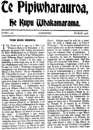 Te PIpiwharauroa, he Kupu Whakamarama. NAMA 100. GISBORNE. HURAE 1906. TURE MURU WHENUA. I TE Turei te 8 o nga ra o Mei i te Whare o Raro o te Paremete o In- garangi, ka patai a Mr Ashley (he iramutu no Rore Shaftesbury) ki te Pirimia mehe- mea kua mohio ia ki te Ture Whakanoho- noho Whenua Maori i paahitia e te Kawa- natanga o Niu Tireni i te tau 1903, a mehemea e whai kupu ana ia ki te kingi kia whakakorea taua ture i te mea e taka- hi ana i te Tiriti o Waitangi, i hanga nei ki waenganui o te Karauna me nga rangatira Maori o Niu Tireni. Ko te whakahoki a Mr. Churchill ko tenei: Kua ata tirotiro- hia e te Hekeretari o nga Koroni taua ture, a kitea ana e ia kahore he take e tohutohu- ngia ai te kingi kia whakakorea taua ture. Ki tana whakaaro kahore i te takahi i te Tiriti o Waitangi. I whakaaetia taua ture e te Whare o Raro o Niu Tireni, to- kowha nei o nga mema he Maori. I te korerotanga tuatoru o taua pire kotahi ano te mema Maori i whai kupu, a, i tau- toko ia i taua pire. I patai ano a Mr. Ashley mehemea kahore i tukua te mana o nga whenua Maori ki te Karauna e te Ture o te tau 1852 i whakaaetia ai he mana motuhake ki Niu Tireni. Ka mea a Mr. Churchill heoi ano tana whakahoki, kaho- re rawa nga Maori i te kino ki te ture o te tau 1905. I tautokona e nga mema Maori o te Whare o Raro taua pire a ko te mea o matou i whai kupu i mea ko tana whakahe rawa mo taua Pire he kore kaore i kaha rawa." Kei te whakaae ranei nga tangata matau o taua o te Maori ki tenei ture huaina nei e te Maori ko te I ure Muru? Kahore ranei he wahi he o tenei ture, he wahi e takahi ana i te Tiriti o Waitangi? Ko ta matou whakahoki ki ta matou patai ano, ae kei te whakaae ratou kahore he he inahoki i kore ai e whai- kupu, he whakaae hoki te nohopuku. I runga i te nohopuku o te Maori o te kore e amuamu ka mea te Kawanatanga o Ingarangi kei te paingia tenei ture kua iriiria nei e taua he Ture Muru. E kore te Kawanatanga o Ingarangi, e kore a ki- ngi Ehara e hamumu te reo ki te kore hoki te iwi Maori e hamumu te reo; kei te kiia te whakaaetanga a o tatou mema he whakaaetanga na te iwi Maori katoa. Ko te take i pooti ai o tatou mema mo te- nei Ture he wehi no matou i a Te Hetana, ehara i te mea he tino mohio no ratou hei ora mo te Maori tenei ture. Kua mate a Te Hetana ka ora nei ko Timi Kara, otira e kore a Timi e kaha ki te tu ki te mano o te pakeha e tangi whenua nei. Ki te wha^ katete a Timi ki te pakeha e hinga ia, a i enei ra, kua puta noa te kupu a te pakeha kia turakina a Timi kia whakaturia ko Pereiha hei Minita Maori. I tae nga ta- ngata no ratou nei a Waimarama Poraka ki Poneke ki te korero ki te Pirimia (Hooro-Tione) ki a Timi Kara, me te Minita mo nga whenua, he whakahe i te pitihana kia-tangohia e te Kawanatanga a Waimarama. Ko te hiahia o nga Maori he mahi kia 7000 eka, kia 22, 000 eka me nihi. Ko te whakahoki a te Pirimia, ka tangohia e te Karauna i runga i te hoko nga wahi kaore e taea e nga Maori te mahi i te mea ka nui te hiahia o te pakeha ki te whenua. Ka marama i enei kupu