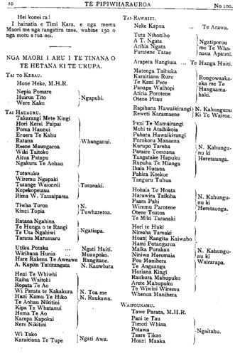 TE PIPIWHARAUROA Hei konei ra! I hainatia e Timi Kara, e nga mema Maori me nga rangatira tane, wahine 150 o nga motu e rua nei. NGA MAORI I ARU I TE TINANA O TE HETANA KI TE URUPA. TAI TO KERAU. Hone Heke, MHR Nepia Pomare} Huirua Tito Ngapuhi. Were Kake} TAI HAUAURU. Takarangi Mete Kingi Hori Kerei Paipai Poma Haunui Eruera Te Kahu Ratana -Whanganui. Reene Maungaroa Wiki Taitoko Aitua Ratapu Ngakura Te Aohau Tutanuku Wiremu Ngapaki Tutanga Waioni -Taranaki. Kopekopetaua Rima W Tamaiparea Tiwha Turoa Kingi i Topia ...Ngatituwharetoa. Ratana Ngahina Te Hunga o te Rangi Te Uta Ngahiwi ...Ngatiapa. Tarauna Marumaru Utiku Potaka ... Ngati Huiti. Wirihana Hunia ... Muaupoko Hare Rakena Te Aweawe... Rangitane. A. Kapita Tahitangata... Kauwhata Heni Te Whiwhi Reiha Waitohi Ropata Te Ao Wi Parata te Kakakura Toa me Hani Kamu Te Hiko Raukawa. Te Aohau Nikitini Kipa Te Whatanui Hema Te Ao Karepa Kapokai Rere Nikitini, Wi Tako Karaitiana Te Tupe TAI"RAWHITI. Neke Kapua ... Te Arawa. Tuta Nihoniho A T Ngata Ngatiporou Arihia Ngata... me Te Whanau-a-Apanui Paratene Tatae Arapeta Rangiuia ... Te Hanga Huiti. Matenga Taihuka i Karaitiana Ruru Rongowaakaaka me Te Hangaamahaki Te Kani Pere Panapa Waihopi Atiria Porotene . Otene Pitau Rapihana Hawaikirangi Ngatikahungunu Reweti Karamaene Ki Te Waihoa. Peni Te Mamai rangi Mohi te Ataihikoia Puhara Hawaikirangi Porokoru Manaena Kurupo Tareha ... Ngatikahungunu ki Heretaunga Paraire Tomoana Tangatake Hapuku Rupuha Te Hianga Ihaia Hutana Pahira Koekoe Tanguru Tuhua Hohaia Te Hoata 'Harawira. Taikaha ... Ngatikahungunu ki Heretaunga Paara Pahi Wiremu Paratene Otene Toatoa Te Miki Taranaki Hori te Huki Nireaha Tamaki Hoani Rangita Kaiwaho Hemi Potangaroa Maika Purakau ... Ngatikahungunu ki Wairarapa Niniwa Heremaia Pou Manihera Te Angaanga Horiana Kingi 1 Raukura Mahupuku I Arete Mahupuku I Te Wiwini Wiremu Whenua Manihera WAIPOUNAMU. Tawe Parata, MHR Pani te Tau Timoti Whina Potawa Ngaitahu. Taare Tikao Hoani Maaka