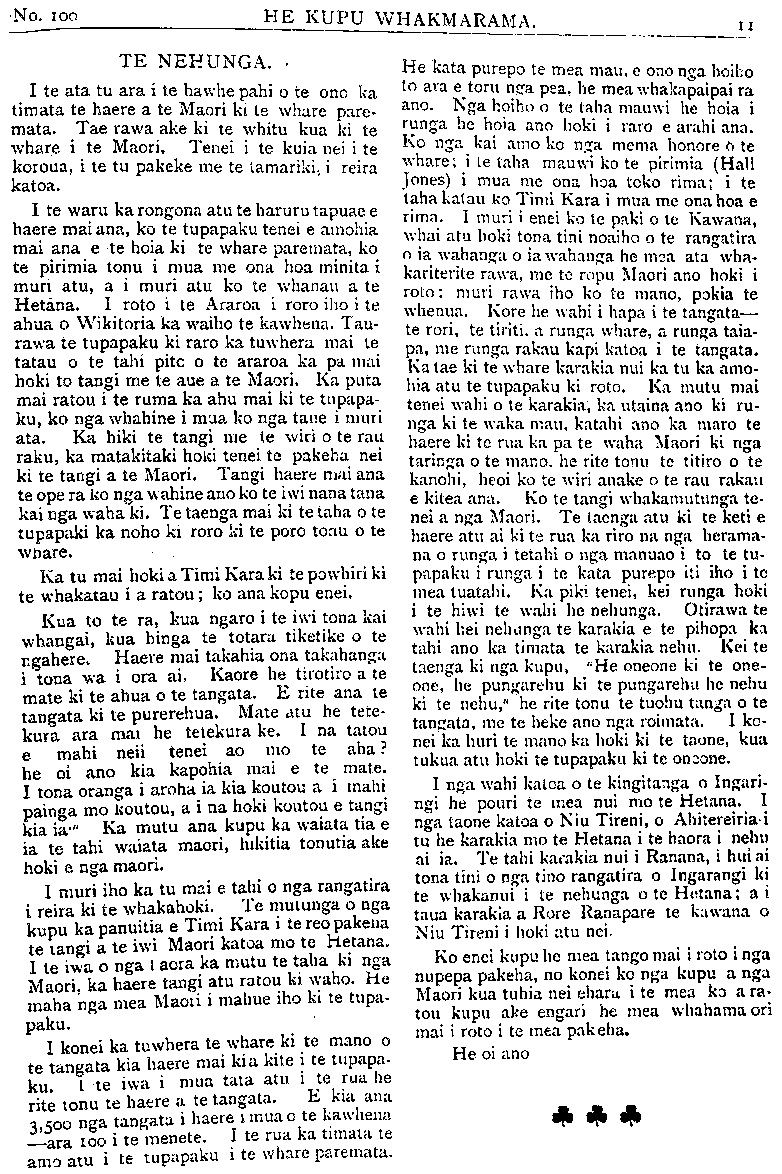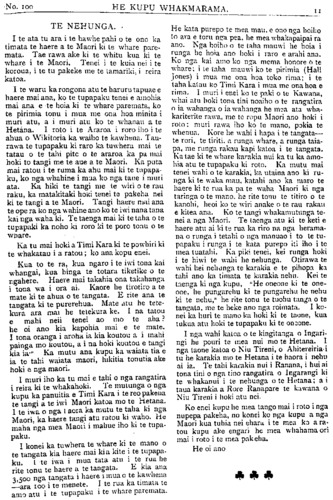 'No. 100 HE KUPU WHAKAMARAMA. TE NEHUNGA. - I te ata tu ara i te hawhe pahi o te ono ka timata te haere a te Maori ki te whare pare- mata. Tae rawa ake ki te whitu kua ki te whare i te Maori Tenei i te kuia nei i te koroua, i te tu pakeke me te tamariki, i reira katoa. I te waru ka rongona atu te haruru tapuae e haere mai ana, ko te tupapaku tenei e amohia mai ana e te hoia ki te whare paremata, ko te pirimia tonu i mua me ona hoa minita i muri atu, a i muri atu ko te whanau a te Hetana. I roto i te Araroa i roro iho i te ahua o Wikitoria ka waiho te kawhena. Tau- rewa te tupapaku ki raro ka tuwhera mai te tatau o te tahi pito o te araroa ka pa mai hoki to tangi me te aue a te Maori. Ka puta mai ratou i te ruma ka ahu mai ki te tupapa- ku, ko nga wahine i mua ko nga tane i muri ata. Ka hiki te tangi me te wiri o te rau raku, ka matakitaki hoki tenei te pakeha nei ki te tangi a te Maori. Tangi haere mai ana te ope ra ko nga w ahine ano ko te iwi nana tana kai nga waha ki. Te taenga mai ki te taha o te tupapaku ka noho ki roro ki te poro tonu o te whare. Ka tu mai hoki a Timi Kara ki te powhiri ki te whakatau i a ratou; ko ana kopu enei. Kua to te ra, kua ngaro i te iwi tona kai whangai, kua hinga te totara tiketike o te ngahere. Haere mai takahia ona takahanga i tona wa i ora ai. Kaore he tirotiro a te mate ki te ahua o te tangata. E rite ana te tangata ki te purerehua. Mate atu he tete- kura ara mai he tetekura ke. I na tatou e mahi nei tenei ao mo te aha? he oi ano kia kapohia mai e te mate. I tona oranga i aroha ia kia koutou a i mahi painga mo koutou, a i na hoki koutou e tangi kia ia'" Ka mutu ana kupu ka waiata tia e ia te tahi waiata maori, hikitia tonutia ake hoki e nga maori. I muri iho ka tu mai e tahi o nga rangatira i reira ki te whakahoki. Te mutunga o nga kupu ka panuitia e Timi Kara i te reo pakeha te tangi a te iwi Maori katoa mo te Hetana. I te iwa o nga I aora ka mutu te taha ki nga Maori, ka haere tangi atu ratou ki waho. He maha nga mea Maori i mahue iho ki te tupa- paku. I konei ka tuwhera te whare ki te mano o te tangata kia haere mai kia kite i te tupapa- ku. i te iwa i mua tata atu i te rua he rite tonu te haere a te tangata. E kia ana 3,5 00 nga tangata i haere mua te kawhena —ara 100 i te menete. I te rua ka timata te amo atu i te tupapaku i te whare paremata. He kata purepo te mea mau, e ono nga hoiho to ara e toru nga pea, he mea whakapaipai ra ano. Nga hoiho o te taha mauwi he hoia i runga he hoia ano hoki i raro e arahi ana. Ko nga kai amoko nga mema honore whare; i te taha mauwi ko te pirimia (Hall Jones) i mua me ona hoa toko rima; i te taha katau ko Timi Kara i mua me ona hoa e rima. I muri i enei ko te paki o te Kawana, whai atu hoki tona tini noaiho o te rangatira o ia wahanga o ia wahanga he mea ata wha- kariterite rawa, me te ropu Maori ano hoki i roto; muri rawa iho ko te mano, pokia te whenua. Kore he wahi i hapa i te tangata— te rori, te tiriti, a runga whare, a runga taia- pa, me runga nikau kapi katoa i te tangata. Ka tae ki te whare karakia nui ka tu ka amo- hia atu te tupapaku ki roto. Ka mutu mai tenei wahi o te karakia, ka utaina ano ki ru- nga ki te waka mau, katahi ano ka maro te haere ki te rua ka pa te waha Maori ki nga taringa o te mano, he rite tonu te titiro o te kanohi, heoi ko te wiri anake o te rau rakau e kitea ana. Ko te tangi whakamutunga te- nei a nga Maori. Te taenga atu ki te keti e haere atu ai ki te rua ka riro na nga herama- na o runga i tetahi o nga manuao i to te tu- papaku i runga i te kata purepo iti iho i te mea tuatahi. Ka piki tenei, kei runga hoki i te hiwi te wahi he nehunga. Otirawa te wahi hei nehunga te karakia e te pihopa ka tahi ano ka timata te karakia nehu. Kei te taenga ki nga kupu, "He oneone ki te one- one, he pungarehu ki te pungarehu he nehu ki te nehu," he rite tonu te tuohu tanga o te tangata, me te heke ano nga roimata. I ko- nei ka huri te mano ka hoki ki te taone, kua tukua atu hoki te tupapaku ki te oneone. I nga wahi katoa o te kingitanga o Ingari- ngi he poari te mea nui mo te Hetana. I nga taone katoa o Niu Tireni, o Ahitereiria i tu he karakia mo te Hetana i te haora i nehu ai ia. Te tahi karakia nui i Ranana, i huiai tona tini o nga tino rangatira o Ingarangi ki te whakanui i te nehunga o te Hetana; a i taua karakia a Pere Rapare te kawana o Niu Tireni i hoki atu nei. Ko enei kupu he mea tango mai i roto i nga nupepa pakeha, no konei ko nga kupu a nga Maori kua tuhia nei ehara i te mea ko a ma- tou kupu ake engari he mea whakamaori mai i roto i te mea pakeha. He oi ano