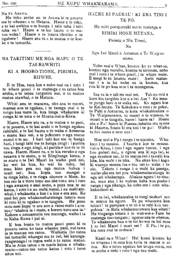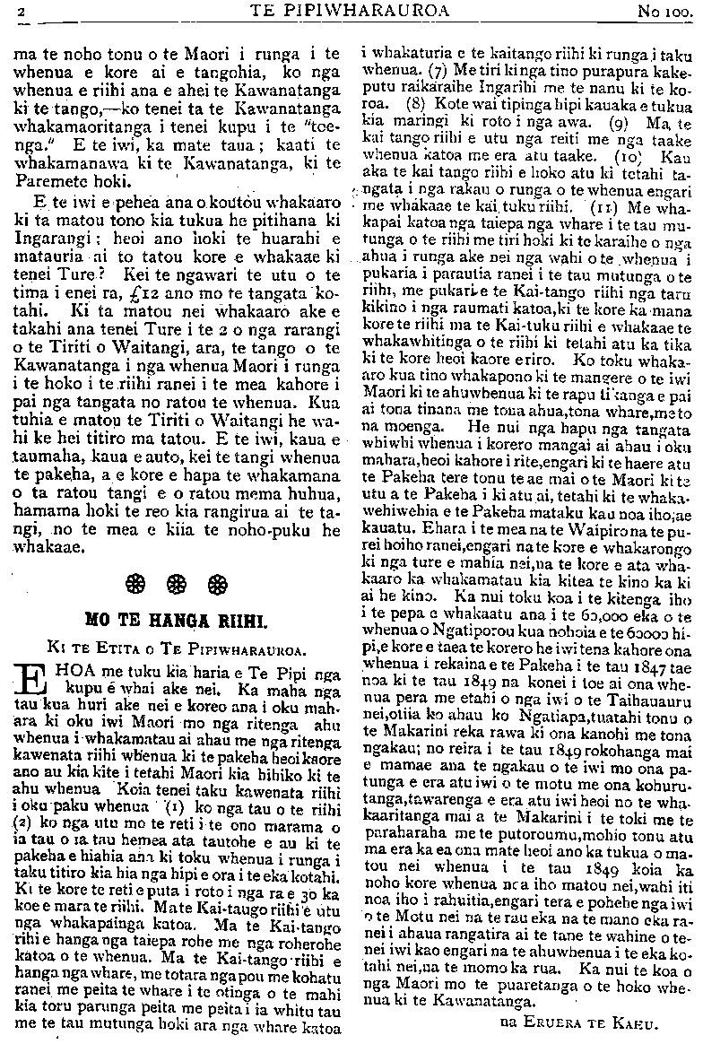 TE PIPIWHARAUROA No 100. ma te noho tonu o te Maori i runga i te whenua e kore ai e tangohia, ko nga whenua e nihi ana e ahei te Kawanatanga ki te tango,—ko tenei ta te Kawanatanga whakamaoritanga i tenei kupu i te "toe- nga." E te iwi, ka mate taua; kaati te whakamanawa ki te Kawanatanga, ki te Paremete hoki. E te iwi e pehea ana o koutou whakaaro ki ta matou tono kia tukua he pitihana ki Ingarangi; heoi ano hoki te huarahi e matauria ai to tatou kore e whakaae ki tenei Tare? Kei te ngawari te utu o te tima i enei ra, £12 ano mo te tangata ko- tahi. Ki ta matou nei whakaaro ake e takahi ana tenei Ture i te 2 o nga rarangi o te Tiriti o Waitangi, ara, te tango o te Kawanatanga i nga whenua Maori i runga i te hoko i te nihi ranei i te mea kahore i pai nga tangata no ratou te whenua. Kua tuhia e matou te Tiriti o Waitangi he wa- hi ke hei titiro ma tatou. E te iwi, kaua e taumaha, kaua e auto, kei te tangi whenua te pakeha, a e kore e hapa te whakamana o ta ratou tangi e o ratou mema huhua, hamama hoki te reo kia rangirua ai te ta- ngi, no te mea e kiia te nohopuku he whakaae. MO TE HANGA RIIHI. Ki TE ETITA O TE PIPIWHARAUROA. EHOA me tuku kia haria e Te Pipi nga kupu e whai ake nei. Ka maha nga tau kua huri ake nei e koreo ana i oku mah- ara ki oku iwi Maori mo nga ritenga ahu whenua i whakamatau ai ahau me nga ritenga kawenata nihi whenua ki te pakeha heoi kaore ano au kia kite i tetahi Maori kia hihiko ki te ahu whenua Koia tenei taku kawenata riihi i oku paku whenua (i) ko nga tau o te nihi (2) ko nga utu mo te reti i te ono marama o ia tau o ia tau hemea ata tautohe e au ki te pakeha e hiahia ana ki toku whenua i runga i taku titiro kia hia nga hipi e ora i te eka kotahi. Ki te kore te reti e puta i roto i nga ra e 30 ka koe e mara. te nihi. Mate Kaitango nihi e utu nga whakapainga katoa. Ma te Kaitango rihi e hanganga taiepa rohe me nga roherohe katoa o te whenua. Ma te Kaitango nihi e hanga nga whare, me totara nga pou me kohatu ranei me peita te whare i to otinga o te mahi kia toru parunga peita me peita i ia whitu tau me te tau mutunga hoki ara nga whare katoa i whakaturia e te kaitango nihi ki runga i taku whenua. (7) Me tiri ki nga tino purapura kake- putu raikaraihe Ingarihi me te nanu ki te ko- rea. (8) Kote wai tiringa hipi kauaka e tukua kia maringi ki roto i nga awa. (9) Ma te kai tango nihi e utu nga reiti me nga taake whenua katoa me era atu taake (io) Kau aka te kai tango nihi e hoko atu ki tetahi ta- ngata i nga rakau o runga o te whenua engari me whakaae te kai tuku nihi. (11) Me wha- kapai katoa taiepa nga whare i tekau mu- tunga o te nihi me tiri hoki ki te karaihe o nga ahua i runga ake nei nga wahi o te whenua i pukana i parautia ranei i te tau mutunga o te riihi, me pukari te Kaitango nihi nga taru kikino i nga raumati katoa, ki te kore ka mana kore te nihi ma te Kaituku nihi e whakaae te whakawhitinga o te nihi ki tetahi atu ka tika ki te kore heoi kaore e riro. Ko toku whaka- aro kua tino whakapono ki te mangere o te iwi Maori ki te ahuwhenua ki te rapu tikanga e pai ai tona tinana me tona ahua, tona whare, me tona moenga. He nui nga hapu nga tangata whiwhi whenua i korero mangai ai ahau i oku mahara heoi kahore i rite, engari ki te haere atu te Pakeha tere tonu te ae mai o te Maori kite utu a te Pakeha i ki atu ai, tetahi ki te whaka- wehiwehia e te Pakeha mataku kau noa iho kauatu. Ehara i te mea na te Waipiro na te pu rei hoiho ranei, engari nate kore e whakarongo ki nga ture e mahia nei, ua te kore e ata wha- kaaro ka whakamatau kia kitea te kino ka ki ai he kino. Ka nui toku koa i te kitenga iho i te pepa e whakaatu ana i te 60, 000 eka o te whenua o Ngatiporou kua nohoia e te 60000 hi- pi, e kore e taea te korero he iwi tena kahore ona whenua i rekaina e te Pakeha i te tau 1847 tae noa ki te tau 1849 na konei i toe ai ona whe- nua pera me etahi o nga iwi o te Taihauauru nei, otira ko ahau ko Ngatiapa, tuatahi tonu o te Makarini reka rawa ki ona kanohi me tona ngakau; no reira i te tau 1849 rokohanga mai e mamae ana te ngakau o te iwi mo ona pa- tunga e era atu iwi o te motu me ona kohuru tanga, tawarenga e era atu iwi heoi no te wha kaaritanga mai a te Makarini i te toki me te paraharaha me te putoroumu, mohio tonu atu ma era ka ea ona mate heoi ano ka tukua o ma- tou nei whenua i te tau 1849 koia ka noho kore whenua noa iho matou nei wahi iti noa iho i rahuitia, engari tera e pohehe nga iwi o te Motu nei na te rau eka na te mano eka ra- nei i ahaua rangatira ai te tane te wahine o te- nei iwi kao engari na te ahuwhenua i te eka ko- tahi Hetana te momo ka rua. Ka nui te koa o nga Maori mo te puaretanga o te hoko whe- nua ki te Kawanatanga. na ERUERA TE KAHU.