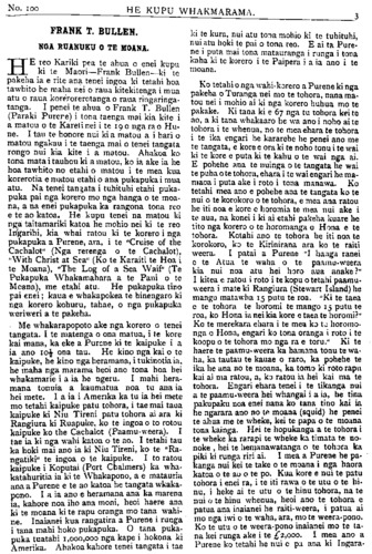 No. 100 HE KUPU WHAKAMARAMA. FRANK T BULLEN. NGA RUANUKU O TE MOANA. HE reo Kariki pea te ahua o enei kupu ki te Maori—Frank Bullen ki te pakeha ia e rite ana tenei ingoa ki tetahi hoa tawhito he maha nei o raua (kitekitenga i mua atu o raua korerorerotanga o raua ringaringa- tanga. I penei te ahua o Frank T Bullen (Paraki Purere) i tona taenga mai kia kite i a matou o te Kareti nei i te 190 nga ra o Hu- ne. I tau te honore nui ki a matou a i hari o matou ngakau i te taenga mai o tenei tangata rongo nui kia kite i a matou. Ahakoa ko tona mata i tauhou ki a matou, ko ia ake ia he hoa tawhito no etahi o matou i te mea kua 1 (korerotia e matou etahi o ana pukapuka i mua atu. Na tenei tangata i tuhituhi etahi puka- puka pai nga korero mo nga hanga o te moa- na, a na enei pukapuka ka rangona tona reo e te ao katoa. He kupu tenei na matou ki nga taitamariki katoa he mohio nei ki te reo Ingarihi, kia whai ratou ki te korero i nga pukapuka a Purene, ara, i te Cruise of the Cachalot (Nga rerenga o te Cachalot "With Christ at sea" (Ko te Karaiti te Hoa i te Moana), "The Log of a Sea Waif" (Te Pukapuka Whakamahara a te Pani o te Moana), me etahi atu. He pukapuka tino pai enei; kaua e whakapokea te hinengaro ki nga korero kohuru, tahae, o nga pukapuka weriweri a te pakeha. Me whakarapopoto ake nga korero o tenei tangata. I te matenga o ona matua, i te kore kai mana, ka eke a Purene ki te kaipuke i a ia ano 10 ona tau. He kino nga kai o te kaipuke, he kino nga heramana, i tukinotia ia, he maha nga marama heoi ano tona hoa hei whakamarie i a ia he ngeru. I mahi hera- mana tonuia a kaumatua noa tu ana ia hei mete. I a ia i Amerika ka tu ia hei mete mo tetahi kaipuke patu tohora, i tae mai taua kaipuke ki Niu Tireni patu tohora ai ara ki Rangiuia ki Ruapuke, ko te ingoa o to ratou kaipuke ko the Cachalot (Paamu-weera). I tae ia ki nga wahi katoa o te ao. I tetahi tau ka hoki mai ano ia ki Niu Tireni, ko te "Ra. ngatiki te ingoa o te kaipuke. I to ratou kaipuke i Koputai (Port Chalmers) ka wha- katahuritia ia ki te Whakapono, a e matauria ana a Purene e te ao katoa he tangata whaka- pono. I a ia ano e heramana ana ka marena ia, kahore noa iho ana moni, heoi haere ana ki te moana ki te rapu oranga mo tana wahi- ne. Inaianei kua rangatira a Purene i runga i tana mahi hoko pukapuka. O tana puka^ puka tuatahi 1, 000, 000 nga kape i hokona ki Amerika. Ahakoa kahore tenei tangata i tae ki te kura, nui atu tona mohio ki te tuhituhi, nui atu hoki te pai o tona reo. E ai ta Pure- ne puta mai tona matauranga i runga i tona kaha ki te korero i te Paipera i a ia ano i te moana. Ko tetahi o nga wahi korero a Purene ki nga pakeha o Turanga nei mo te tohora, nana ma- tou nei i mohio ai ki nga korero huhua mo te pakake. Ki tana ki e 67 nga tu tohora kei te ao, a ki tana whakaaro he wa ano i noho ai te tohora i te whenua, no te mea ehara te tohora i te ika engari he kararehe he penei ano me te tangata, e kore e ora ki te noho tonu i te wai ki te kore e puta ki te kahu o te wai nga ai. E pohehe ana te nuinga o te tangata he wai te puha o te tohora, ehara i te wai engari he. ma- maoa i puta ake i roto i tona manawa. Ko tetahi mea ano e pohehe ana te tangata ko te nui o te korokoro o te tohora, e mea ana ratou he iti noa e kore e horomia te mea nui ake i te aua, na konei i ki ai etahi pakeha kuare he tito nga korero o te horomanga o Hona e te tohora. Kotahi ano te tohora he iti noa te korokoro, ko te Kirinirana ara ko te raiti weera. I patai a Purene "I hanga ranei e te Atua te waha o te paamu-weera kia nui noa atu hei horo aua anake?" I kitea e ratou i roto i te kopu o tetahi paamu- waera i mate ki Rangiuia (Stewart Island) he mango matawha 15 putu te roa. "Ki te taea e te tohora te horomi te mango 15 putu te roa, ko Hona ia nei kia kore e taea te horomi?" Ko te merekara ehara i te mea ko te horomo- nga o Hona, engari ko tona oranga i roto i te koopu o te tohora mo nga ra e toru." Ki te haere te paamu-waera ka hamana tonu te wa- ha, ka tautau te kauae o raro, ka pohehe te ika he ana no te moana, ka tomo ki Toto rapu kai ai ma ratou, a, ko ratou ia hei kai ma te tohora. Engari ehara tenei i te tikanga nui a te paamu^weera hei whangai i a ia, he tina pakupaku noa enei nana ko tana tino kai ia he ngarara ano no te moana (squid) he penei te ahua me te wheke, kei te papa o te moana tona kainga. Hei te hopukanga a te tohora i te wheke ka rarapi te wheke ka timata te no- noke, hei te hemanawatanga o te tohera ka piki ki runga TITI ai. I mea a Purene he pa- kanga nui kei te take o te moana i nga haora katoa o te au o te po. Kua kore e nui te patu tohora i enei ra, i te iti rawa o te utu o te hi- nu, i heke ai te utu o te hinu tohora, na te nui o te hinu whenua, heoi ano te tohora e patua ana inaianei he raiti-weera, i patua ai mo nga iwi o te waha, ara, mo te weera^pono. Ko te utu o te waera-pono inaianei mo te ta- na kei runga ake i te £2, 000. I mea ano a Purene ko tetahi he nui e pa ana ki Ingara-