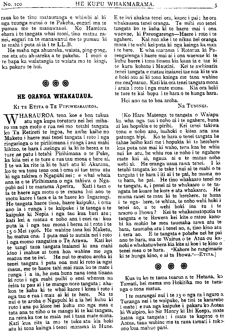 No. 100 HE KUPU WHAKAMARAMA. raua ko te tino matauranga e whiwhi ai ki nga tuunga nunui o te Pakeha, engari ma te pumau me te manawanui. Ko Hamiora ehara i te tangata whai moni, tino matau ra- nei, engari na te manawanui me te pumau ki te mahi i puta ai ia i te LLB. He maha nga ahuareka, waiata, ping-pong me eta atu ahuareka a te pakeha. I muri o te hapa ka waiatangia te waiata mo te kingi, ka pakaru te hui. HE ORANGA WHAKAUAUA. Ki TE ETITA O TE PIPIWHARAUROA. WHARAUROA tena koe e hoa tukua atu nga kupu torutoru nei hei mi haro ma nga motu e rua nei mo tetahi tangata ko Ta Retireti te ingoa, he awhe kaihe no Maketu i haere mai tenei tangata i roto i nga ringaringa o te pirihimana i runga i ana mahi kikino, te hara i meinga ai ia ki te herea e te ture ne patu i tetahi Pirihimana o te Puke, ko kiia nei e te ture e rua tau mona e hore ai. I te wa ka rite ia ki te hari atu ki Akarana, kote wa tonu tena ona i oma ai tae tonu atu ki nga takiwa o Ngapuhi nei; e whai whaia ana ia e te Pirihimana o nga takiwa o Nga- puhi nei i te marama Aperira. Kati i taea e ia te haere nga motu o te moana hoi ano te motu kaore i taea e ia te haere ko Ingarangi. He tangata haere tima, haere kaipuke, i oma ano ia i runga i te kaipuke i te taenga o te kaipuke ki Nepia i nga tau kua huri atu; kati kei a matau e noho ana i enei ra: kua puta ia i nga tau mona i herea ai i roto i te 150 Mei 1906. He wahine tana kei Maketu, he matua ona. I puta mai te autaia nei i roto i nga momo rangatira o Te Arawa. Kati kei te tangi taua tangata inaianei ki ana mahi kino i mahue ai tona hoa wahine me nga matua me te iwi. He nui to matou aroha ki tenei tangata i puta noa mai ki roto ia ngai maua, me te haere tahi mai raua ko te mate i runga i a ia, he mea huna nana tona tinana ki roto i nga mahi puihi o enei whenua na reira te pau ai i te mango horo tangata; aha- koa te kaha ki te whai kaore i kitea i roto i nga tau e rua i mau ai ki te here. Na te nui o te aroha o Ngapuhi ki a ia hei kuhu ki roto i ana pu kiore hei kuhu mo nga mea e tata ana te niho o te mango ki te kai tangata, na reira ka toe te maia nei i taua mate mona. Kati kua rite ia mo te tuku atu kia hoki atu ki tona kainga i tenei marama ia Hune. E te iwi ahakoa tenei ora, haora i pai; he ora whakauaua tenei oranga. Te mihi mo tenei tangata ko te kaha ki te haere mai i ona waewae, ki Parengarenga—Haere i roto i te ngahere. Kai noa ake i te nikau hei oranga mona i te wehi kei puta ki nga kainga ka mau i te here. E wha marama i Rotorua ki Pa- rengarenga i haere mai ai i ona waewae ki te kuhu haere i tona tinana kia kaua ia e tae ki te kuru kohatu i Mautini. Kei te awhinatia tenei tangata e matau inaianei tae noa ki te wa e hoki atu ai ki tona kainga me tana wahine me ona matua. Kati kia ora tenei tangata mona i araia i roto i nga mate mona. Kia ora hoki te ture te kai hopu i te hara o te hunga hara. Hoi ano na to hoa aroha. Na TUMINGI. [Ko Hare Matenga te tangata o Waiapu ka wha nga tau i noho ai i te ngahere, huna ai kei hopukia e te pirihi. Kei tenei takiwa tonu e noho ana, inahoki e kitea ana ana patunga hipi. Ko te hara o tenei tangata he tahae hoiho kati me i hopukia ki te herehere kua puta noa mai ki waho, tena koa he whiu nui ke atu, he whiu roa te noho i te ngahere mate kai ai, ngaua ai e te matao noho wehi ai. He oranga uaua rawa tenei. I ki tetahi tangata ko te take i nui ai te mahi o te tangata i te hara i iti ai i te pai, he mama no te hara, he pai. He tino whakaaro tenei no te tangata, a, i penei ai te whakaaro o te ta- ngata he kuare he kore e ata whakaaro. He mama ranei te mau ki te herehere, te huna i te nga- here, te whiua, te noho wehi hoki i tenei ao, a te wehi hoki ina tu i te araoro o Ihowa? Kei te whakamatopotia te tangata e te Rewera kei kite o ratou kano- hi ka mohio he mea taumaha rawa atu te hara, taumaha atu i tenei ao, a, tino kino atu i tera ao. E te tangata e pohehe nei he pai ano te hara, ma te Wairua o te Atua ou ka- nohi e whakatuwhera kia kite ai koe i te kino o tenei mea o te hara. "Kahore he rangimarie ki te hunga kino, e ai ta Ihowa."—ETITA.] Kua tu ko te tama tuarua a te Hetana, ko Tamati, hei mema mo Hokitika mo te turanga o tona matua. I te marangai nui i te 15 o nga ra i ngaro a Turanga nei i te waipuke, he tini te kararehe i mate; e rua nga kaipuke i pakaru ko Aotea ki Waipiro, ko Sir Henry ki Ihi Keepa, mate katoa nga tangata; i mate te kapene o te Aotea, tana wahine me ta raua tamati i toko ono kua mahue pani.