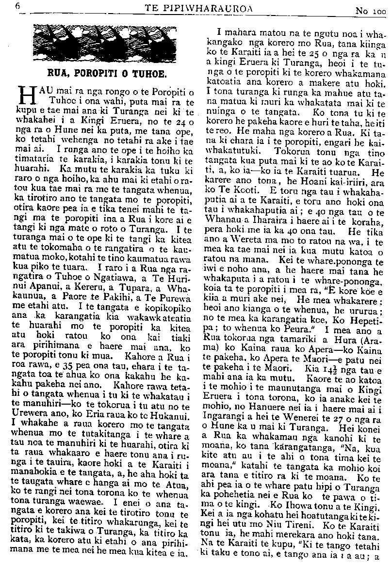 TE PIPIWHARAUROA No 100 RUA, POROPITI O TUHOE. HAU mai ra nga rongo o te Poropiti o Tuhoe i ona wahi, puta mai ra te kupu e tae mai ana ki Turanga nei ki te whakahei i a Kingi Eruera, no te 24 o nga ra o Hune nei ka puta, me tana ope, ko tetahi wehenga no tetahi ra ake i tae mai ai. I runga ano te ope i te hoiho ka timataria te karakia, i karakia tonu ki te huarahi. Ka mutu te karakia ka tuku ki raro o nga hoiho, ka ahu mai ki etahi o ra tou kua tae mai ra me te tangata whenua, ka tirotiro ano te tangata mo te poropiti, otira kaore pea ia e tika tenei mahi te ta- ngi ma te poropiti ina a Rua i kore ai e tangi ki nga mate o Toto o Turanga. I te turanga mai o te ope ki te tangi ka kitea atu te tokomaha o te rangatira o te kau- matua moko, kotahi te tino kaumatua rawa kua piko te tuara. I raro i a Rua nga ra ngatira o Tuhoe o Ngatiawa, a Te Huri nui Awanui, a Kereru, a Tupara, a Wha- kaunga, a Paore, te Pakihi, a Te Purewa me etahi atu. I te tangata e kopikopiko ana, ka karangatia kia wakawa ateatia te huarahi mo te poropiti ka kitea atu hoki ratou ko ona kai tiaki ara pirihimana e haere mai ana, ko te poropiti tonu ki mua. Kahore a Rua i roa rawa, e 35 pea ona tau ehara i te ta- ngata toa te ahua ko ona kakahu he ka- kahu pakeha nei ano. Kahore rawa teta- hi o tangata whenua i tu ki te whakatau i te manuhiri—ko te tokorua i tu atu no te Urevvera ano, ko Eria raua ko te Hukanui. I whakahe a raua korero mo te tangata whenua mo te tutakitanga i te whare a tau noa te manuhiri ki te huarahi, otira ki ta raua whakaaro e haere tonu ana i ru- nga i te tauira, kaore hoki a te Karaiti i manahokia e te tangata, a, he aha hoki ta te tangata whare e hanga ai mo te Atua, ko te rangi nei tona tohora ko te whenua tona turanga waewae. I enei o ana ta- ngata e korero ana kei te tirotiro tonu te poropiti, kei te titiro whakarunga, kei te titiro ki te takiwa o Turanga, ka titiro ka kata, ka korero atu ki etahi o ana pirihi- mana me te mea nei he mea kua kitea e ia. I mahara matou na te ngutu noa i wha- kangako nga korero mo Rua, tana kiinga ko te Karaiti ia a hei te 25 o nga ra ka u a kingi Eruera ki Turanga, heoi i te tu- nga o te poropiti ki te korero whakamana katoatia ana korero a makere atu hoki. I tona turanga ki runga ka mahue atu ta- na matua ki muri ka whakatata mai ki te nuinga o te tangata. Ko tona tu ki te korero he pakeha kaore e huri te taha, heki te reo. He maha nga korero a Rua. Ki ta- na ki ehara ia i te poropiti, engari he kai- whakatutuki. Tokorua tonu nga tino tangata kua puta mai ki te ao ko te Karai- ti, a, ko ia—ko ia te Karaiti tuarua. He korero ano tona he Hoani kai-iriiri, ara ko Te Kooti. E toru nga tau i whakaha- putia ai a te Karaiti, e toru ano hoki ona tau i whakahaputia ai; e 40 nga tau o te Whanau a Iharaira i haere ai i te koraha, pera hoki. me ia ka 40 ona tau. He tika ano a Wereta ma mo to ratou na wa, i te mea ka tae mai nei ia kua mutu katoa o ratou na mana. Kei te whare.pononga te iwi e noho ana, a he haere mai tana he whakaputa i a ratou i te whare-pononga, koia ta te poropiti i mea ra, "E kore koe e kiia a muri ake nei, He mea whakarere; heoi ano kianga o te whenua, he urarua; no te mea ka karangatia koe, Ko Hepeti- pa; to whenua ko Poura." I mea ano a Rua tokorua nga tamariki a Hura (Ara- ma) ko Kama raua ko Apera—ko Kaina te pakeha, ko Apera te Maori—e patu nei te pakeha i te Maori. Kia 14^ nga tau e mahi ana ia ka mutu. Kaore te ao katoa i te mohio i te maunutanga mai o Kingi Eruera i tona torona, ko ia anake kei te mohio, no Hanuere nei ia i haere mai ai i Ingarangi a hei te Wenerei te 27 o nga ra o Hune ka u mai ki Turanga. Hei konei a Rua ka whakamau nga kanohi ki te moana, ko tana karangatanga, Na, kua kite atu au i te ahi o tona tima kei te moana," katahi te tangata ka mohio koi ara tana e titiro ra ki te moana. Ko te ahi pea ia o te whare patu hipi o Turanga ka pohehetia nei e Rua ko te pawa o ti- ma o te kingi. Ko Ihowa tonu a te Kingi. Kei a ia nga kohatu hei hoatutanga ki te ki- ngi hei utu mo Niu Tireni. Ko te Karaiti tonu ia, he mahi merekara ano hoki tana. Na te Karati te kupu, "Ki te tango tetahi ki taku e tono ai, e tango ana ia i a au; a