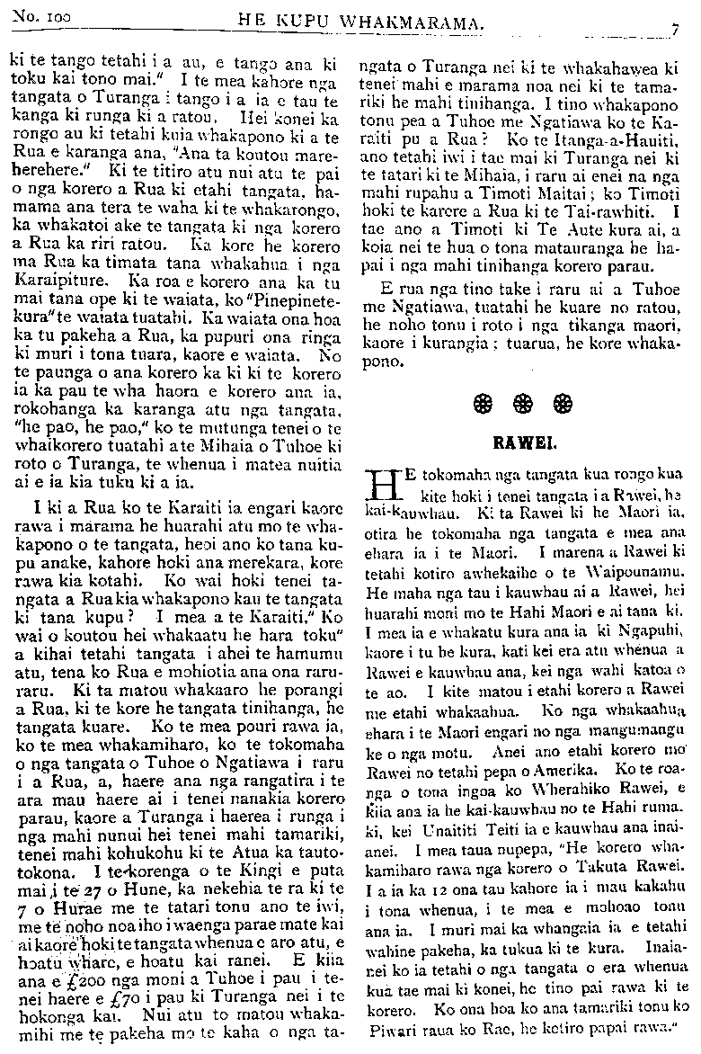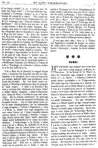 No. 100 HE KUPU WHAKAMARAMA. ki te tango tetahi i a au, e tango ana ki toku kai tono mai." I te mea kahore nga tangata o Turanga i tango i a ia e tau te kanga ki runga ki a ratou. Hei konei ka rongo au ki tetahi kuia whakapono ki a te Rua e karanga ana, "Ana ta koutou mare- herehere" Ki te titiro atu nui atu te pai o nga korero a Rua ki etahi tangata, ha- mama ana tera te waha ki te whakarongo, ka whakatoi ake te tangata ki nga korero a Rua ka riri ratou. Ka kore he korero ma Rua ka timata tana whakahua i nga Karaipiture. Ka roa e korero ana ka tu mai tana ope ki te waiata, ko "Pinepinete- kura" te waiata tuatahi. Ka waiata ona hoa ka tu pakeha a Rua, ka pupuri ona ringa ki muri i tona tuara, kaore e waiata. No te paunga o ana korero ka ki ki te korero ia ka pau te wha haora e korero ana ia, rokohanga ka karanga atu nga tangata, "he pao, he pao," ko te mutunga tenei o te whaikorero tuatahi ate Mihaia o Tuhoe ki roto o Turanga, te whenua i matea nuitia ai e ia kia tuku ki a ia. I ki a Rua ko te Karaiti ia engari haora rawa i marama he huarahi atu mo te wha- kapono o te tangata, heoi ano ko tana ku- pu anake, kahore hoki ana merekara, kore rawa kia kotahi. Ko wai hoki tenei ta- ngata a Rua kia whakapono kau te tangata ki tana kupu? I mea a te Karaiti," Ko wai o koutou hei whakaatu he hara toku" a kihai tetahi tangata i ahei te hamumu atu, tena ko Rua e mohiotia ana ona raru- raru. Ki ta matou whakaaro he porangi a Rua, ki te kore he tangata tinihanga, he tangata kuare. Ko te mea poari rawa ia, ko te mea whakamiharo, ko te tokomaha o nga tangata o Tuhoe o Ngatiawa i raru i a Rua, a, haere ana nga rangatira i te ara mau haere ai i tenei nanakia korero parau, kaore a Turanga i haerea i runga i nga mahi nunui hei tenei mahi tamariki, tenei mahi kohukohu ki te Atua ka tauto- tokona. I te korenga o te Kingi e puta maihi te 27 o Hune, ka nekehia te ra ki te 7 o Hurae me te tatari tonu ano te iwi, me te noho noaiho i waenga parae mate kai ai kaore hoki te tangatawhenua e aro atu, e hoatu whare, e hoatu kai ranei. E kiia ana e ^200 nga moni a Tuhoe i pau i te- nei haere e 70 i pau ki Turanga nei i te hokonga kai. Nui atu to matou whaka- mihi me te pakeha mo te kaha o nga ta- ngata o Turanga nei ki te whakahawea ki tenei mahi e marama noa nei ki te tama riki he mahi tinihanga. I tino whakapono tonu pea a Tuhoe me Ngatiawa ko te Ka- raiti pu a Rua? Ko te Itanga-a-Hauiti, ano tetahi iwi i tae mai ki Turanga nei ki te tatari ki te Mihaia, i raru ai enei na nga mahi rupahu a Timoti Maitai; ko Timoti hoki te karere a Rua ki te Tairawhiti. I tae ano a Timoti ki Te Aute kura ai, a koia nei te hua o tona matauranga he ha- pai i nga mahi tinihanga korero parau. E rua nga tino take i raru ai a Tuhoe me Ngatiawa, tuatahi he kuare no ratou, he noho tonu i roto i nga tikanga maori, kaore i kurangia; tuarua, he kore whaka- pono. RAWEI. HE tokomaha nga tangata kua rongo kua kite hoki i tenei tangata i a Rawei, he kai-kauwhau. Ki ta Rawei ki he Maori ia, otira he tokomaha nga tangata e mea ana ehara ia i te Maori. I marena a Rawei ki tetahi kotiro awhekaihe o te Waipounamu. He maha nga tau i kauwhau ai a Rawei, hei huarahi moni mo te Hahi Maori e ai tana ki. I mea ia e whakatu kura ana ia ki Ngapuhi, kaore i tu he kura, kati kei era atu whenua a Rawei e kauwhau ana, kei nga wahi katoa o te ao. I kite matou i etahi korero a Rawei me etahi whakaahua. Ko nga whakaahua ehara i te Maori engari no nga mangumangu ke o nga motu. Anei ano etahi korero mo Rawei no tetahi pepa o Amerika. Ko te roa nga o tona ingoa ko Wherahiko Rawei, e kiia ana ia he kai-kauwhau no te Hahi ruma. ki, kei Unaititi Teiti ia e kauwhau ana inai- anei. I mea taua nupepa, "He korero wha- kamiharo rawa nga korero o Takuta Rawei. I a ia ka 12 ona tau kahore ia i mau kakahu i tona whenua, i te mea e mohoao tonu ana ia. I muri mai ka whangaia ia e tetahi wahine pakeha, ka tukua ki te kura. Inaia- nei ko ia tetahi o nga tangata o era whenua kua tae mai ki konei, he tino pai rawa ki te korero. Ko ona hoa ko ana tamariki tonu ko Piwari raua ko Rae, he kotiro papai rawa."