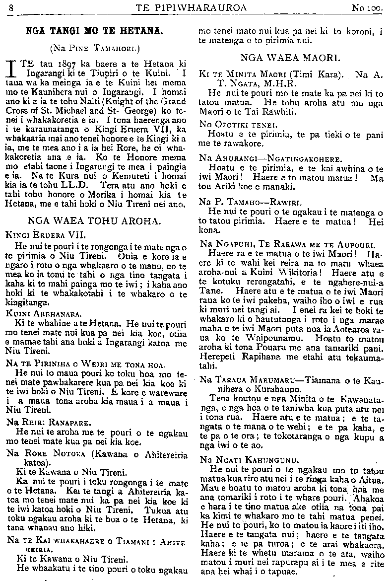8 TE PIPIWHARAUROA No 100. NGA TANGI MO TE HETANA. (Na PINE TAMAHORI.) ITE tau 1897 ka haere a te Hetana ki Ingarangi ki te Tiupiri o te Kuini. I taua wa ka meinga ia e te Kuini hei mema mo te Kaunihera nui o Ingarangi. I homai ano ki a ia te tohu Naiti (Knight of the Grand Cross of St Michael and St George) ko te nei i whakakoretia e ia. I tona haerenga ano i te karaunatanga o Kingi Eruera VII, ka whakaaria mai ano tenei honore e te Kingi ki a ia, me te mea ano i a ia hei Rore, he oi wha kakoretia ana e ia. Ko te Honore mema mo etahi taone i Ingarangi te mea i paingia e ia. Na te Kura nui o Kemureti i homai kia ia te tohu LLD. . Tera atu ano hoki e tahi tohu honore o Merika i homai kia te Hetana, me e tahi hoki o Niu Tireni nei ano. NGA WAEA TOHU AROHA. KINGI ERUERA VII. He nui te pouri i te rongonga i te mate nga o te pirimia o Niu Tireni. Otiia e kore ia e ngaro i roto o nga whakaaro o te mano, no te mea ko ia tonu te tahi o nga tino tangata i kaha ki te mahi painga mo te iwi; i kaha ano hoki ki te whakakotahi i te whakaro o te kingitanga. KUINI AREHANARA. Ki te wahine a te Hetana. He nui te pouri mo tenei mate nui kua pa nei kia koe, otiia e mamae tahi ana hoki a Ingarangi katoa me Niu Tireni. NA TE PIRINIHA O WEIRI ME TONA HOA. He nui to maua pouri ko toku hoa mo te- nei mate pawhakarere kua pa nei kia koe ki te iwi hoki o Niu Tireni. E kore e wareware i a maua tona aroha kia maua i a maua i Niu Tireni. Na REIRI RANAPARE. He nui te aroha me te pouri o te ngakau mo tenei mate kua pa nei kia koe. Na ROKE NOTOKA; A (Kawana o Ahitereiria katoa). Ki te Kawana o Niu Tireni. Ka nui te pouri i toku rongonga i te mate o te Hetana. Kei te tangi a Ahitereiria ka- toa mo tenei mate nui ka pa nei kia koe ki te iwi katoa hoki o Niu Tireni. Tukua atu toku ngakau aroha ki te hoa o te Hetana, ki tana whanau ano hiki. Na TE KAI WHAKAHAERE O TIAMANI I AHITE REIRIA. Ki te Kawana o Niu Tireni. He whakaatu i te tino pouri o toku ngakau mo tenei mate nui kua pa nei ki to koroni, i te matenga o to pirimia nui. NGA WAEA MAORI. Ki TE MINITA MAORI (Timi Kara). Na A. T NGATA, M.H.R. He nui te pouri mo te mate ka pa nei ki to tatou matua. He tohu aroha atu mo nga Maori o te Tai Rawhiti. NO OPOTIKI TENEI. Hoatu e te pirimia, te pa tieki o te pani me te rawakore. Na AHURANGI—NGATINGAKOHERE. Hoatu e te pirimia, e te kai awhina o te iwi Maori! Haere e to matou matua! Ma tou Ariki koe e manaki. NaP. TAMAHO—RAWIRI. He nui te pouri o te ngakau i te matenga o to tatou pirimia. Haere e te matua! Hei kona. Na NGAPUHI, TE RARAWA ME TE AUPOURI. Haere ra e te matua o te iwi Maori! Ha ere ki te wahi kei reira na to matu whaea arohanui a Kuini Wikitoria! Haere atu e te kotuku rerengatahi, e te ngahere-nui-a Tane. Haere atu e te matua o te iwi Maori raua ko te iwi pakeha, waiho iho o iwi e rua ki muri nei tangi ai. I enei ra kei te hoki te whakaro ki o haututanga i roto i nga marae maha o te iwi Maori puta noa ia Aotearoa ra- ua ko te Waipounamu. Hoatu to matou aroha ki tona Pouaru me ana tamariki pani. Herepeti Rapihana me etahi atu tekauma- tahi. Na TARAUA MARUMARU—Tiamana o te Kau- nihera o Kurahaupo. Tena koutou e nga Minita o te Kawanata- nga, e nga hoa o te taniwha kua puta atu nei i tona rua. Haere atu e te matua; e te ta- ngata o te mana o te wehi; e te pa kaha, e te pa o te ora; te takotoranga o nga kupu a nga iwi o te ao. Na NGATI KAHUNGUNU. He nui te pouri o te ngakau mo to tatou matua kua riro atu nei i te ringa kaha Aitua. Mau e hoatu to matou aroha ki tona hoa me ana tamariki i roto i te whare pouri Ahakoa e hara i te tino matua ake otiia na tona pai ka kimi te whakaro mo te tahi matua penei. He nui to pouri, ko to matou ia kaore i iti iho. Haere e te tangata nui; haere e te tangata kaha; e te pa turoa; e te arai whakaora. Haere ki te whetu marama o te ata, waiho matou i muri nei rapurapu ai i te mea e rite ana hei whai i o tapuae.