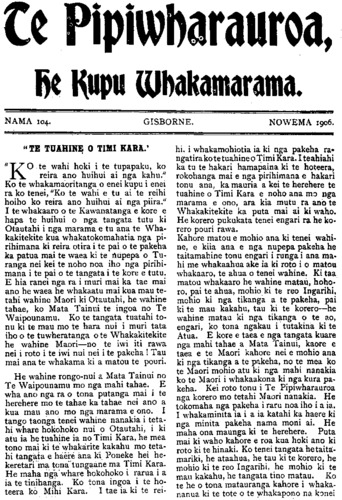 Te Pipiwharauroa, he KUPU Whakamarama. NAMA 104. NOWEMA 1906. "TE TUAHINE O TIMI KARA. "KO te wahi hoki i te tupapaku, ko reira ano huihui ai nga kahu." Ko te whakamaoritanga o enei kupu i enei ra ko tenei, "Ko te wahi e tu ai te reihi hoiho ko reira ano huihui ai nga piira." I te whakaaro o te Kawanatanga e kore e hapa te huihui o nga tangata tutu ki Otautahi i nga marama e tu ana te Wha- kakitekite kua whakatokomahatia nga pi- rihimana ki reira otira i te pai o te pakeha ka patua mai te waea ki te nupepa o Tu- ranga nei kei te noho noa iho nga pirihi- mana i te pai o te tangata i te kore e tutu. E hia ranei nga ra i muri mai ka tae mai ano he waea he whakaatu mai kua mau te- tahi wahine Maori ki Otautahi, he wahine tahae, ko Mata Tainui te ingoa no Te Waipounamu. Ko te tangata tuatahi to- nu ki te mau mo te hara nui i muri tata iho o te tuwheratanga o te Whakakitekite he wahine Maori—no te iwi iti rawa nei i roto i te iwi nui nei i te pakeha! Tau mai ana te whakama ki a matou te pouri. He wahine rongo-nui a Mata Tainui no Te Waipounamu mo nga mahi tahae. E wha ano nga ra o tona putanga mai i te herehere mo te tahae ka tahae nei ano a kua mau ano mo nga marama e ono. I tango taonga tenei wahine nanakia i teta- hi whare hokohoko nui o Otautahi, i ki atu ia he tuahine ia no Timi Kara, he mea tono mai ki te whakarite kakahu mo teta- hi tangata e haere ana ki Poneke hei he- keretari ma tona tungaane ma Timi Kara. He maha nga whare hokohoko i rarua i a ia te tinihanga. Ko tona ingoa i te ho- teera ko Mihi Kara. I tae ia ki te rei- hi. i whakamohiotia ia ki nga pakeha ra ngatira ko te tuahine o Timi Kara. I te ahiahi ka tu te hakari hamapaina ki te hoteera, rokohanga mai e nga pirihimana e hakari tonu ana, ka mauria a kei te herehere te tuahine o Timi Kara e noho ana mo nga marama e ono, ara kia mutu ra ano te Whakakitekite ka puta mai ai ki waho. He korero pukukata tenei engari ra he ko- rero pouri rawa. Kahore matou e mohio ana ki tenei wahi- ne, e kiia ana e nga nupepa pakeha he taitamahine tonu engari i runga i ana ma hi me whakaahua ake ia ki roto i o matou whakaaro, te ahua o tenei wahine. Ki taa matou whakaaro he wahine matau, hoho- ro, pai te ahua, mohio ki te reo Ingarihi, mohio ki nga tikanga a te pakeha, pai ki te mau kakahu, tau ki te korero—he wahine matau ki nga tikanga o te ao, engari, ko tona ngakau i tutakina ki te Atua. E kore e taea e nga tangata kuare nga mahi tahae a Mata Tainui, kaore e taea e te Maori kahore nei e mohio ana ki nga tikanga a te pakeha, no te mea ko te Maori mohio atu ki nga mahi nanakia ko te Maori i whakaakona ki nga kura pa- keha. Kei roto tonu i Te Pipiwharauroa nga korero mo tetahi Maori nanakia. He tokomaha nga pakeha i raru noa iho i a ia. I whakaminita ia i a ia katahi ka haere ki nga minita pakeha nama moni ai. He maha ona maunga ki te herehere. Puta mai ki waho kahore e roa kua hoki ano ki roto ki te hinaki. Ko tenei tangata he taita- mariki, he ataahua, he tau ki te korero, he mohio ki te reo Ingarihi, he mohio ki te mau kakahu, he tangata tino matau. Ko te he o tona matauranga kahore i whaka- nanua ki te tote o te whakapono na konei