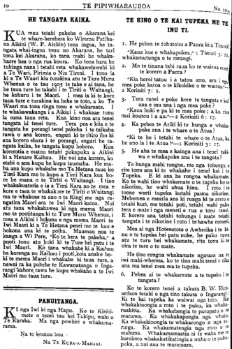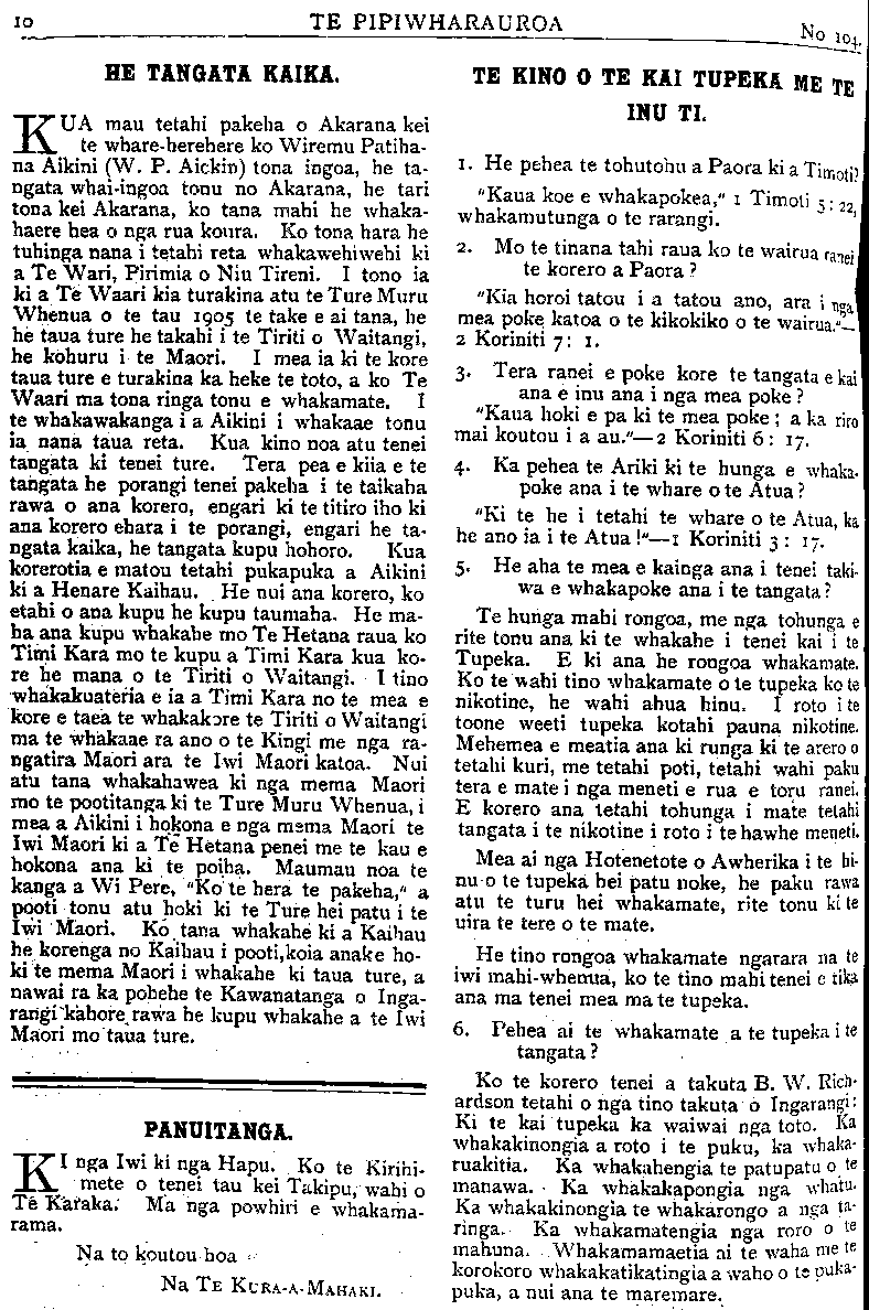 TE PIPIWHARAUROA HE TANGATA KAIKA. KUA mau tetahi pakeha o Akarana kei te whare-herehere ko Wiremu Patiha na Aikini (W.P Aickin) tona ingoa, he ta- ngata whai ingoa tonu no Akarana, he tari tona kei Akarana, ko tana mahi he whaka- haere hea o nga rua koura. Ko tona hara he tuhinga nana i tetahi reta whakawehi wehi ki a Te Wari, Pirimia o Niu Tireni. I tono ia ki a Te Waari kia turakina atu te Ture Muru Whenua o te tau 1905 te take e ai tana, he he taua ture he takahi i te Tiriti o Waitangi, he kohuru i te Maori. I mea ia ki te kore taua ture e turakina ka heke te toto, a ko Te Waari ma tona ringa tonu e whakamate. I te whakawakanga i a Aikini i whakaae tonu ia nana taua reta. Kua kino noa atu tenei tangata ki tenei ture. Tera pea e kiia e te tangata he porangi tenei pakeha i te taikaha rawa o ana korero, engari ki te titiro iho ki ana korero ehara i te porangi, engari he ta- ngata kaika, he tangata kupu hohoro. Kua korerotia e matou tetahi pukapuka a Aikini ki a Henare Kaihau. He nui ana korero, ko etahi o ana kupu he kupu taumaha. He ma- ha ana kupu whakahe mo Te Hetana raua ko Timi Kara mo te kupu a Timi Kara kua ko- re he mana o te Tiriti o Waitangi. I tino whakakuateria e ia a Timi Kara no te mea e Rore e taea te whakakore te Tiriti o Waitangi ma te whakaae ra ano o te Kingi me nga ra- ngatira Maori ara te Iwi Maori katoa. Nui atu tana whakahawea ki nga mema Maori mo te pootitanga ki te Ture Muru Whenua, i mea a Aikini i hokona e nga mema Maori te Iwi Maori ki a Te Hetana penei me te kau e hokona ana ki te poiha. Maumau noa te kanga a Wi Pere, "Ko te hera te pakeha," a pooti tonu atu hoki ki te Ture hei patu i te Iwi Maori. Ko tana whakahe ki a Kaihau he korenga no Kaihau i pooti, koia anake ho- ki te mema Maori i whakahe ki taua ture, a nawai ra ka pohehe te Kawanatanga o Inga- rangi kahore rawa he kupu whakahe a te Iwi Maori mo taua ture. PANUITANGA KI nga Iwi ki nga Hapu. Ko te Kirihi- mete o tenei tau kei Takipu, wahi o Te Karaka; Ma nga powhiri e whakama- rama. Na to koutou hoa Na to koutou hoa TE KINO O TE KAI TUPEKA ME TE INU TI. 1. He pehea te tohutohu a Paora ki a Timoti "Kaua koe e whakapokea," 1 Timoti 5: 22 whakamutunga o te rarangi. 2. Mo te tinana tahi raua ko te wairua ranei te korero a Paora? "Kia horoi tatou i a tatou ano, ara i no; mea poke katoa o te kikokiko o te wairua." 2 Koriniti 7: 1. 3. Tera ranei e poke kore te tangata e ki ana e inu ana i nga mea poke? "Kaua hoki e pa ki te mea poke; a ka riro mai koutou i a au."—2 Komiti 6: 17. 4. Ka pehea te Ariki ki te hunga e whaka poke ana i te whare o te Atua? "Ki te he i tetahi te whare o te Atua, 1 he ano ia i te Atua!"—1 Koriniti 3: 17 5. He aha te mea e kainga ana i tenei taki wa e whakapoke ana i te tangata? Te hunga mahi rongoa, me nga tohunga rite tonu ana ki te whakahe i tenei kai i Tupeka. E ki ana he rongoa whakamate Ko te wahi tino whakamate o te tupeka ko nikotine, he wahi ahua hinu. I roto i toone weeti tupeka kotahi pauna nikotine. Mehemea e meatia ana ki runga ki te arero tetahi kuri, me tetahi poti, tetahi wahi paku tera e mate i nga meneti e rua e toru ranei. E korero ana tetahi tohunga i mate tetahi tangata i te nikotine i roto i te hawhe meneti. Mea ai nga Hotenetote o Awherika i te hi nu o te tupeka hei patu noke, he paku rawa atu te turu hei whakamate, rite tonu ki uira te tere o te mate. He tino rongoa whakamate ngarara na iwi mahi whenua, ko te tino mahi tenei e ti ana ma tenei mea ma te tupeka. 6. Pehea ai te whakamate a te tupeka i tangata? Ko te korero tenei a takuta E. W. Rich ardson tetahi o nga tino takuta 6 Ingarangi Ki te kai tupeka ka waiwai nga toto. I whakakinongia a roto i te puku, ka whaka ruakitia. Ka whakahengia te patupatu o manawa. Ka whakakapongia nga whatu Ka whakakinongia te whakarongo a nga ringa. Ka whakamatengia nga roro o mahuna. Whakamamaetia ai te waha me korokoro whakakatikatingia a waho o te puka puka, a nui ana te maremare.