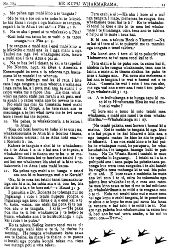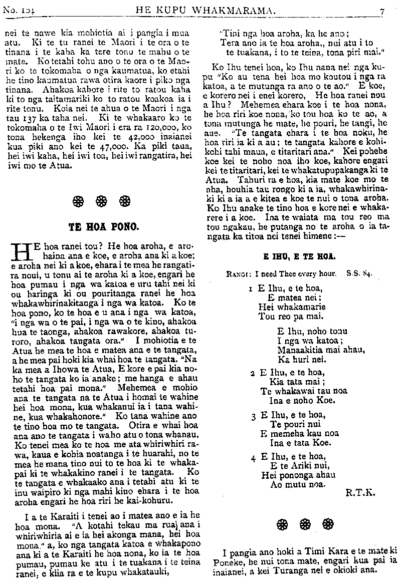 HE KUPU WHAKAMARAMA. nei te nawe kia mohiotia ai i pangia i mua atu. Ki te tu ranei te Maori i te ora o te tinana i te kaha ka tere tonu te mahu o te mate. Ko tetahi tohu ano o te ora o te Mao- ri ko te tokomaha o nga kaumatua, ko etahi he tino kaumatua rawa otira kaore i piko nga tinana. Ahakoa kahore i rite to ratou kaha ki to nga taitamariki ko to ratou koakoa ia i rite tonu. Koia nei te ahua o te Maori i nga tau 137 ka taha nei. Ki te whakaaro ko te tokomaha o te Iwi Maori i era ra 120, 000, ko tona hekenga iho kei te 42,000 inaianei kua piki ano kei te 47,000. Ka piki taua, hei iwi kaha, hei iwi toa, hei iwi rangatira, hei iwi mo te Atua. TE HOA PONO. HE hoa ranei tou? He hoa aroha, e aro- haina ana e koe, e aroha ana ki a koe; e aroha nei ki a koe, ehara i te mea he rangati- ra noui, u tonu ai te aroha ki a koe, engari he hoa pumau i nga wa katoa e uru tahi nei ki ou haringa ki ou pouritanga ranei he hoa whakawhirinakitanga i nga wa katoa. Ko te hoa pono, ko te hoa e u ana i nga wa katoa, "i nga wa o te pai, i nga wa o te kino, ahakoa hua te taonga, ahakoa rawakore, ahakoa tu- roro, ahakoa tangata ora." I mohiotia e te Atua he mea te hoa e matea ana e te tangata, a he mea pai hoki kia whai hoa te tangata. "Na ka mea a Ihowa te Atua, E kore e pai kia no- ho te tangata ko ia anake; me hanga e ahau tetahi hoa pai mona." Mehemea e mohio ana te tangata na te Atua i homai te wahine hei hoa mona, kua whakanui ia i tana wahi- ne, kua whakahonore." Ko tana wahine ano te tino hoa mo te tangata. Otira e whai hoa ana ano te tangata i waho atu o tona whanau. Ko tenei mea ko te hoa me ata whiriwhiri ra- wa, kaua e kohia noatanga i te huarahi, no te mea he mana tino nui to te hoa ki te whaka- pai ki te whakakino ranei i te tangata. Ko te tangata e whakaako ana i tetahi atu ki te inu waipiro ki nga mahi kino ehara i te hoa aroha engari he hoa riri he kai kohuru. I a te Karaiti i tenei ao i matea ano e ia he hoa mona. "A kotahi tekau ma rua ana i whiriwhiria ai e ia hei akonga mana, hei hoa mona," a, ko nga tangata katoa e whakapono ana ki a te Karaiti he hoa nona, ko ia te hoa pumau, pumau ke atu i te tuakana i te teina ranei, e kiia ra e te kupu whakatauki, "Tini nga hoa aroha, ka he ano; Tera ano ia te hoa aroha, nui atu i to te tuakana, i to te teina, tona piri mai." Ko Ihu tenei hoa, ko Ihu nana nei nga ku- pu "Ko au tena hei hoa mo koutou i nga ra katoa, a te mutunga ra ano o te ao." E koe, e korero nei i enei korero, He hoa. ranei nou a Ihu? Mehemea ehara koe i te hoa nona, he hoa riri koe nona, "ko tou hoa ko te ao, a tona mutunga he mate, he pouri, he tangi, he aue. "Te tangata ehara i te hoa noku, he hoa riri ia ki a au; te tangata kahore e kohi- kohi tahi maua, e titaritari ana." Kei pohehe koe kei te noho noa iho koe, kahore engari kei te titaritari, kei te whakatupupakanga ki te Atua. Tahuri ra e hoa, kia mate koe mo te aha, houhia tau rongo ki a ia, whakawhirina- ki ki a ia a e kitea e koe te nui o tona aroha. Ko Ihu anake te tino hoa e kore nei e whaka- rere i a koe. Ina te waiata ma tou reo ma tou ngakau, he putanga no te aroha o ia ta- ngata ka titoa nei tenei himene: E IHU, E TE HOA. RANGI I need Thee every hour. 5.5. 84. 1 E Ihu, e te hoa, E matea nei; Hei whakamarie Tou reo pa mai. E Ihu, noho tonu I nga wa katoa; Manaakitia mai ahau, Ka huri nei. 2 E Ihu, e te hoa, Kia tata mai; Te whakawai tau noa Ina e noho Koe. 3 E Ihu, e te hoa, Te pouri nui E memeha kau noa Ina e tata Koe. 4 E Ihu, e te hoa, E te Ariki nui, Hei pononga ahau Ao mutu noa. R.T.K. I pangia ano hoki a Timi Kara e te mate ki Poneke, he nui tona mate, engari kua pai ia inaianei, a kei Turanga nei e okioki ana.
