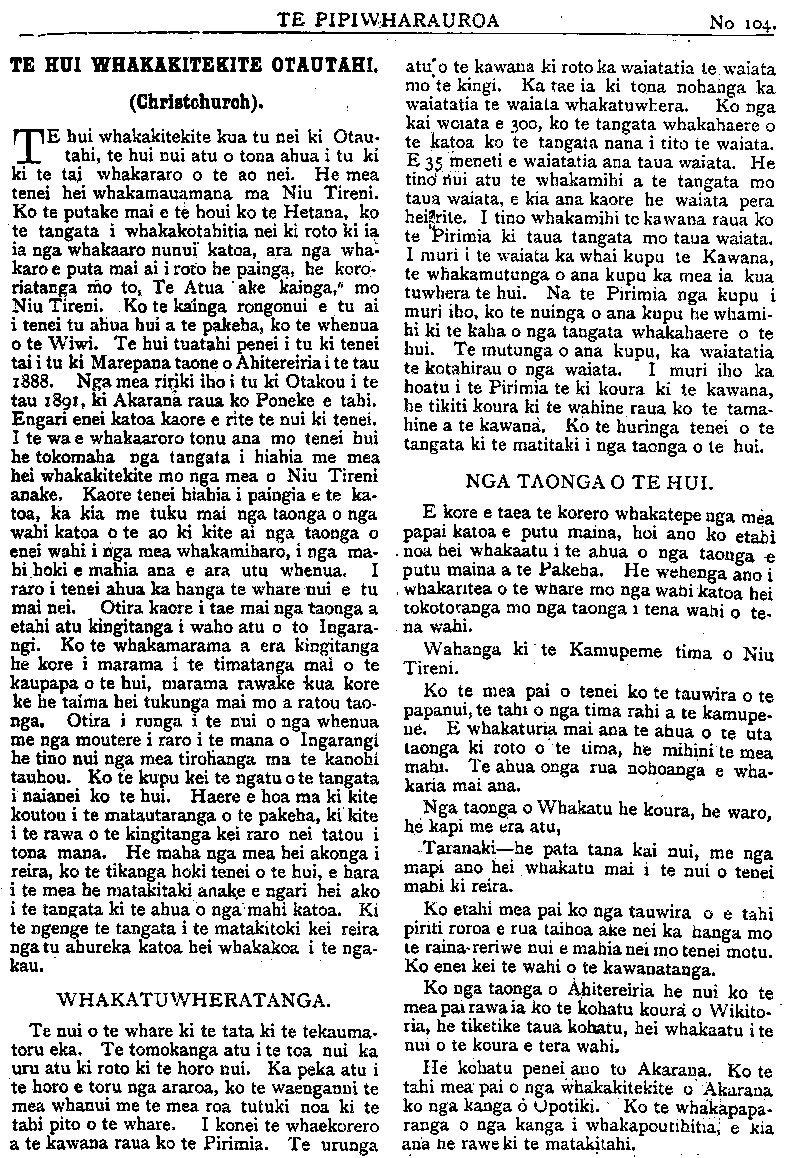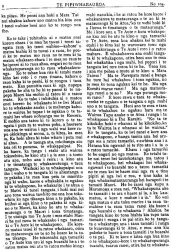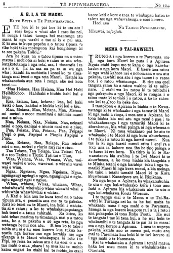 TE PIPIWHARAUROA A, E, I, A TE MAORI. Ki TE ETITA O TE PIPIWHARAUROA. E hoa ki te pai koe ki te uta atu i enei kupu e whai ake i raro iho nei, ki runga i tatau taonga hei mauranga atu mana ki nga waahi e tau ai ia e pai ana. E ki ana te kupu pepeha a o tatou tipuna "e tika hoki taku mokopuna kai hongihongi ki te reo pakeha Taikiu." Ara he kura na o tatou tipuna na o tatou matua i mohiotia ai hoki e ratau te ata wha- katakototanga i nga reta, ara, i timatatia i te a e i o u, ha ka ma na pa ra ta wa nga wha; katahi ka mohiotia i konei ko te tima- tanga mai tenei o nga reta Maori. Katahi ka whakanohoia aua reta i runga ake nei koia tenei:— "Haa Heiana, Haa Heiana, Haa Hei Hahi Heihihiohoo. Hanihani e hiuhiu hahi hai e hiuu. Kaa, keiana, kaa, keiana; kaa, kei haki keiki o koo, kakikai e kiukiu kaki kai e kiu. Maa, Meiana, Maa, Meiana. Maa, Mei Meima- mi meimi o moo: mamimai e miumiu manu mai e miuu. Naa, Neiana, Naa, Neiana, Naa, neinani neini o noo, naninai e mumu nani nai e niuu. Paa, Peiana, Paa, Peiana, Paa, Peipapi PeiPeipi o poo. Papipai e Piupiu Papipai e Piuu. Raa, Reiana, Raa, Reiana, Raa reirari reiri o roo, rarirai e riuriu rari rai e riuu. Taa Teiana, Taa Teiana, Taa Tekau Tei- ti o too00 Tatitai e Tiutiu Tati tai e Tiuu, Waa, Weiana, Waa, Weiana, Waa, wei- wawi weiwi o woo, wawiwai e wiuwiu wawi wai e wiuu. Ngaa, Ngeiana, Ngaa, Ngeiana, Ngaa, ngeingaugi ngeingi o ngoo, ngangingai e ngiu ngiu ngangi ngai e ngiuu. Whaa, whiana, Whaa, whaiana. Whaa, whaiwhawhi wheiwhi o whoo whawhi whai e whiuwhiu whawhiwhai e whiuu. A Kati e kiia ana he kura tenei na o tatou tipuna ara, e peneitia ana me ta te pakeha. Kati ko tenei na te Maori, ina hoki i waiata- tia ai e ratau; a ko te whakakaupapatanga hoki tenei o a tatau tuhituhi. Ka kitea, ko tahi tekaumarima te timatanga mai o a tatou reta, ko a te pakeha e 26 nga reta, ko nga wehenga he nui noa atu. E hoa ko te take i tuhia atu ai e au enei korero kua tukua ka- toatia nga korero me nga karakia me nga tikanga a te Maori whakapapa ki roto i te Pipi, no reira ka tukua atu e au enei o a ra- tau mahi o mua ehara i te mea kai te mohio katoa engari ko etahi kai te mohio ko etahi kaore kati e kore e taea te whakapau katoa te taima mo nga wehewehenga e enei korero. Heoi ano Na TAMATI PEWHAIRANGI Hikuwai, 10/25/06. MEMA O TAIRAWHITI. IRUNGA i nga korero o te Paremata mo nga kura Maori ka puta i a Apirana Ngata etahi kupu mo te kaha o nga kaiwha- kaako o nga kura Maori. E haere ana ratou ki nga wahi kahore nei e nohoia ana e era atu pakeha, tawhiti noa atu i nga taone i o ratou hoa i o ratou whanaunga. E rite ana enei tangata ratou ko a ratou wahine ki te mihi- nare. I etahi wa ko ratou ki te tuhituhi i nga pukapuka a nga Maori, ki te rongoa i o ratou mate ki te tiaki i a ratou, a ko to ratou utu kei te £100 ka heke iho. I tautokona e Apirana te hiahia o te Kawa- natanga ki te whakaako i nga tamariki Maori ki nga mahi a ringa, i mea ano a Apirana ko tona hiahia kia nui atu nga moni e pau i te whakaakoranga i nga tamariki Maori ki te ahuwhenua, kia whai painga ai nga whenua o te Maori. Ki tana whakaaro pai ke atu te whakaako i te Maori ki nga kura ahuwhenua i te tuku i a ratou ki nga kareti nunui. Kua tae ia ki nga kareti nunui otira i enei ra e mea ana ia kahore noa iho he tino painga o te haere ki era kura. Ka titiro ia ki te Ka- wanatanga kia awhina i te Iwi Maori ki te ahuwhenua, a ko tona hiahia kia tangohia e te Minita tetahi o nga karahipi tuku i nga ta- mariki Maori ki nga kura nunui, a kia meinga hei tuku i tetahi tamaiti Maori ki te Kura ahuwhenua i Kanatipere ara ki Rinikana. Na nga kupu a Apirana ka whakanukuhia te utu o nga kaiwhakaako kura i tono ano hoki a Apirana kia whakanuia ake te utu o nga kaiwhakawa Kooti Whenua. I te taenga mai o te Mema o te Tai-Ra- whiti ki Turanga nei ka tu he hui maha he whakaatu nana i nga mahi o te Paremata, haunga ia nga korero kua poto ra i a ia i roto i ana pukapuka ki tona Rohe Pooti. He nui te tangata i tae ki tana hui, a he nui hoki te whakamihi o te tangata ki te pai ki te mara- ma o nga korero a Apirana. I mea te nupepa pakeha katahi ano te mema pai, mutu ana mai te Paremata kua hoki ki te iwi korero ai i nga mahi o te Paremata. Kei te whakataka a Apirana i tetahi matua haka hei mau mana ki te whakakitekite i Otautahi.