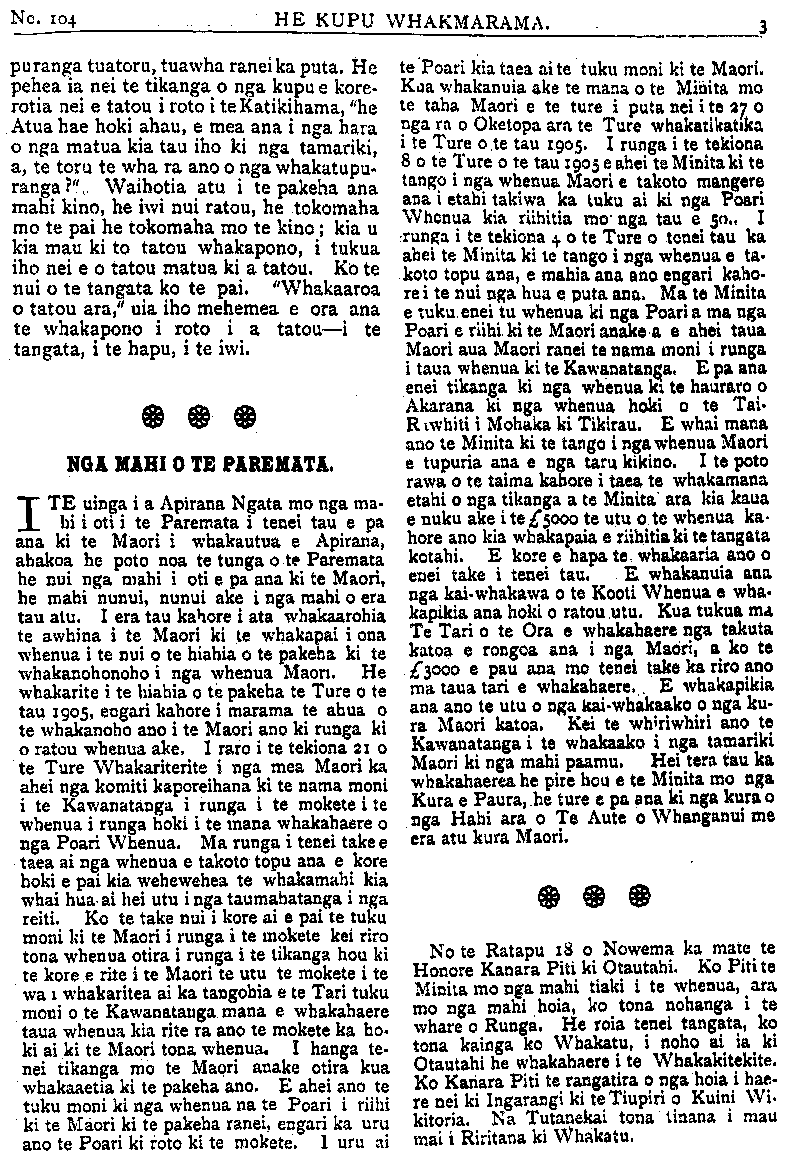 HE KUPU WHAKAMARAMA. puranga tuatoru, tuawha ranei ka puta. He pehea ia nei te tikanga o nga kupu e kore- rotia nei e tatou i roto i te Katikihama, he Atua hae hoki ahau, e mea ana i nga hara o nga matua kia tau iho ki nga tamariki, a, te toru te wha ra ano o nga whakatupu- ranga?",. Waihotia atu i te pakeha ana mahi kino, he iwi nui ratou, he tokomaha mo te pai he tokomaha mo te kino; kia u kia mau ki to tatou whakapono, i tukua iho nei e o tatou matua ki a tatou. Ko te nui o te tangata ko te pai. "Whakaaroa o tatou ara," uia iho mehemea e ora ana te whakapono i roto i a tatou—i te tangata, i te hapu, i te iwi. NGA MAHI O TE PAREMATA. ITE uinga i a Apirana Ngata mo nga ma- hi i oti i te Paremata i tenei tau e pa ana ki te Maori i whakautua e Apirana, ahakoa he poto noa te tunga o te Paremata he nui nga mahi i oti e pa ana ki te Maori, he mahi nunui, nunui ake i nga mahi o era tau atu. I era tau kahore i ata whakaarohia te awhina i te Maori ki te whakapai i ona whenua i te nui o te hiahia o te pakeha ki te whakanohonoho i nga whenua Maori. He whakarite i te hiahia o te pakeha te Ture o te tau 19051 engari kahore i marama te ahua o te whakanoho ano i te Maori ano ki runga ki o ratou whenua ake. I raro i te tekiona 21 o te Ture Whakariterite i nga mea Maori ka ahei nga komiti kaporeihana ki te nama moni i te Kawanatanga i runga i te mokete i te whenua i runga hoki i te mana whakahaere o nga Poari Whenua. Ma runga i tenei take e taea ai nga whenua e takoto topu ana e kore hoki e pai kia wehewehea te whakamahi kia whai hua ai hei utu i nga taumahatanga i nga reiti. Ko te take nui i kore ai e pai te tuku moni ki te Maori i runga i te mokete kei riro tona whenua otira i runga i te tikanga hou ki te kore e rite i te Maori te utu te mokete i te wa i whakaritea ai ka tangohia e te Tari tuku moni o te Kawanatanga mana e whakahaere taua whenua kia rite ra ano te mokete ka ho ki ai ki te Maori tona whenua. I hanga te- nei tikanga mo te Maori anake otira kua whakaaetia ki te pakeha ano. E ahei ano te tuku moni ki nga whenua na te Poari i nihi ki te Maori ki te pakeha ranei, engari ka uru ano te Poari ki roto ki te mokete. I uru ai te Poari kia taea ai te tuku moni ki te Maori. Kua whakanuia ake te mana o te Minita mo te taha Maori e te ture i puta nei i te 27 o nga ra o Oketopa ara te Ture whakatikatika i te Ture o te tau 1905. I runga i te tekiona 8 o te Ture o te tau 1905 e ahei te Minita ki te tango i nga whenua Maori e takoto mangere ana i etahi takiwa ka tuku ai ki nga Poari Whenua kia riihitia mo nga tau e 550.. I runga i te tekiona 4 o te Ture o tenei tau ka ahei te Minita ki te tango i nga whenua e ta- koto topu ana, e mahia ana ano engari kaho re i te nui nga hua e puta ana. Ma te Minita e tuku enei tu whenua ki nga Poari a ma nga Poari e nihi ki te Maori anake a e ahei taua Maori aua Maori ranei te nama moni i runga i taua whenua ki te Kawanatanga. E pa ana enei tikanga ki nga whenua ki te hauraro o Akarana ki nga whenua hoki o te Tai Rawhiti i Mohaka ki Tikirau. E whai mana ano te Minita ki te tango i nga whenua Maori e tupuria ana e nga taru kikino. I te poto rawa o te taima kahore i taea te whakamana etahi o nga tikanga a te Minita ara kia kaua e nuku ake i te £5000 te utu o te whenua ka- hore ano kia whakapaia e rihiitia ki te tangata kotahi. E kore e hapa te whakaaria ano o enei take i tenei tau. E whakanuia ana nga kai whakawa o te Kooti Whenua e wha- kapikia ana hoki o ratou utu Kua tukua ma Te Tari o te Ora e whakahaere nga takuta katoa e rongoa ana i nga Maori, a ko te £3000 e pau ana mo tenei take ka riro ano ma taua tari e whakahaere. E whakapikia ana ano te utu o nga kaiwhakaako o nga ku- ra Maori katoa. Kei te whiriwhiri ano te Kawanatanga i te whakaako i nga tamariki Maori ki nga mahi paamu. Hei tera tau ka whakahaerea he pire hou e te Minita mo nga Kura e Paura, he ture e pa ana ki nga kura o nga Hahi ara o Te Aute o Whanganui me era atu kura Maori. No te Ratapu 18 o Nowema ka mate te Honore Kanara Piti ki Otautahi. Ko Piti te Minita mo nga mahi tiaki i te whenua, ara mo nga mahi hoia, ko tona nohanga i te whare o Runga. He roia tenei tangata, ko tona kainga ko Whakatu, i noho ai ia ki Otautahi he whakahaere i te Whakakitekite. Ko Kanara Piti te rangatira o nga hoia i hae- re nei ki Ingarangi ki te Tiupiri o Kuini Wi- kitoria. Na Tutanekai tona tinana i mau mai i Riritana ki Whakatu.