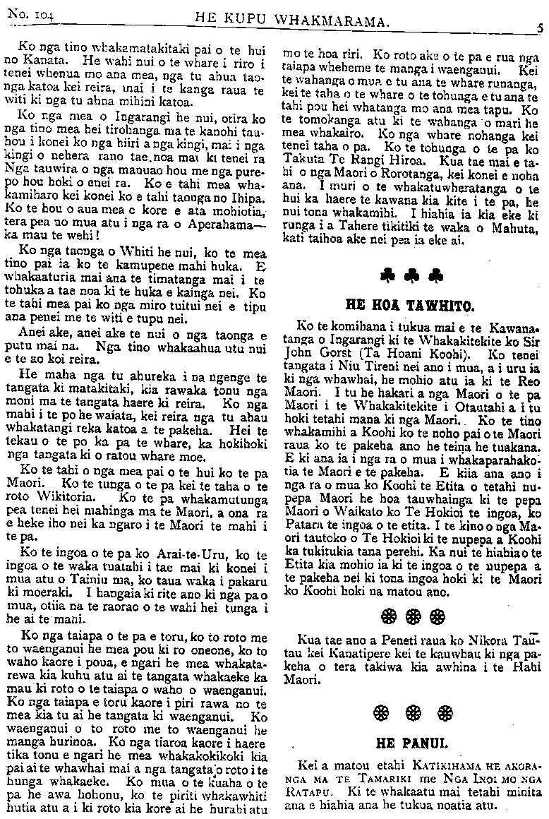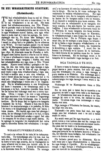 HE KUPU WHAKAMARAMA. Ko nga tino whakamatakitaki pai o te hui no Kanata. He wahi nui o te whare i riro i tenei whenua mo ana mea, nga tu ahua tao- nga katoa kei reira, mai i te kanga raua te witi ki nga tu ahua mihini katoa. Ko nga mea o Ingarangi he nui, otira ko nga tino mea hei tirohanga ma te kanohi tau- hou i konei ko nga Hiri a nga kingi, mai i nga kingi o nehera rano tae noa mai ki tenei ra Nga tauwira o nga manuao hou me nga pure- po hou hoki o enei ra. Ko e tahi mea wha- kamiharo kei konei ko e tahi taonga no Ihipa. Ko te hou o aua mea e kore e ata mohiotia, tera pea no mua atu i nga ra o Aperahama— ka mau te wehi! Ko nga taonga o Whiti he nui, ko te mea tino pai ia ko te kamupene mahi huka. E whakaaturia mai ana te timatanga mai i te tohuka a tae noa ki te huka e kainga nei. Ko te tahi mea pai ko nga miro tuitui nei e tipu ana penei me te witi e tupu nei. Anei ake, anei ake te nui o nga taonga e putu mai na. Nga tino whakaahua utu nui e te ao koi reira. He maha nga tu ahureka i na ngenge te tangata ki matakitaki, kia rawaka tonu nga moni ma te tangata haere ki reira. Ko nga mahi i te po he waiata, kei reira nga tu ahau whakatangi reka katoa a te pakeha. Hei te tekau o te po ka pa te whare, ka hokihoki nga tangata ki o ratou whare moe. Ko te tahi o nga mea pai o te hui ko te pa Maori. Ko te tunga o te pa kei te taha o te roto Wikitoria. Ko te pa whakamutunga pea tenei hei mahinga ma te Maori, a ona ra e heke iho nei ka ngaro i te Maori te mahi i tepa. Ko te ingoa o te pa ko Arai- te- Uru, ko te ingoa o te waka tuatahi i tae mai ki konei i mua atu o Tainiu ma, ko taua waka i pakaru ki moeraki. I hangaia ki rite ano ki nga pa o mua, otiia na te raorao o te wahi hei tunga i he ai te mahi. Ko nga taiapa o te pa e toru, ko to roto me to waenganui he mea pou ki ro oneone, ko to waho kaore i poua, e ngari he mea whakata- rewa kia kuhu atu ai te tangata whakaeke ka mau ki roto o te taiapa o waho o waenganui. Ko nga taiapa e toru kaore i piri rawa no te mea kia tu ai he tangata ki waenganui. Ko waenganui o to roto me to waenganui he manga hurinoa. Ko nga tiaroa kaore i haere tika tonu e ngari he mea whakakokikoki kia pai ai te whawhai mai a nga tangata o roto i te hunga whakaeke. Ko mua o te kuaha o te pa he awa hohonu, ko te piriti whakawhiti huia atu a i ki roto kia kore ai he hurahi atu mo te hoa riri. Ko roto ake o te pa e rua nga taiapa wheheme te manga i waenganui. Kei te wahanga o mua e tu ana te whare runanga, kei te taha o te whare o te tohunga e tu ana te tahi pou hei whatanga mo ana mea tapu. Ko te tomokanga atu ki te wahanga o mari he mea whakairo. Ko nga whare nohanga kei tenei taha o pa. Ko te tohunga o te pa ko Takuta Te Rangi Hiroa. Kua tae mai e ta- hi o nga Maori o Rorotanga, kei konei e noha ana. I muri o te whakatuwheratanga o te hui ka haere te kawana kia kite i te pa, he nui tona whakamihi. I hiahia ia kia eke ki runga i a Tahere tikitiki te waka o Mahuta, kati taihoa ake nei pea ia eke ai. HE HOA TAWHITO. Ko te komihana i tukua mai e te Kawana tanga o Ingarangi ki te Whakakitekite ko Sir John Gorst (Ta Hoani Koohi). Ko tenei tangata i Niu Tireni nei ano i mua, a i uru ia ki nga whawhai, he mohio atu ia ki te Reo Maori. I tu he hakari a nga Maori o te pa Maori i te Whakakitekite i Otautahi a itu hoki tetahi mana ki nga Maori. Ko te tino whakamihi a Koohi ko te noho pai o te Maori raua ko te pakeha ano he teina he tuakana. E ki ana ia i nga ra o mua i whakaparahako tia te Maori e te pakeha. E kiia ana ano i nga ra o mua ko Koohi te Etita o tetahi nu- pepa Maori he hoa tauwhainga ki te pepa Maori o Waikato ko Te Hokioi te ingoa, ko Patara te ingoa o te etita. I te kino o nga Ma ori tautoko o Te Hokioi ki te nupepa a Koohi ka tukitukia tana perehi. Ka nui te hiahia o te Etita kia mohio ia ki te ingoa o te nupepa a te pakeha nei ki tona ingoa hoki ki te Maori ko Koohi hoki na matou ano. Kua tae ano a Peneti raua ko Nikora Tau- tau kei Kanatipere kei te kauwhau ki nga pa keha o tera takiwa kia awhina i te Hahi Maori. HE PANUI. Kei a matou etahi KATIKIHAMA HE AKORA- NGA MA TE TAMARIKI me NGA INOI MO NGA RATAPU. Ki te whakaatu mai tetahi minita ana e hiahia ana he tukua noatia atu.