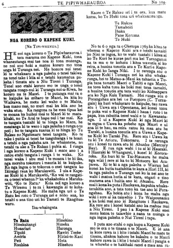TE PIPIWHARAUROA NGA KORERO O KAPENE KUKI. (Na TIPIWHENUA.) HE nui nga korero o Te Pipiwharauroa, i tera marama mo Kapene Kuki, tona whanautanga mai tae noa ki tona matenga, he nui ano hoki a matou korero mo tona unga ki Turanga nei. He honore nui tenei ki te whakaaro a nga pakeha o tenei takiwa na tenei take i kiia ai e tetahi kaumatua pa- keha i timata atu a Niu Tireni i Turanga. Tenei ano etahi korero mo te unga o tenei tangata rongo-nui ki Turanga-nui •a-Kiwa, he korero na te Maori. I te putanga mai ra o te kaipuke ka miharo te Maori, ka kiia ko Waikawa, he motu kei waho o te Mahia, kua manu mai, no muri mai ka kiia ano he waka atua. Ka rangona ra he mea tipua kei te moana ka huihui mai te Maori ki te mata- kitaki, no Te Arai te hapu nui i tae mai. Ko te tangata tuatahi ki te hinga ko Maro, he meatanga ki te wero i nga pakeha o runga o te poti; ko te tangata tuarua ki te hinga ko Te Rakau no Ngatimaru tenei tangata. Ko te take i puhia ai tenei he tangohanga i te hoari a tetahi o nga pakeha ara he whakatene, no tetahi ra ake a Te Rakau i puhia ai. I runga i nga korero a Kapene Kuki i mate ano i a ratou etahi tangata i runga i te waka. Ko tenei waka i ahu mai i te moana i te hi ika, nga morehu tokotoru i mauria ki te kaipuke. Ko nga ingoa o te tokorua o enei tangata ko Ikirangi raua ko Marukawiti. I uia e Kape- ne Kuki ki a Marukawiti, "Ko wai te rangati- ra o tenei whenua?" ka whakahokia e Maruka- witi, "Ko te Ratu." Koia nei nga korero a Te Wiremu i te ra i kawangia ai te koha- tu o Kapene Kuki. He maha nga uri o Te Ratu kei roto o Turanga nei e noho ana, ko tetahi o ana tino uri ko Tamati te Rangitua- waru. Ika •whaingata Te Ratu Hinekaitangi Huaariari Tipoki. Amiria Peti Rauhina ? Hinekino Hineka Haronga Rawiri Teeke Hirini te- Kani Heta Hinehou Kaore o Te Rakau uri i te ora, kua mate katoa, ko Te Huki tona uri whakamutunga. Te Rakau Tamahoki Ihaka Pane Korama Te Huki No te 6 o nga ra o Oketopa 1769 ka kitea te whenua e Kapene Kuki ara e tetahi tamaiti ko Niki te ingoa, ko te wahi tuatahi i kitea ai ko Te Kuri he kurae pari ma kei Turanganui na te ma o te kohatu i kitea wawetia ai ko reira, a huaina tonutia atu a Te Kuri e Kape- ne Kuki ko Ianga Niki. I te rerenga atu o Kapene Kuki i Turanga nei ka ahu whaka- runga, hei te Matau-a-maui ka tahaetia a Tu- pia tana tamaiti Maori o Tahiti e nga Maori, na tona kaha tonu ka hoki mai taua tamaiti, a huaina tonutia atu tera wahi ko Kidnappers ara ko Nga Kaia Tamaiti. Hei runga atu o Porangahau ara hei e Poroporo (C. Turna- gain) ka huri whakararo te kaipuke, tau rawa atu i Uawa ara i Opoutama, kei konei tonu te poka wai o Kapene Kuki i haua i roto i te papa, kua rahuitia tenei wahi e te Kawanata- nga. I ui a Kapene Kuki ki nga Maori ki te ingoa o Uawa ka pohehe nga Maori e ui ana ki te hau, na reira ratou ka mea atu he Taraki, a huaina tonutia atu a Uawa e Kape- ne Kuki ko Taraki Pei. Rere atu i Uawa ka tu ki Te Ariuru, Tokomaru. I te rerenga atu i konei tu rawa atu ki Ahuahu (Mercury Bay). E rua nga wahi i tu ai ki Hauraki. I Hauraki ki Whangarei, i konei ki Korora- reka. Ka huri ki te Tai Hauauru he maha nga wiki i rere ai ka tu ki Motuoru kei Ara- pawa. Ki te ki a nga pakeha o Wairau hei konei ka hutia tuatahitia te kara a Hori III, ki ta nga pakeha o Turanga nei ko ia nei ano te wahi i matua hutia ai te kara, engari e tino marama ana i nuitia ano ki Ahuahu. Rere mai i kona ka puta i Raukawa, ka puhia whaka- terakitia ano, a tata tonu ka tae ano ki Pora- ngahau. Ka hokia atu i kona he maha nga wiki i rere ai ka taiawhio i Te Waipounamu a ka hoki mai ano ki Rangitoto i Raukawa. Ka rere atu i konei katahi ano ka mahue mai a Niu Tireni. I pau i a Kapene Kuki enei motu katoa te taiawhio a nana te nuinga o nga ingoa pakeha o Nui Tireni i tapa. I puta ano etahi o nga kupu a Kapene Kuki mo te ora o te tinana o te Maori. E ki ana ia kore rawa ia i kite i tetahi Maori he mate te tinana, ahakoa kahore he kakahu o te Maori kahore rawa ia i kite i tetahi Maori i pangia e te whewhe e te hakihaki ranei e mau ana ra-