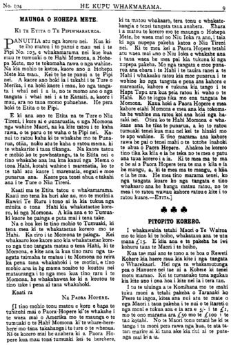 No. 104 HE KUPU WHAKAMARAMA. 9 MAUNGA O HOHEPA METE. Ki TE ETITA O TE PIPIWHARAUROA. PANUITIA atu nga korero nei. Kua ki- te iho matou i to panui e mau nei i te Pipi No. 103, e whakamarama nei koe kua mau te tumuaki o te Hahi Momona, a Hohe- pa Mete, mo te tokomaha rawa o nga wahine. Na kia mohio te katoa, kaore ano a Hohepa Mete kia mau. Kei te he te panui a te Pipi nei. A kaore ano hoki ia i takahi i te Ture o Merika, i na hoki kaore i mau, ko nga tanga- ta i whai nei i a ia, no te momo ano o nga tangata i whai nei i a te Karaiti, a, kaore i mau, ara no taua momo puhaehae. He pera hoki te Etita o te Pipi. E ki ana ano te Etita na te Ture o Niu •Tireni, i kore ai e punaruatia, e nga Momona nga wahine Maori, na ka kite tatou i te kaha rawa, o te paru o te waha o te Pipi nei. Ka- nui to ratou kaha ki te whakahe mo te Puna- rua, otiia, nuku atu te kaha o ratou mema, ki te whakarite i taua tikanga. Na kaore tatou e mohio ko te pewheatanga, ta te Etita nei e tino whakahe ana ina koa kanu i nga Mema o tona Hahi, kotahi wahine i marenatia, ko te te tahi atu kaore i marenatia, engari e moe punarua ana. Kaore pea tenei ahua e takahi ana i te Ture o Niu Tireni. Kaati ma te Etita tatou e whakamarama. Kaati mo tena ka huri ake au, mo te motini a Rawiri Te Ruru i tono ai ia kia tukua nga minita o tona Hahi kia whakataetae kore- ro, ki nga Momona. A kiia ana e to Tumua- ki kaore he painga e puta mai i tena take. Na e hoa kei te tino mohio to Tumuaki, ki tena mea ki te whakataetae korero mo te Hahi. Ka riro i te Momona te painga. Kei whakaaro koe kaore ano kia whakataetae kore- ro nga tino tangata matau o tena Hahi, ki te Momona, e kite ana ia kua tino raru nga ta- ngata taimaha te matau i te Momona no reira ka pena tana whakahoki i te motini, e tino mohio ana ia he mama noaiho to koutou nei matauranga i to nga mea kua tino raru i te Momona, he whakahawea ke ki a koutou te tino take i pena ai tana whakahoki. Kaati ra Na PAORA HOPERE. I tino mohio tonu matou e kore e hapa te tuhituhi mai o Paora Hopere ki te whakahe i te waea mai o Amerika mo te maunga o te tumuaki o te Hahi Momona ki te whare-here here mo tana takahanga i te ture o te whenua. Ki te korero -mai he-anahera ki a Paora Ho- pere kua mau tona tumuaki kei te herehere, ki ta matou whakaaro, tera tonu e whakate- kangia e tenei tangata taua anahera. Ehara i a matou te korero mo te maunga o Hohepa Mete, he waea mai no Niu Ioka ra ano, i taia ki nga nupepa pakeha katoa o Niu Tireni nei. Ki te mea kei a Paora Hopere tetahi atu waea mai ano o Niu Ioka e whakahe ana i taua waea he mea pai kia tukuna ki nga nupepa pakeha. Mo nga tangata e moe puna- rua ana ehara i te Hahi i te tauira ranei a te Hahi i whakaako ratou kia moe punarua i te wahine ko nga tangata e pena ana kahore e marenatia, kahore e tukuna kia tango i te Hapa Tapu ara kua peia ratou ki waho o te Hahi. Ko te ingoa tika mo ena tangata he Momona. Kaua hoki a Paora Hopere e mea kahore etahi Momona e mea ana kia tokoma- ha he wahine ma ratou koi ana hoki nga ha- raki nei. Otira ko te Hahi Momona e wha- kaae ana he tika te punarua, a ko to ratou tumuaki tenei kua mau nei kei te hinaki mo te apo wahine. E tino marama ana kahore rawa he pai o tenei mahi o te totohe inahoki te ahua o Paora Hopere. Ahakoa he korero tino tika ka kiia e ia he teka no te mea e patu ana taua korero i a ia. Ki te mea ma te ma e he ai a Paora Hopere tera te ma e kiia e ia he mangu, a, ki te mea ma te mangu, e kiia e ia he ma. He mea tino marama tenei, ko nga tangata kuare ko nga tangata e tino whakaaro ana he hunga matau ratou, no te mea i to ratou wawau kahore ratou e kite i to ratou kuare.—ETITA.] PITOPITO KORERO. I whakawakia tetahi Maori o Te Wairoa mo te kino ki te hoiho, whakataua ana te utu mana £15. E kiia ana e te pakeha he iwi kohuru taua te Maori i te hoiho, Kua tae mai ano te tono a te hoa o Reweti Kohere kia haere raua kia kite i nga tangata o Wharekauri. Hei nga ra whakamutunga pea o Hanuere nei tae ai a Kohere ki tenei motu mamao. Kei te tumanako tona ngakau kia kite ano i ona hoa i kite nei ia i tera tau. I tu te muinga a te Komihana mo te mahi tuku moni a tetahi pakeha o Taranaki ko Peere te ingoa, kitea ana nui atu te mate o nga Maori i taua pakeha i te nui o te kareti o nga moni e tukua ana e ia ara e 5/ • i te £1 mo te ono marama ara £50 mo te £100 i te tau kotahi. No te Maori tonu tetahi he ki te tango i te moni pera rawa nga hua, te ata ta- tari marire ai ki tana ake kia nui ai te puta- nga mai ki a ia.