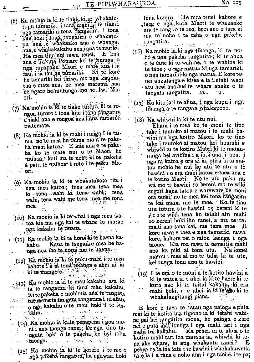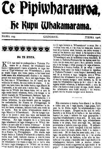 Te Pipiwharauroa He Kupu Whakamarama. NAMA 105. GISBORNE. TIEMA 1906. NA TE ETITA. KUA tae mai te pukapuka a Takuta Po- mare ki a matou he whakaatu mai nana i tona pouri i tana whakahe ki nga ko- rero a "Tipiwhenua" mo Wharekauri, i pata ai etahi kupu mo tona papa a he tono mai hoki nana kia whakapuaki matou i to matou pouri mo aua korero. Ko e nei nga kupu, "Ko te (he) nui o Wharekauri he iti rawa no te whenua ki etahi, he nui rawa ki etahi. I te- tahi wa tata tonu ka heke katoa nga Maori ki Taranaki, e 20 ano pea i noho iho. He tika- nga na te Whiti kia kaua tona iwi e uru ki nga mahi kooti whenua, heoi, i te tunga o te kooti tuatahi ki Wharekauri, kahore nga ta- ngata o te Whiti i haere ki te whakawa i o ratou whenua, tu ana kotahi ano te tangata he awhekaihe, ko Naera te Piringatapu te ingoa riro ana te nuinga o te whenua i a ra- tou ko tana whanau, kahore hoki ona wehi ki te kooti. Kei te noho whenuakore etahi o nga Maori o Wharekauri. No te tunga tua- rua o te- kooti i enei tau tata nei katahi ka whai-whakaaro, ka tu ki te whakawa o ratou whenua. Ko nga tangata ia e u tonu ana nga whakaaro ki nga tikanga a te Whiti ka- hore i te aro ake ki o ratou whenua." E mea ana a Takuta Pomare he whakakino enei ko- rero i te ingoa o tona papa, ko tona papa ho- ki a Naera te Piringatapu. He maha nga kupu kaha a Takuta Pomare ki a matou, mea rawa mai hoki kahore matou e rite ki tona papa te pai. Ko te tikanga o a matou kupu ne whakaatu i te mate o nga iwi e tuku ana ki raro i nga tikanga a te Whiti no te mea i whai matou kia pau katoa i a matou te tuhi- tuhi nga korero o Wharekauri o mua iho a mohoa noa nei, a i te mea he mea ata korero mai ki a matou enei korero, na reira matou i mea ai he korero nui tenei a he korero e tika ana kia whaiwahi ki nga korero whakapapa o Wharekauri ara ki te history o tera moutere. E ki ana a Takuta Pomare he he katoa enei ko- rero, no te mea me i pono kua piiratia noatia atu e te hunga i whai paanga ki nga whenua. Kahore ia o matou hiahia ki te whai i tenei korero, heoi ano i te mea i mamae te ngakau o Takuta Pomare i enei kupu i korerotia mai nei ki a matou e nga tangata ano o Wha rekauri, ka whakaatu matou, i to matou pou- ri mo ta matou tanga i enei korero, a» ki te mea he whakakino ingoa te ki i riro i te ta- ngata tetahi whenua a kahore etahi i uru ki roto i te kore o enei e pai ki nga mahi kooti, ka whakaatu ano hoki matou i to matou pouri mo ta matou tanga i enei korero. Kia marama o matou hou ehara i te Etita e tuku atu na i nga kaute, i nga pepa, heoi ano ta te Etita mahi he whakatakoto i nga korero o te pepa. Engari ra ka nui te whaka mihi o te Etita ki te kaha. o te kaiwhaka- haere i te mea i takoto he nga pupapuka i nga •kai •whakahaere o mua atu. E mea ana matou mea ake ka tino tika nga whakahaere katoa o te pepa, heoi ano nga he, kei nga poutapeta e takoto ana nga pepa. E miharo • ana matou ki etahi tangata e ki nei kahore • ratou e utu i te pepa ehara hoki i a ratou i i tono mai. Ki te mea he mea tuku atu i ru- nga i te aroha he aha hoki utu ai i te aroha i ki te aroha ki te kahore, a he aha te tau- toko ai i te pepa i tautoko nei i nga mahi o te i whakapono, kahore hoki a matou whare- whakarewa moni e ngawari ai nga mahi o te pepa? I mea tetahi tangata kahore i tuturu