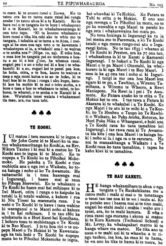 TE PIPIWHARAUROA te mate. ki te aroaro ranei o Ihowa. Ko to tatou ora ko to tatou mate ranei kei runga anake i to tatou ahua ki a te Karaiti. Ko te hara nui o te tangata ko te kore i whakapono ki a te Karaiti, ko te whakahaweatanga ki ona toto tapu. "Ki ta koutou whakaaro e kore ranei e tika kia rahi ake te whiu mo te tangata, i takahia ai te tama a te Atua, i mei- nga ai he mea noa nga toto o te kawenata i whakatapua ai ia, a whakaiti ana i te wairua o te aroha noa?" (Hipe. 10, 29). E toku hoa, e mea koe he tangata pai au mehemea e hoa- tu e au ki a koe £100, he whenua ranei, engari pea i a au e tohe nei ki a koe i te wha kamihi ki a au, engari kei te penei pea koe, he hoha, otira, e te hoa, kaore to wairua e taea e nga moni katoa o te ao te hoko, ki te huri koe ki te Atua i runga i aku kupu, kata- hi koe ka mohio ki te nui o toku aroha, a e kore e taea e koe te whakaaro te teitei, te ho- honu, te whanui, o te aroha o te Karaiti ki a koe. Waiatatia tenei waiata i whakamaori tia mau, ara, ma taua tahi. TE KOOHI. I UI matou i tera marama ki te ingoa o Sir John Gorst ki te Maori ko ta ma- tou whakamaoritanga ko Koohi, na Rev. Nikora Tautau i ki mai ki a matou ko Te Koohi ano te ingoa ki te Maori. Ko te nupepa a Te Koohi ko te Pihoihoi Moke- moke. He pakeha a Te Koohi e tino mohiotia ana e nga iwi o Waikato, ko to- na kainga i noho ai ko Te Awamutu. He taitamariki ia i tona haerenga mai i Ingarangi, i haere mai ai raua ko Pihopa Herewini. Ko te whakaaro o Te Koohi he haere mai hei mihinare ki te Iwi Maori, otira i runga o te kaipuke ka tutaki ia ki tetahi wahine, a kahore i roa ki Niu Tireni ka marenatia raua. I te wehi o Te Koohi ki te kawe i tana wahine ki waenganui o te Maori noho ai kahore ia i tu hei mihinare. I te tau 1861 ka whakaturia ia e Hori Kerei hei Komihana. I hohoro tonu te mohiotanga o Te Koohi ki te Reo Maori. I te tu hoa riri o te nu- pepa Maori o Te Hokioi ki te Kawanata- nga ka taia hoki e Te Koohi he nupepa mana ko te Pihoihoi Mokemoke te ingoa, hei whawhai ki Te Hokioi. Ko Patara te Tuhi te etita o te Hokioi. E ono ano nga rerenga o Te Pihoihoi ka mutu, no te po ka wawahia e nga Maori te perehi ko nga reta i whakarewaina hei mata pu. No tona hokinga ki Ingarangi ka tu ia hei mema mo te Paremata, a ko Te Koohi tetahi o nga mema rongo-nui atu o Inga- rangi katoa. No te tau 1835 i whanau ai a Te Koohi ki Preston, ara ka 71 ona tau, i whakaakona ia ki te Kareti o Kamureti Ingarangi. I te hakari a Te Koohi ki nga Maori o te pa Maori i Otautahi, ka whai- korero ia ki nga Maori i te Reo Maori. I mea ia ka 43 ona tau i noho ai ki Ingari- ngi. I tangi ia mo ona hoa Maori kua ngaro ki te po, a Tawhiao, a Wiremu Ta- mihana, a Wiremu te Wheoro, a Rewi Maniapoto. Na Rewi ia i pei i Te Awa- mutu. Ko Patara anake ko te etita o Te Hokioi kei te ora. I tae rawa a Patara ki Akarana ki te whakahei i a Te Koohi. Ko nga Maori i tu atu ki te mihi ki a Te Koo- hi, ko Te Heuheu o Taupo ko Te Rawhi- ti o Waikato, ko Puka Aroha, Rotorua, ko Hori Puke Hika o Whanganui, e hoki ana a Te Koohi raua ko tana tamahine kei Ingarangi, i tae rawa raua ki Te Awamu tu kia kite i ona hoa Maori i te kainga ho- ki i noho ai ia i nga ra o te raruraru. He nui te manaakitanga a Waikato i a Te Koohi raua ko tana tamahine, i tapea he kahu kiwi ki te tamahine. TE RAU KARETI. HE hanga whakamiharo te ahua o nga tangata o Te Raukahikatea me a ratou mahi i mahi ai mai o te timatanga o tenei tau tae noa ki te wa i mutu ai. Ko te putake ano i haerea mai ai te tino mahi, engari ko etahi mahi i mahia i waho atu i tenei, ara, ko te mahi kamura. E wha e rima ranei nga marama i akona ai matou ki te Kura Kamura (Technical School) e Mr. Levey, ka whakapakari matou ki te hanga whare ma matou. He tika ano te uaua o te mahi nei ki te whawha a te ri- nga tauhou, ina koa, ka mau ki te hama, he wa ano ka tika te hama ki te neera, he